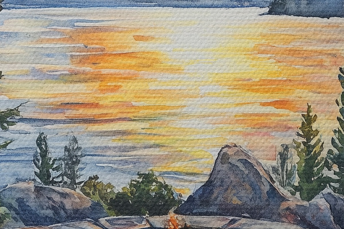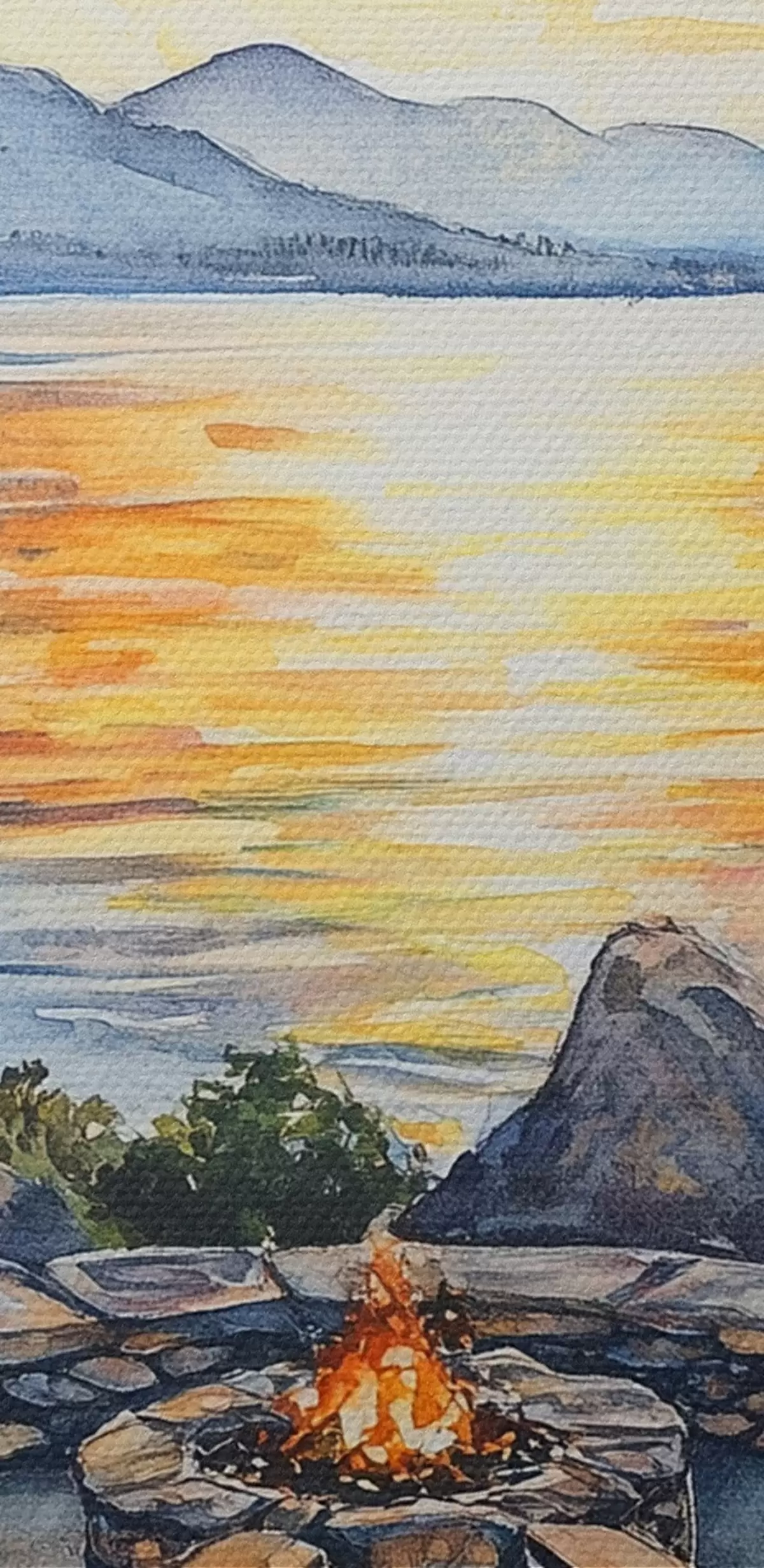 Foto Lago con montañas en la puesta de sol, viajar, acogedora chimenea, acuarela Nr r44018