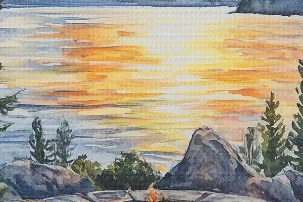 Foto Lago con montañas en la puesta de sol, viajar, acogedora chimenea, acuarela Nr r44018