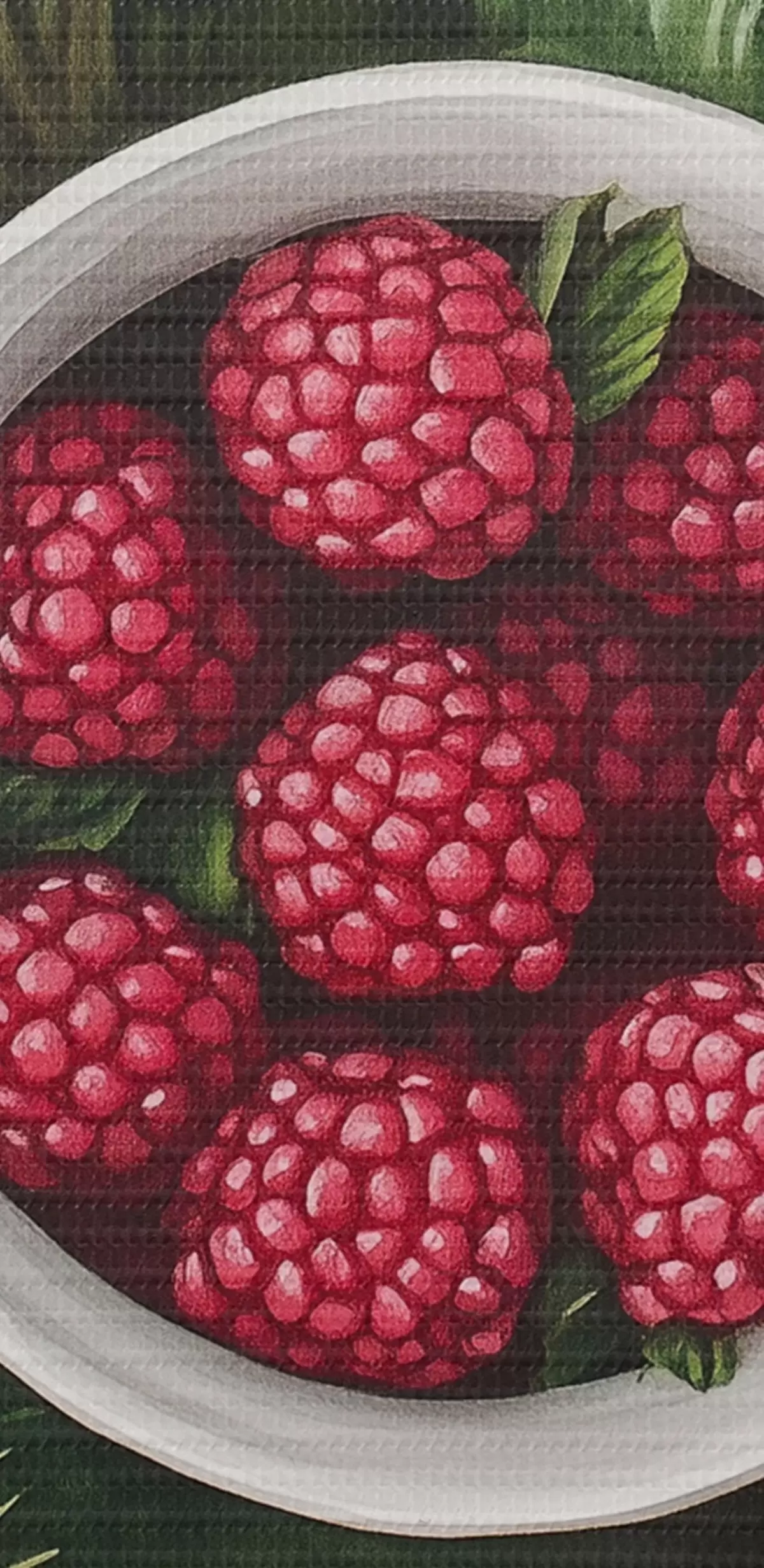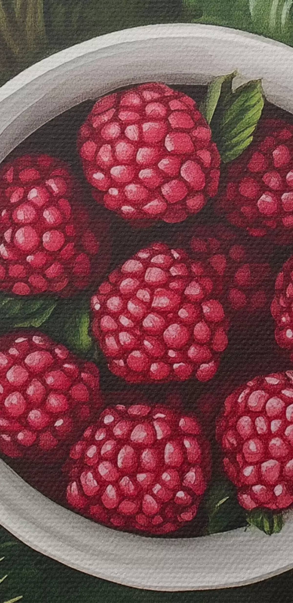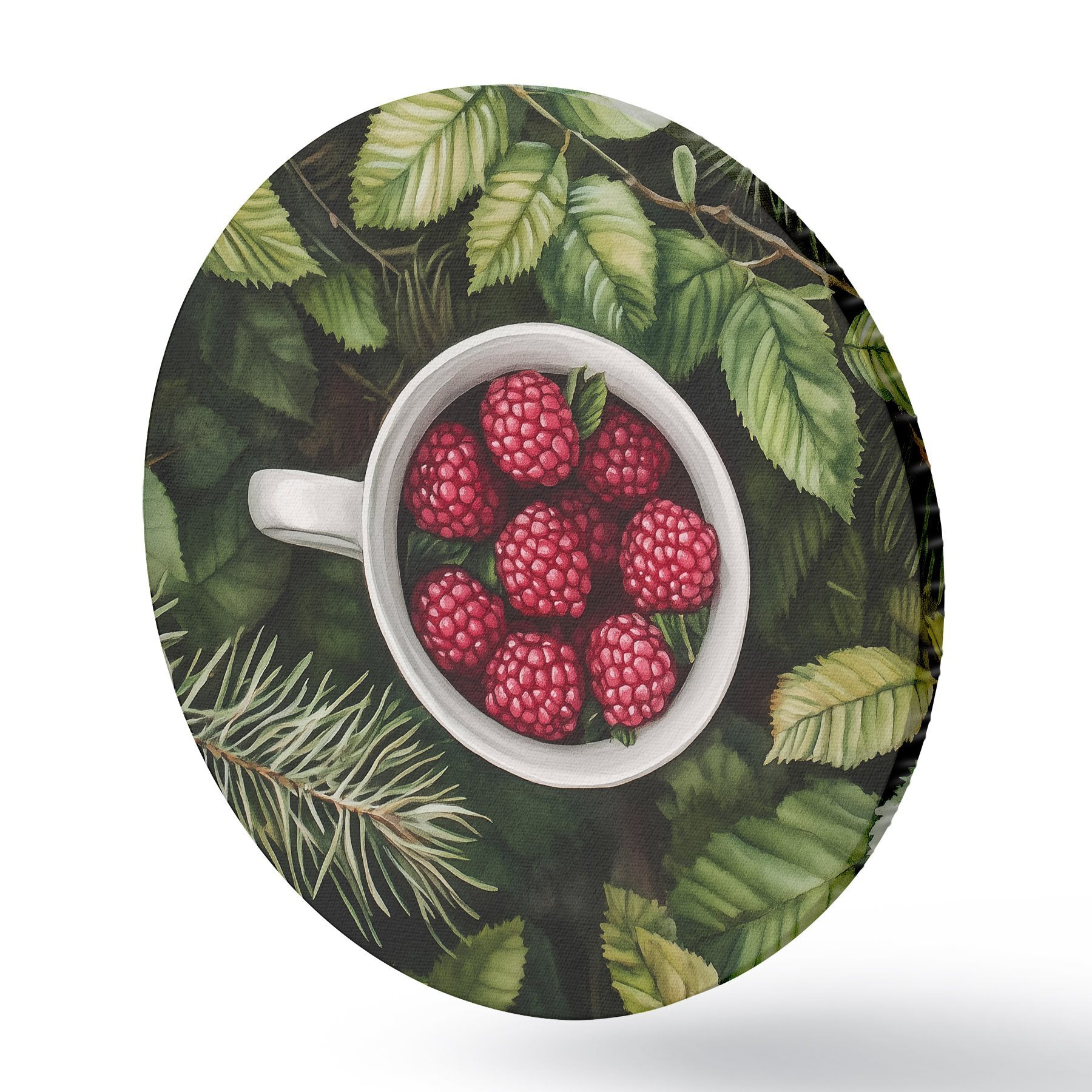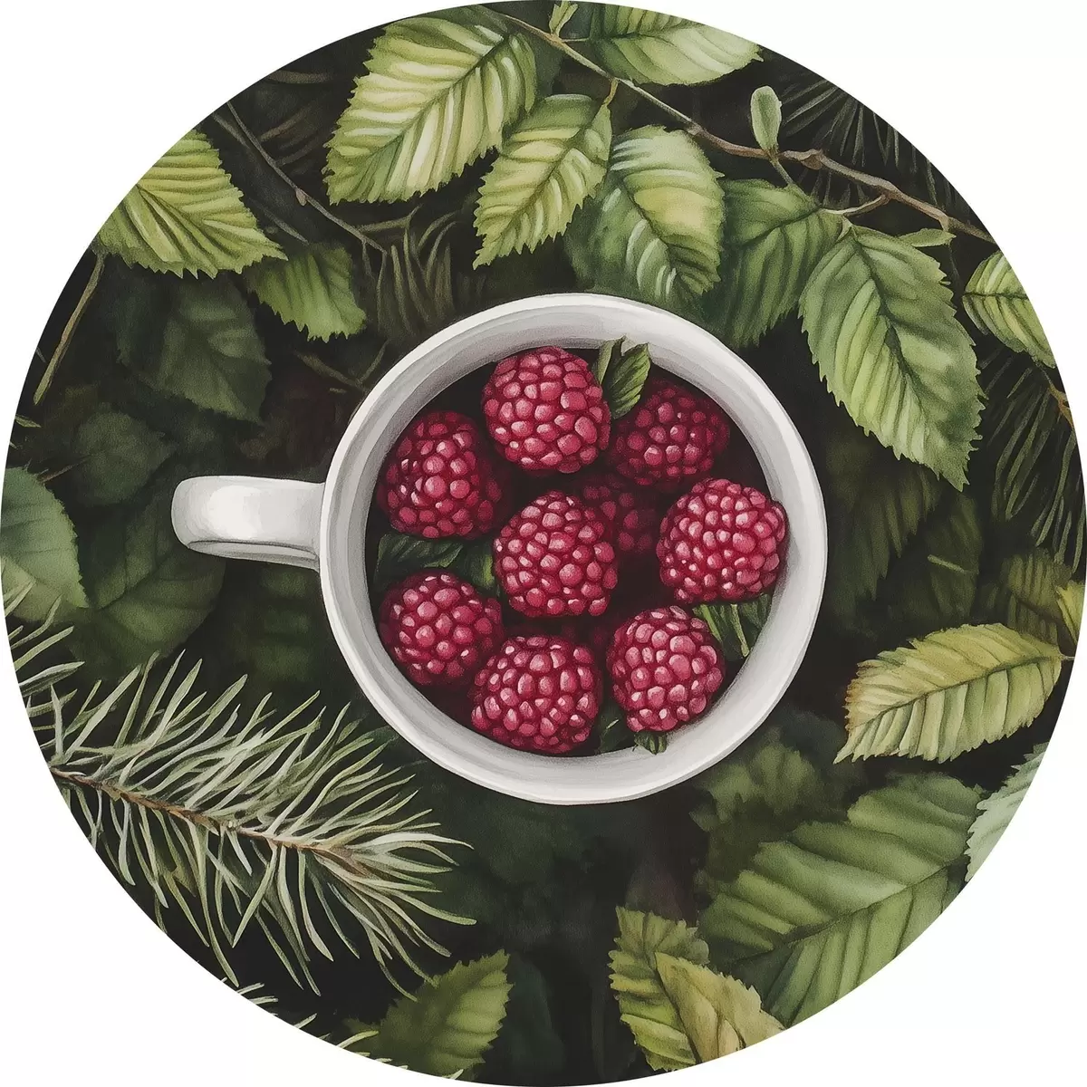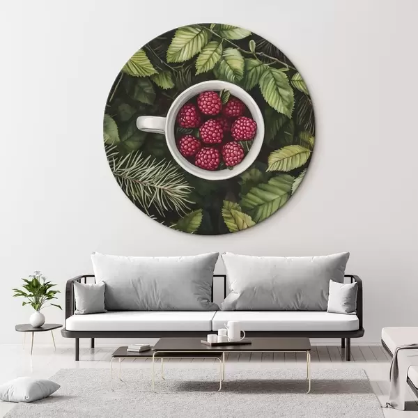 Cuadros redondos Taza de frambuesas en el bosque verde, naturaleza, estilo acuarela r44021