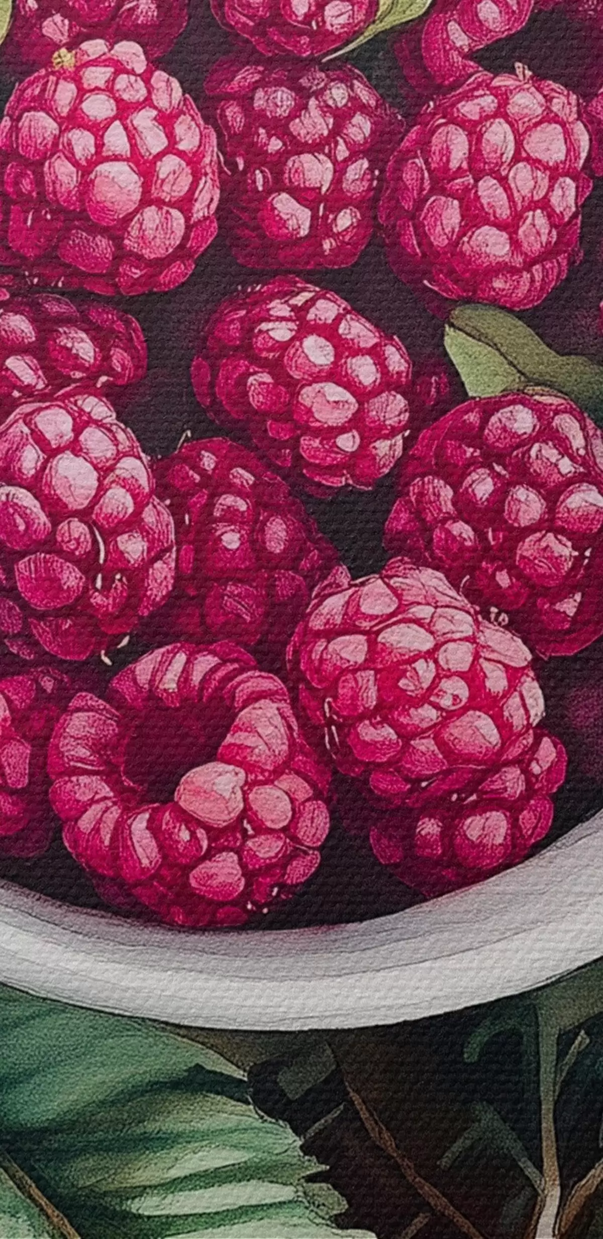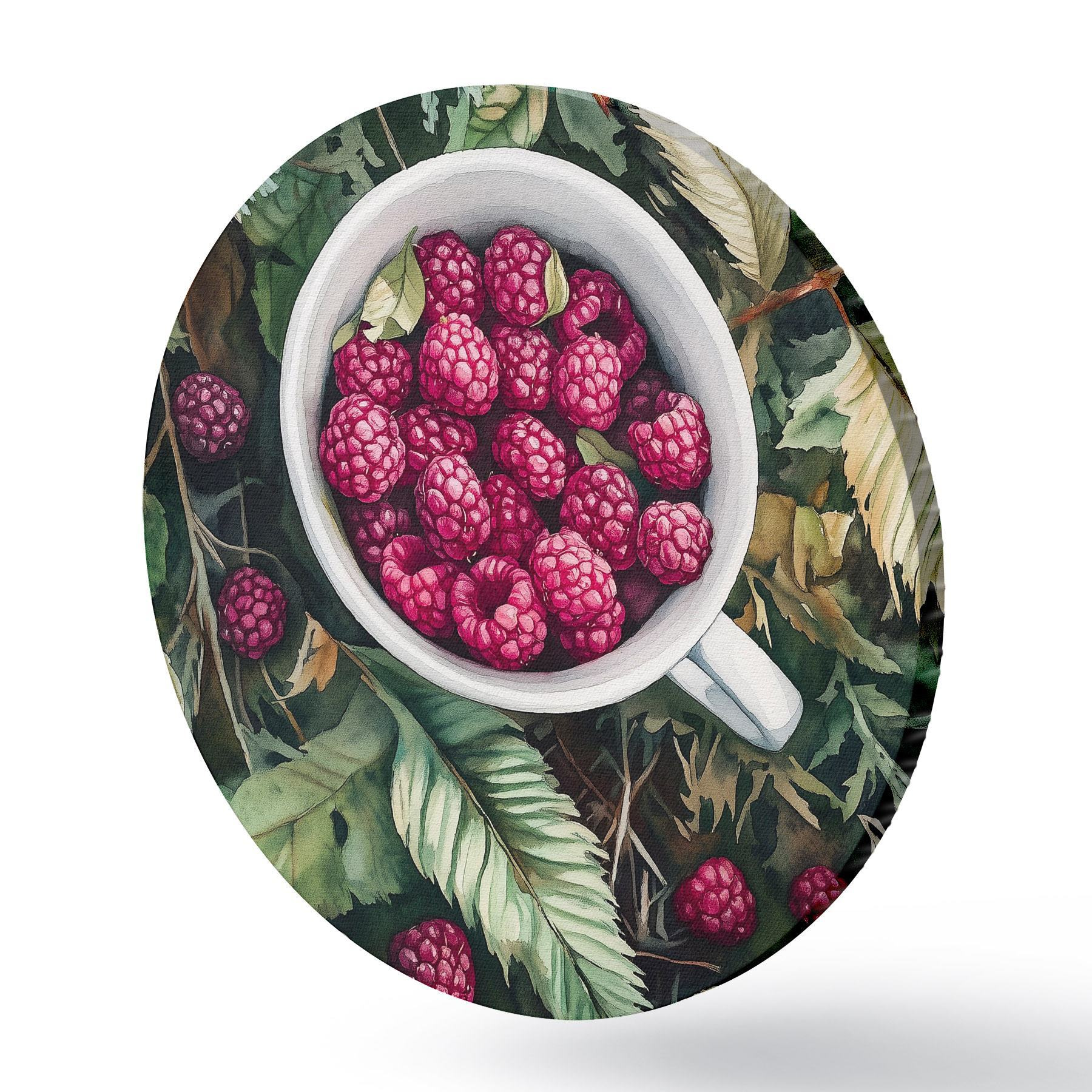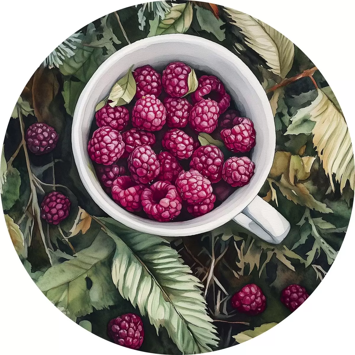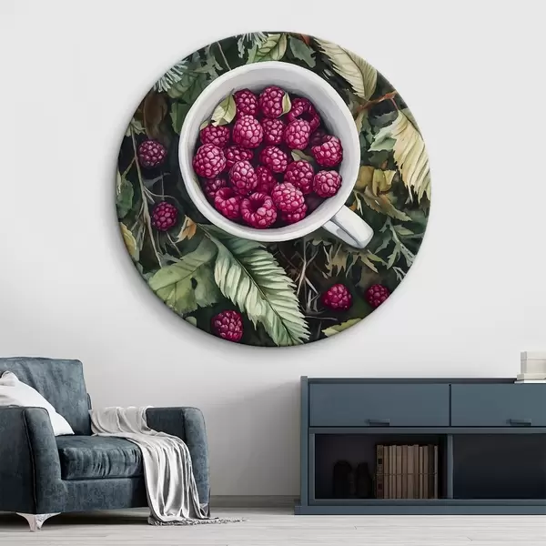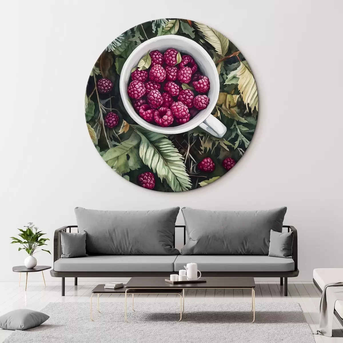 Cuadros redondos Frambuesas jugosas en el bosque, rústico, hojas, estilo acuarela r44023