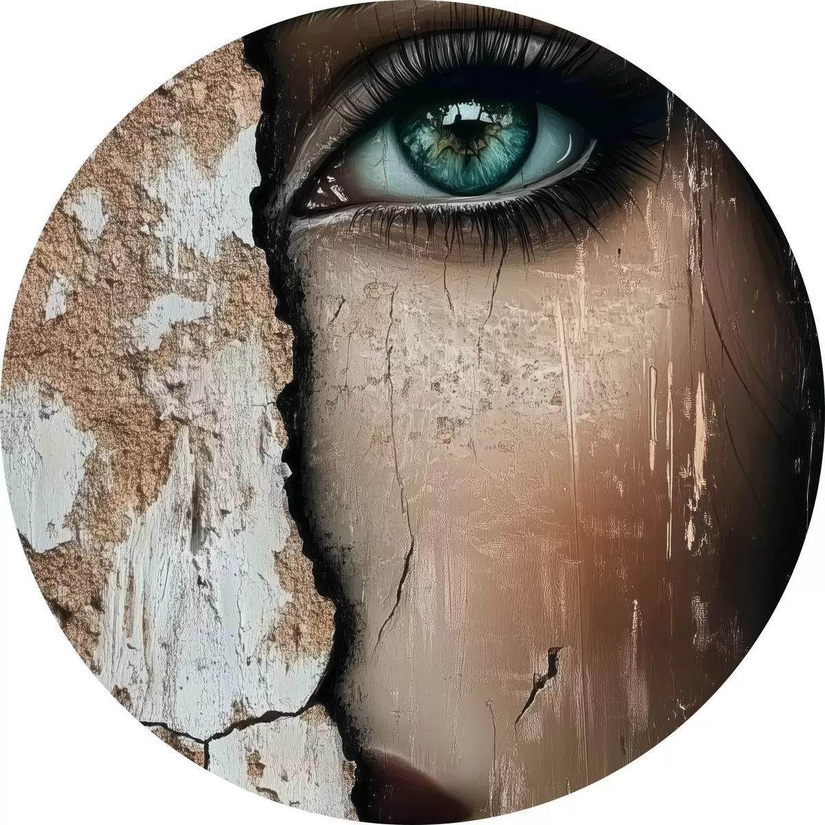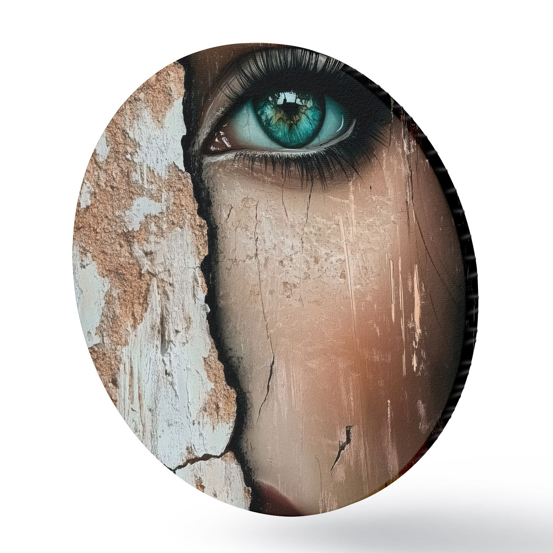 Cuadros redondos Cara de niña detrás de un viejo muro r44069