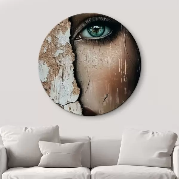 Cuadros redondos Cara de niña detrás de un viejo muro r44069