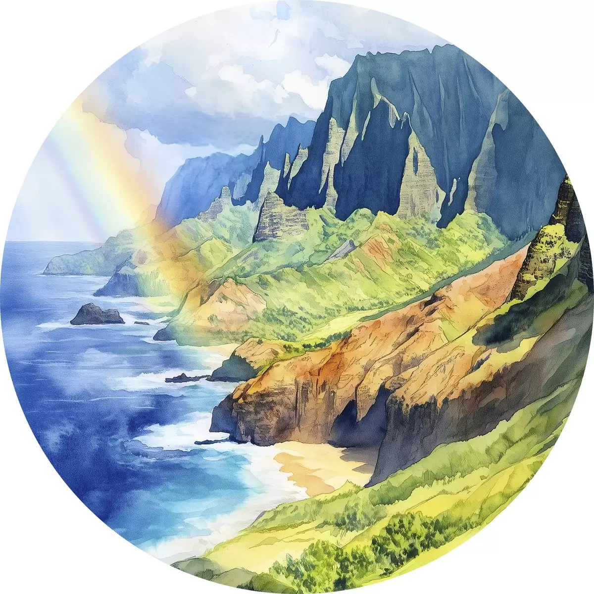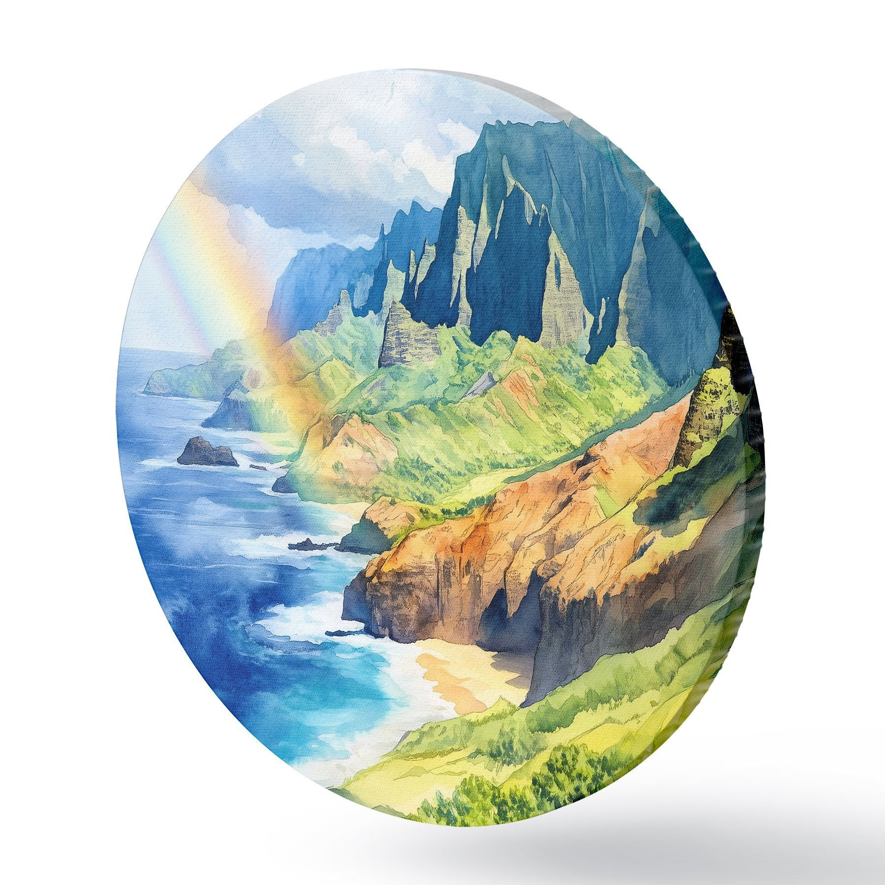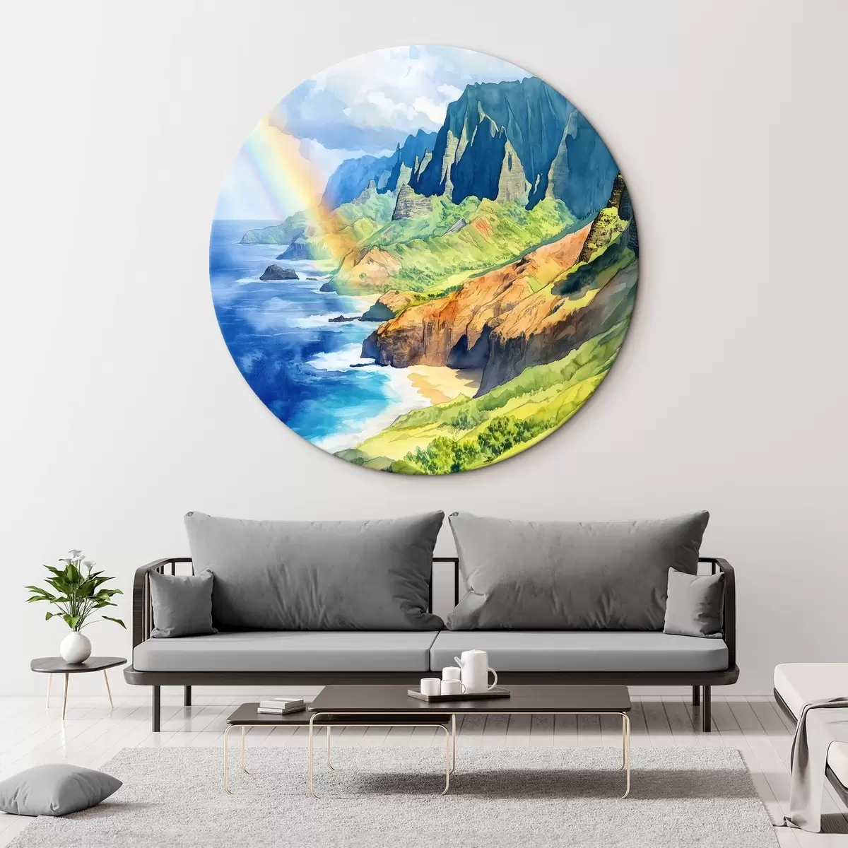 Cuadros redondos Isla de Hawai, estilo acuarela, arco iris, montañas verdes, océano r44141