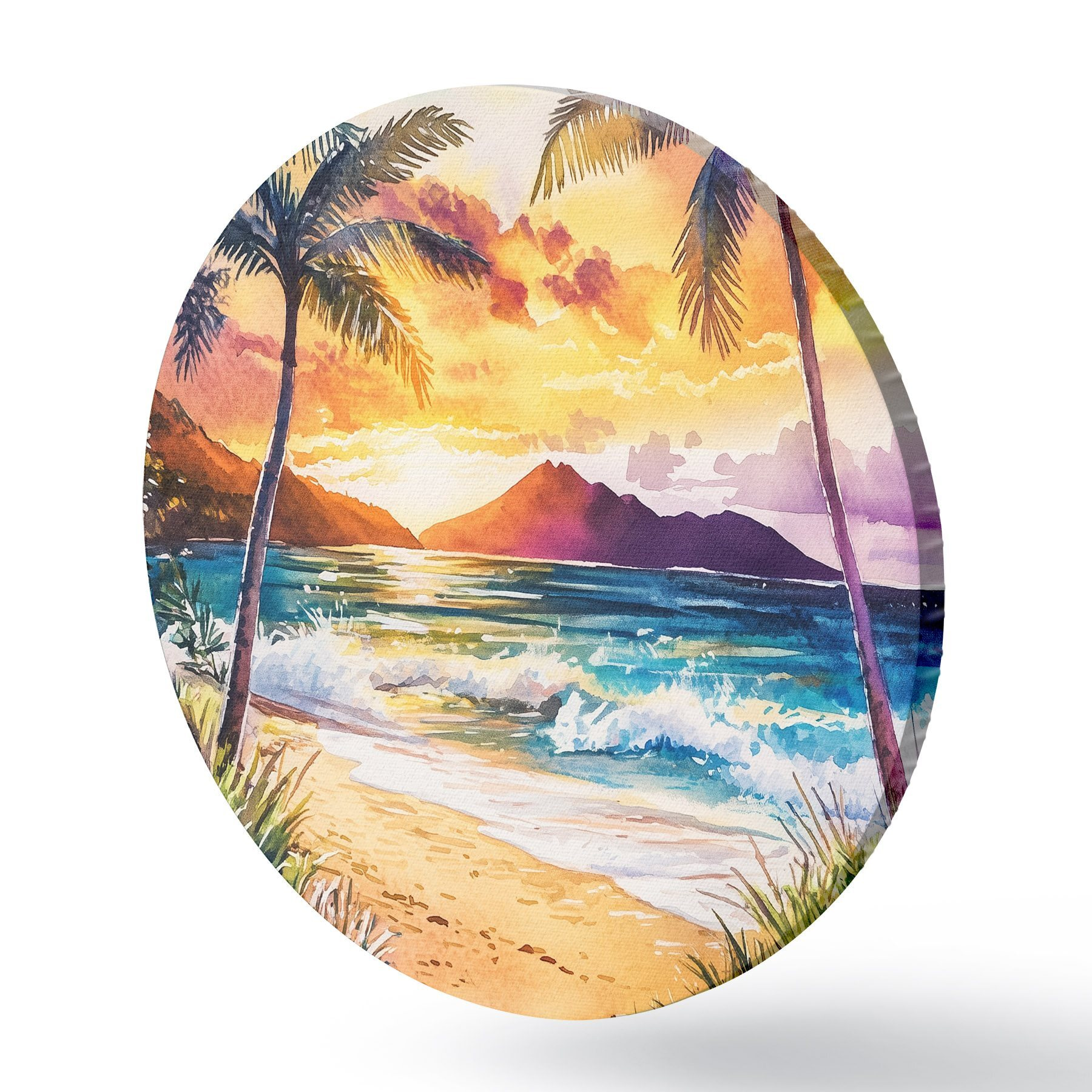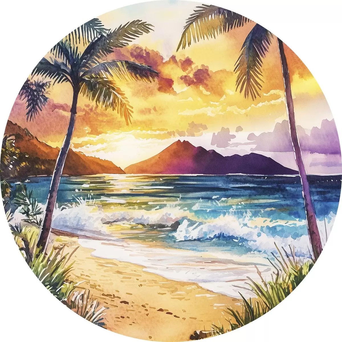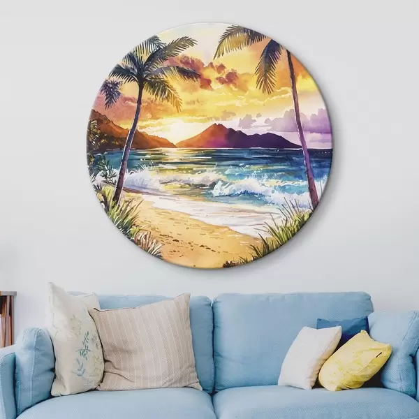 Cuadros redondos Puesta de sol en la isla de Hawai, palmeras, océano, cielo colorido, estilo acuarela r44142