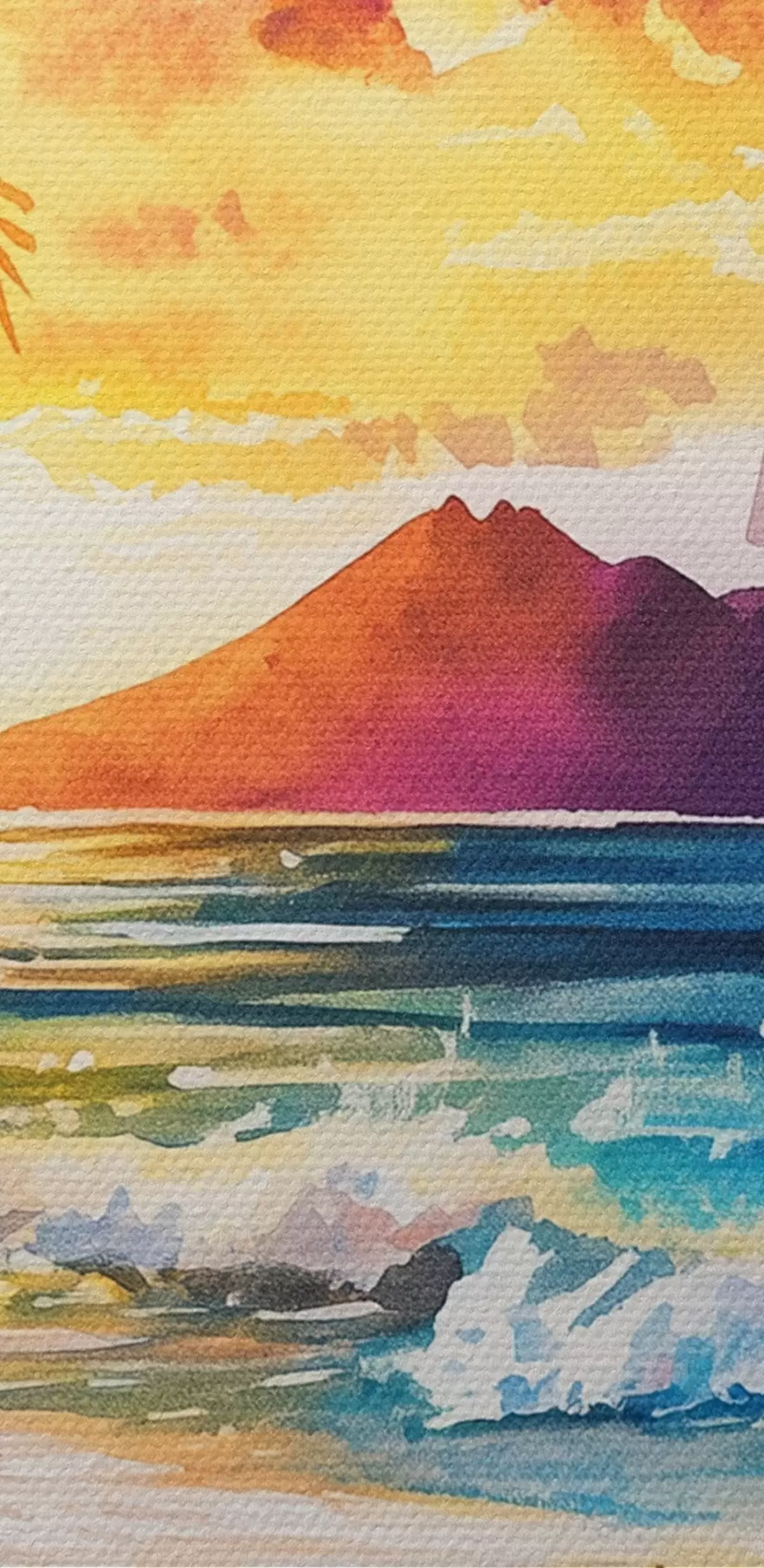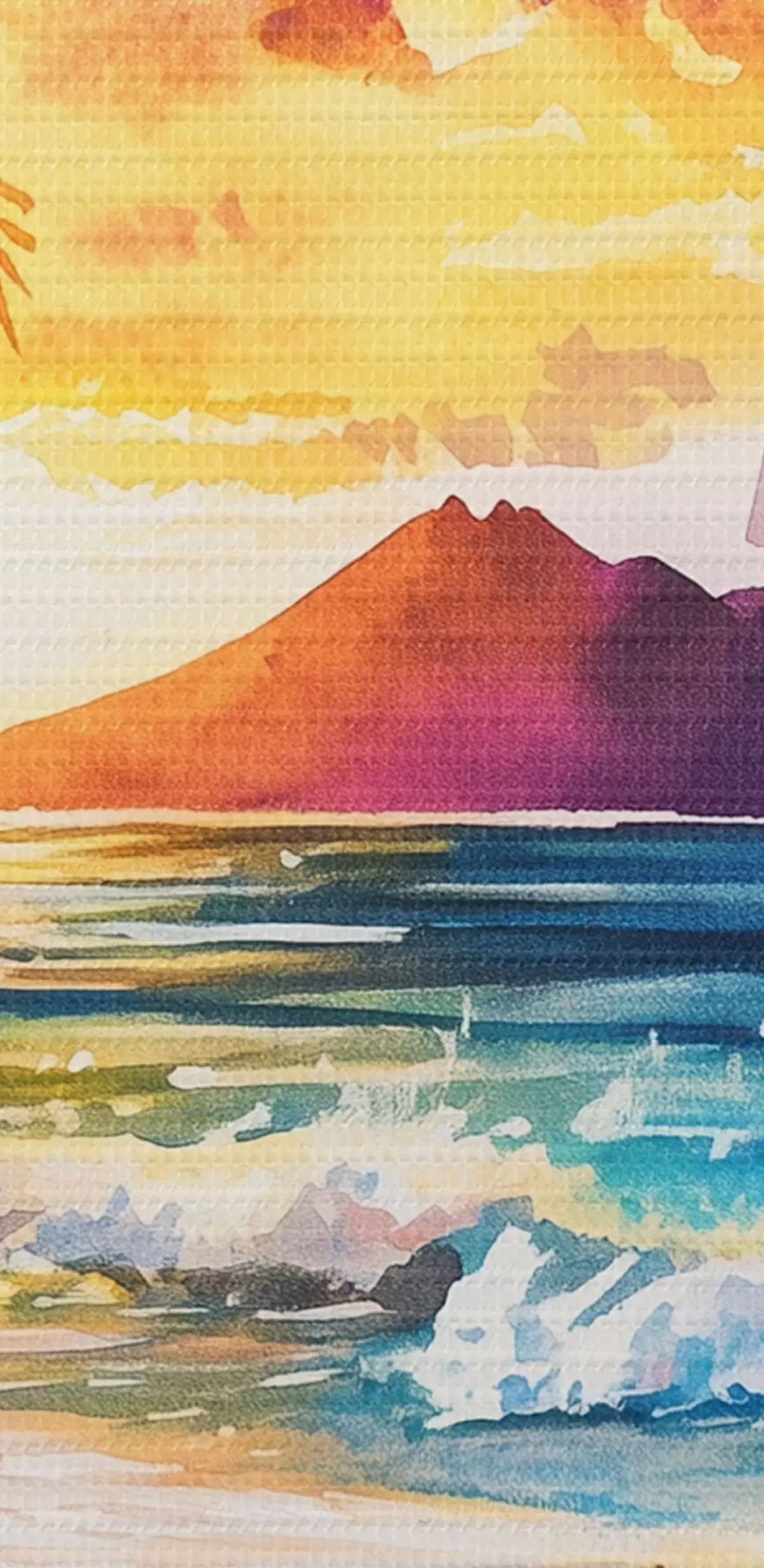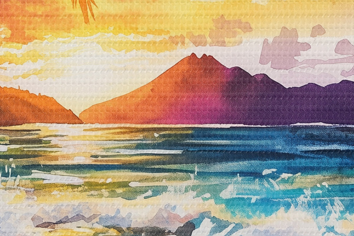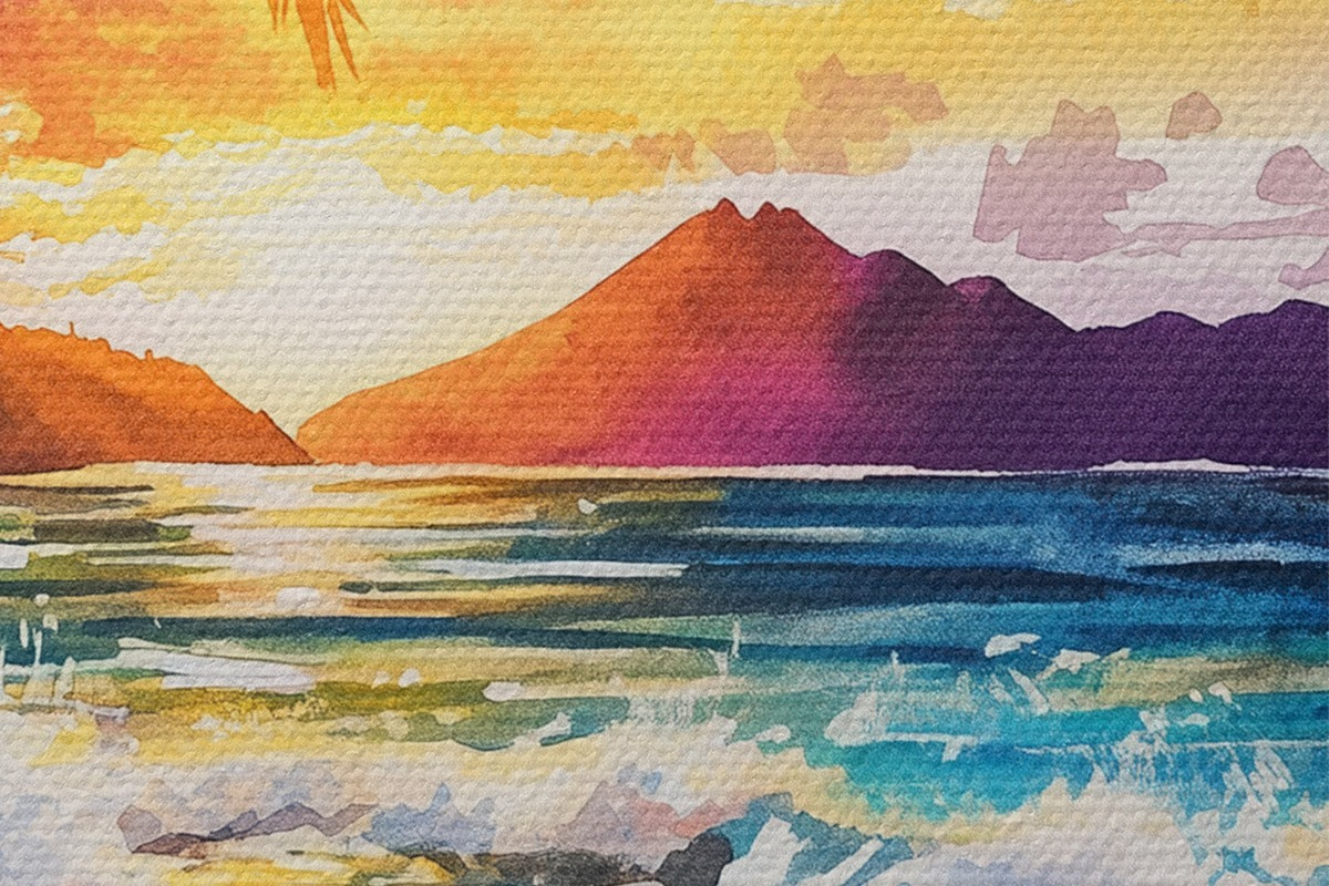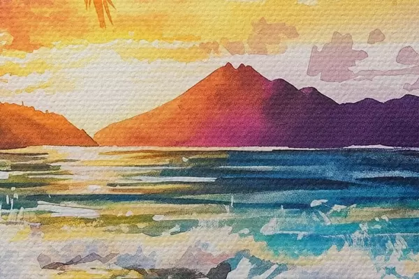 Foto Puesta de sol en la isla de Hawai, palmeras, océano, cielo colorido, estilo acuarela Nr r44142