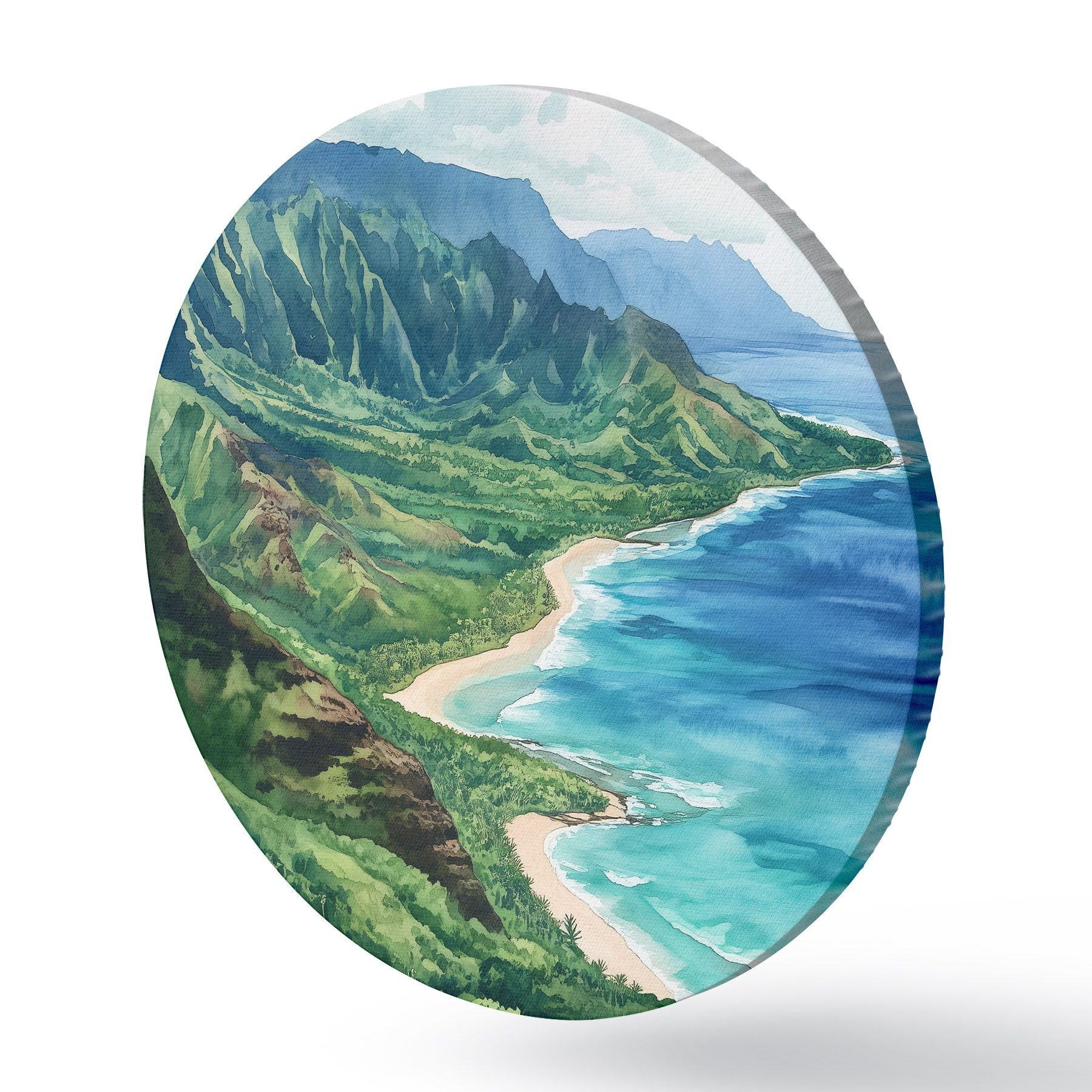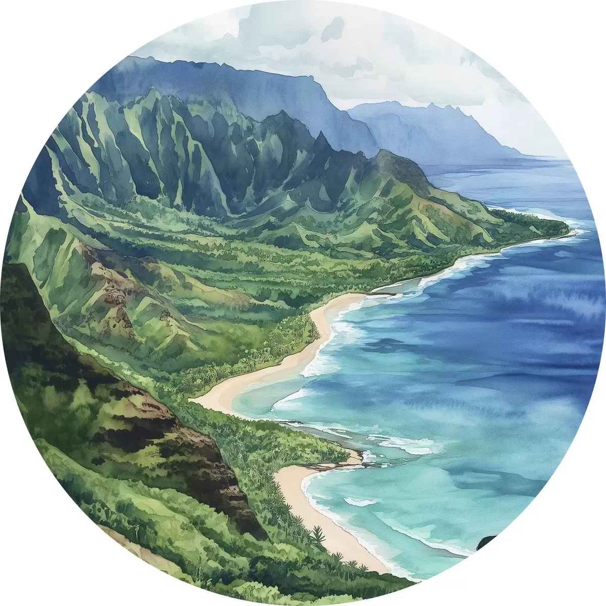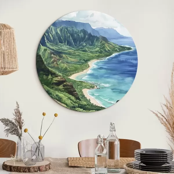 Cuadros redondos Montañas verdes, Hawai, océano, tropical, estilo acuarela r44143