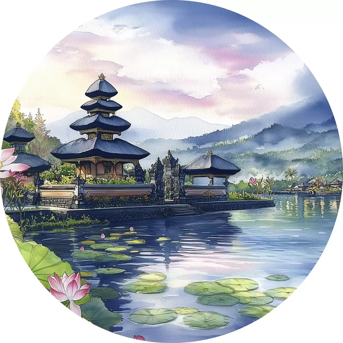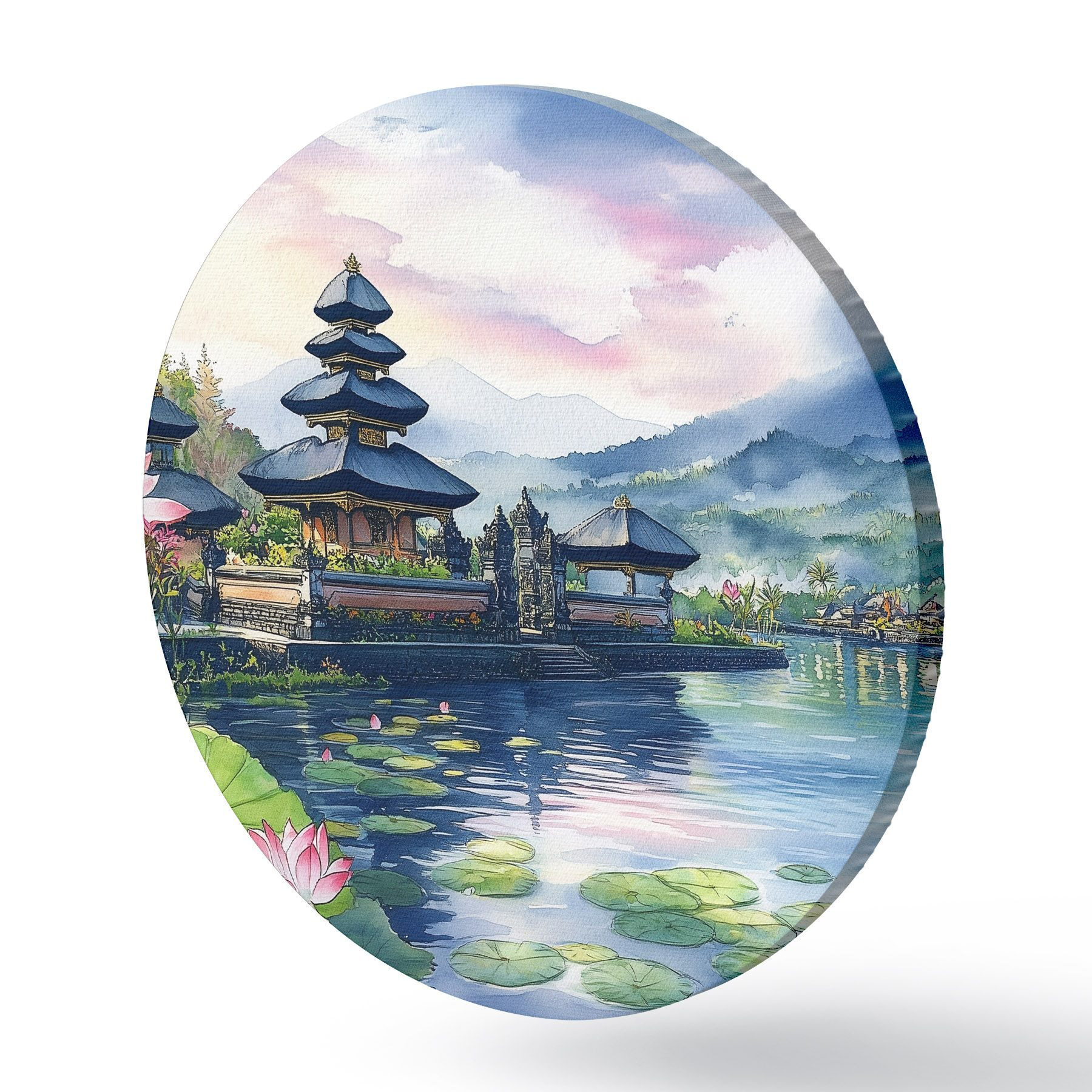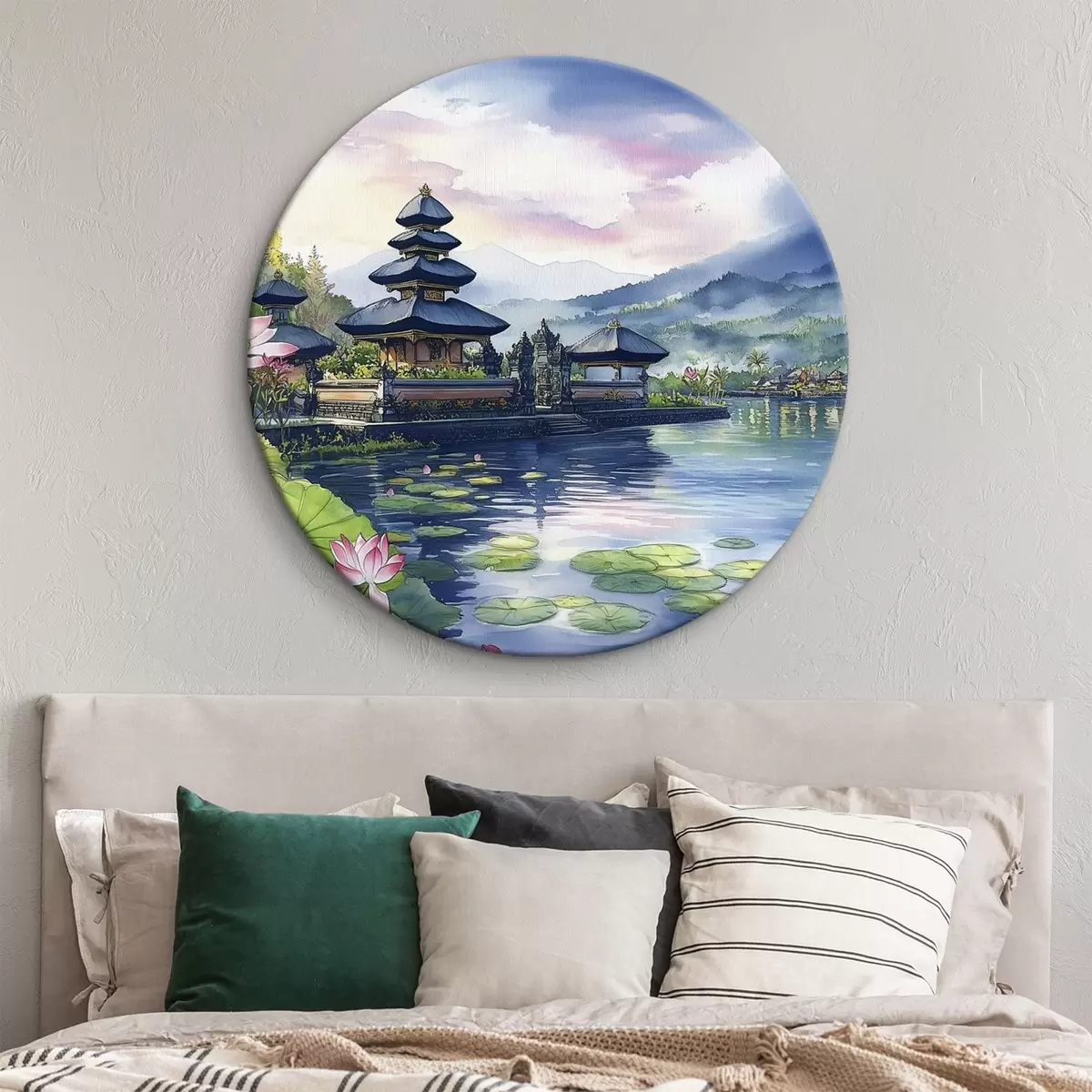 Cuadros redondos Isla indonesia, templo, budismo, naturaleza tropical, estilo acuarela r44148