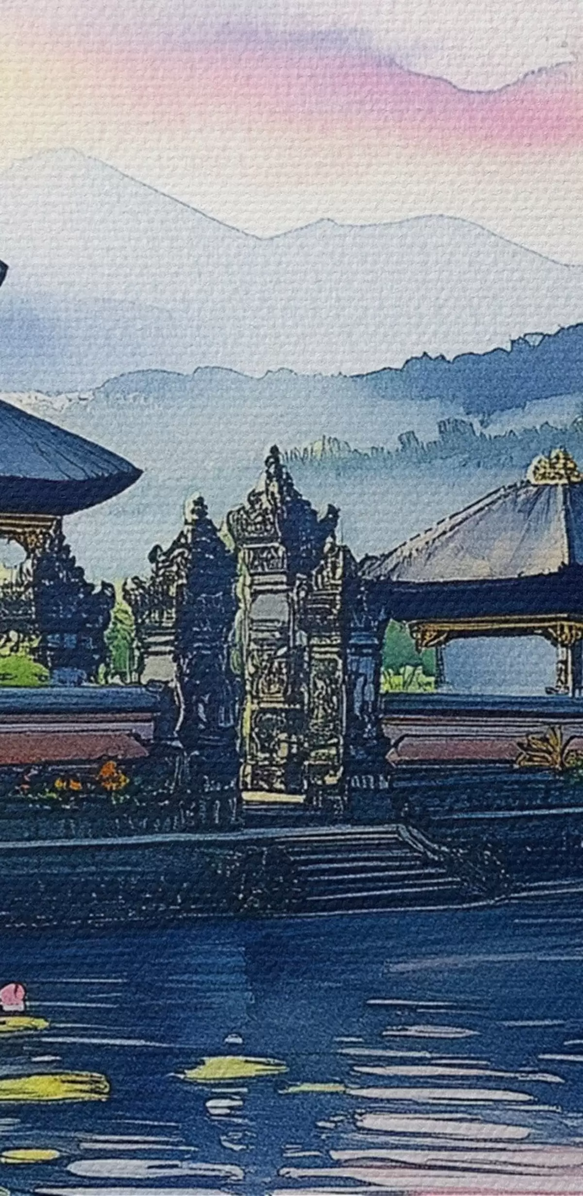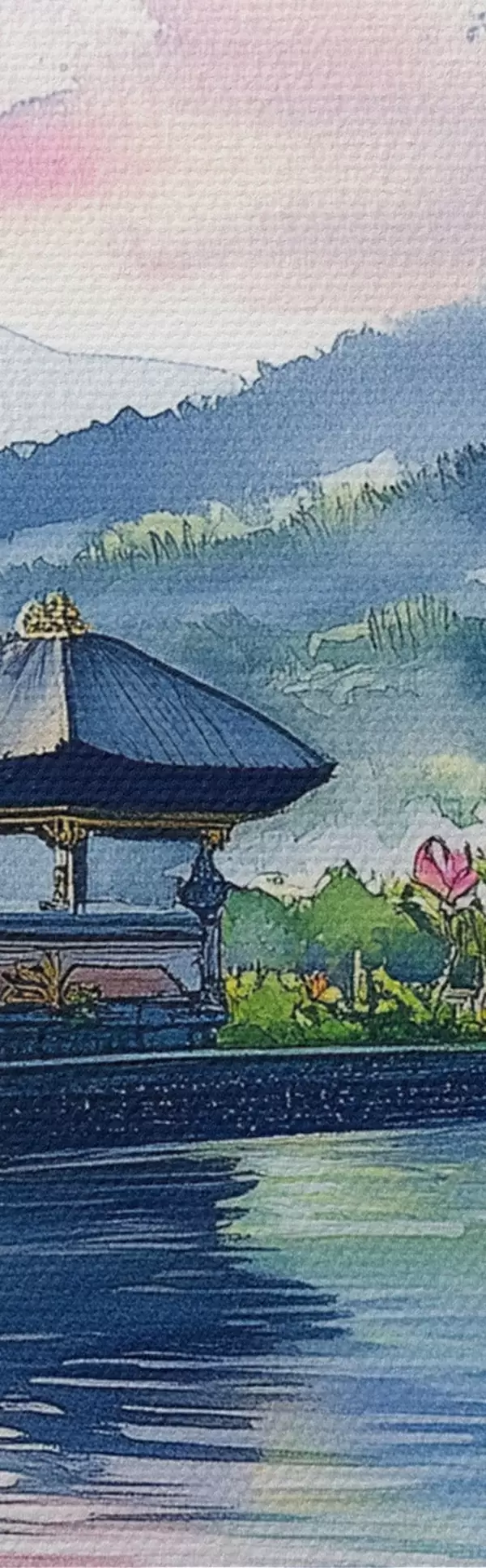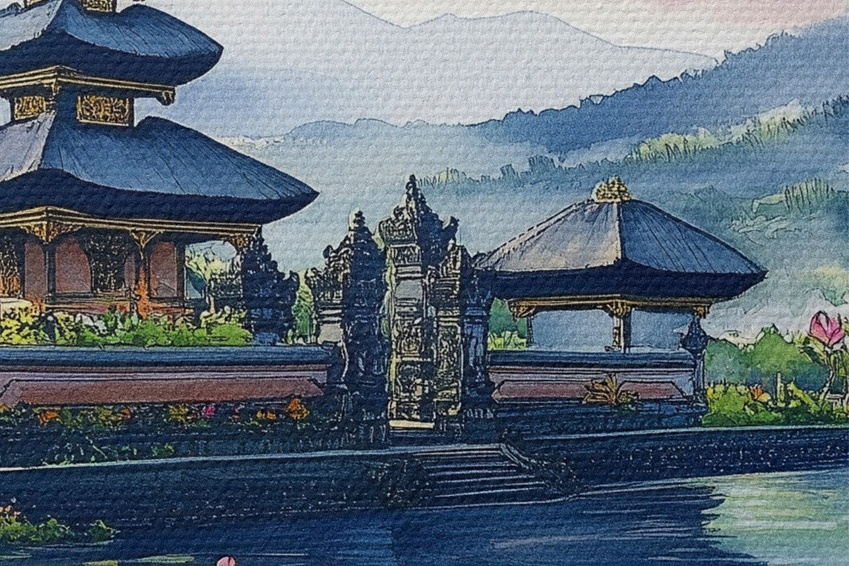Foto Isla indonesia, templo, budismo, naturaleza tropical, estilo acuarela Nr r44148