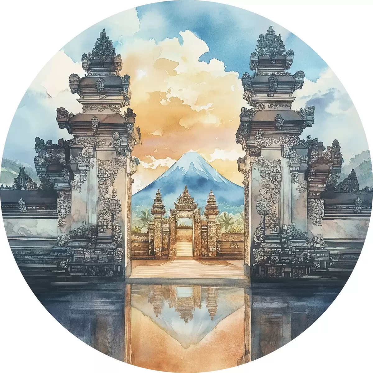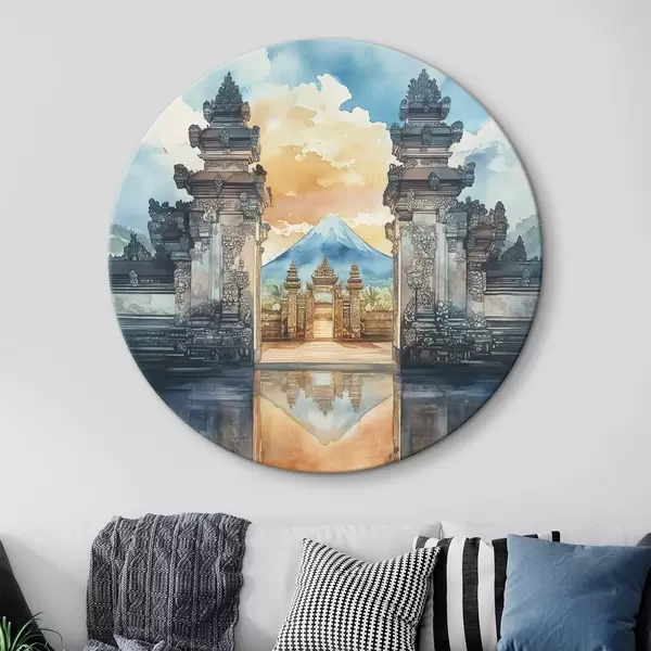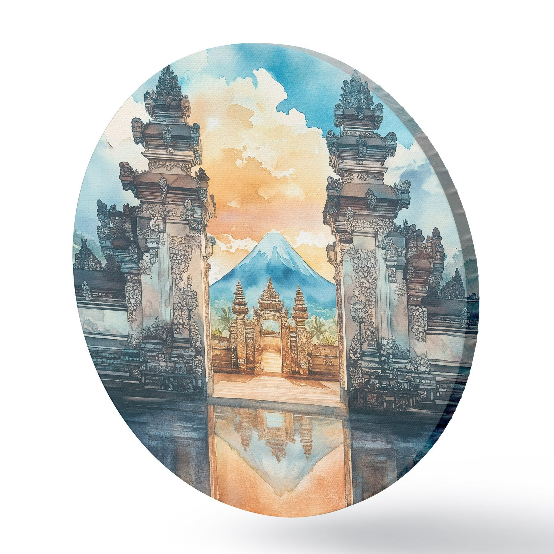 Cuadros redondos Estética de Bali, templo, cielo al atardecer, naturaleza tropical, estilo acuarela r44149