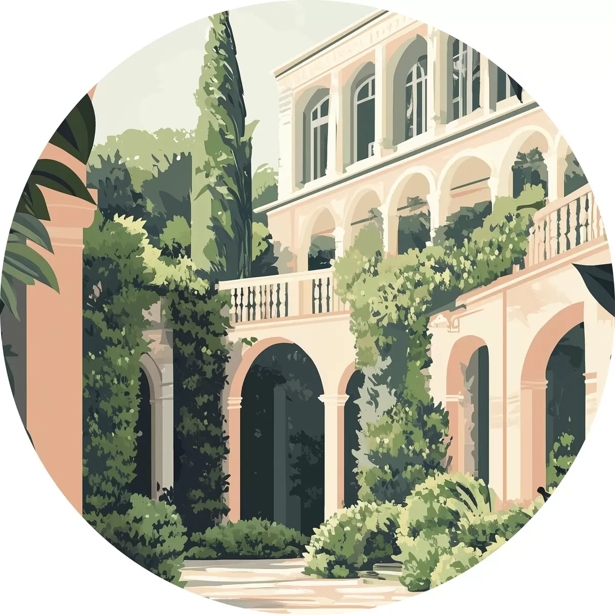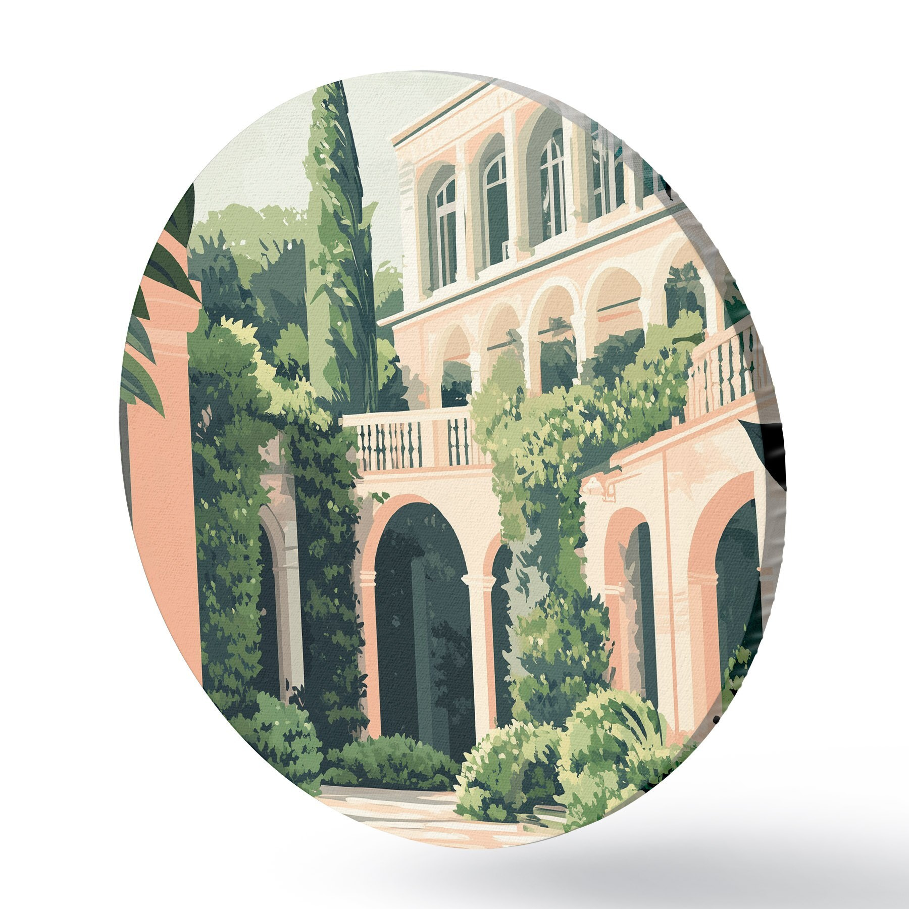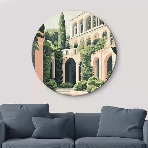 Cuadros redondos Arquitectura mediterránea, naturaleza tropical, estilo llano, chalet con jardín r44150