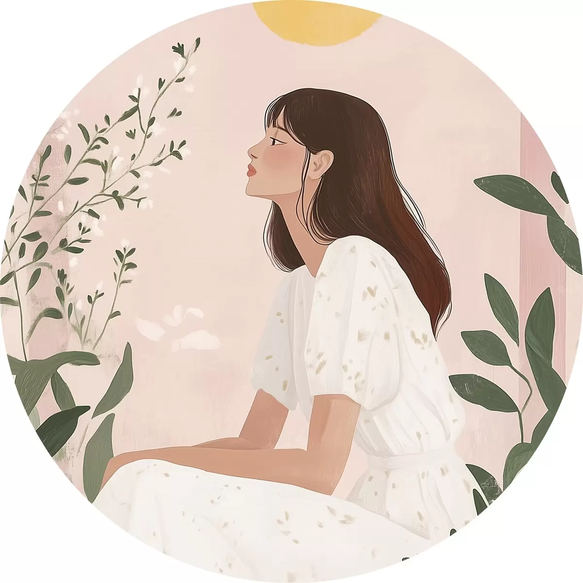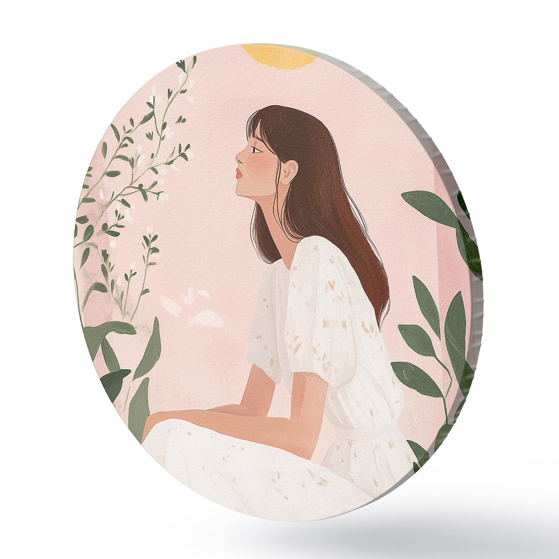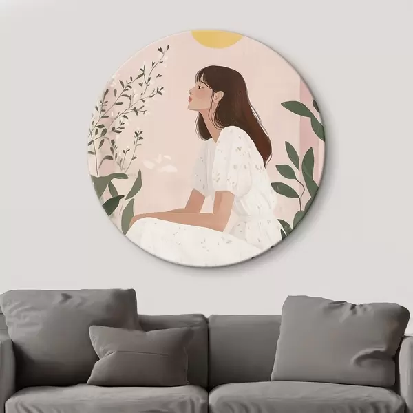 Cuadros redondos Hermosa mujer en el jardín tropical, sol, colores pastel r44155
