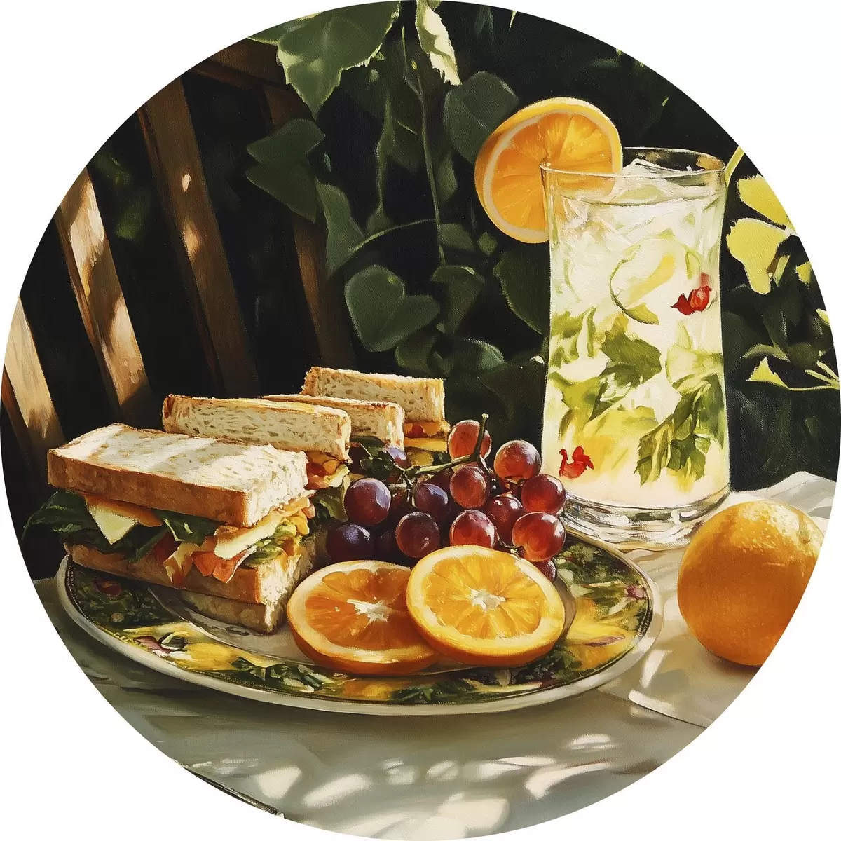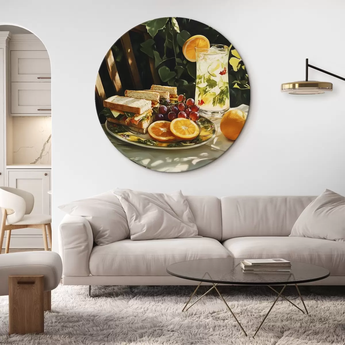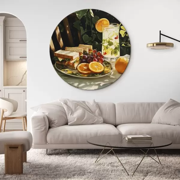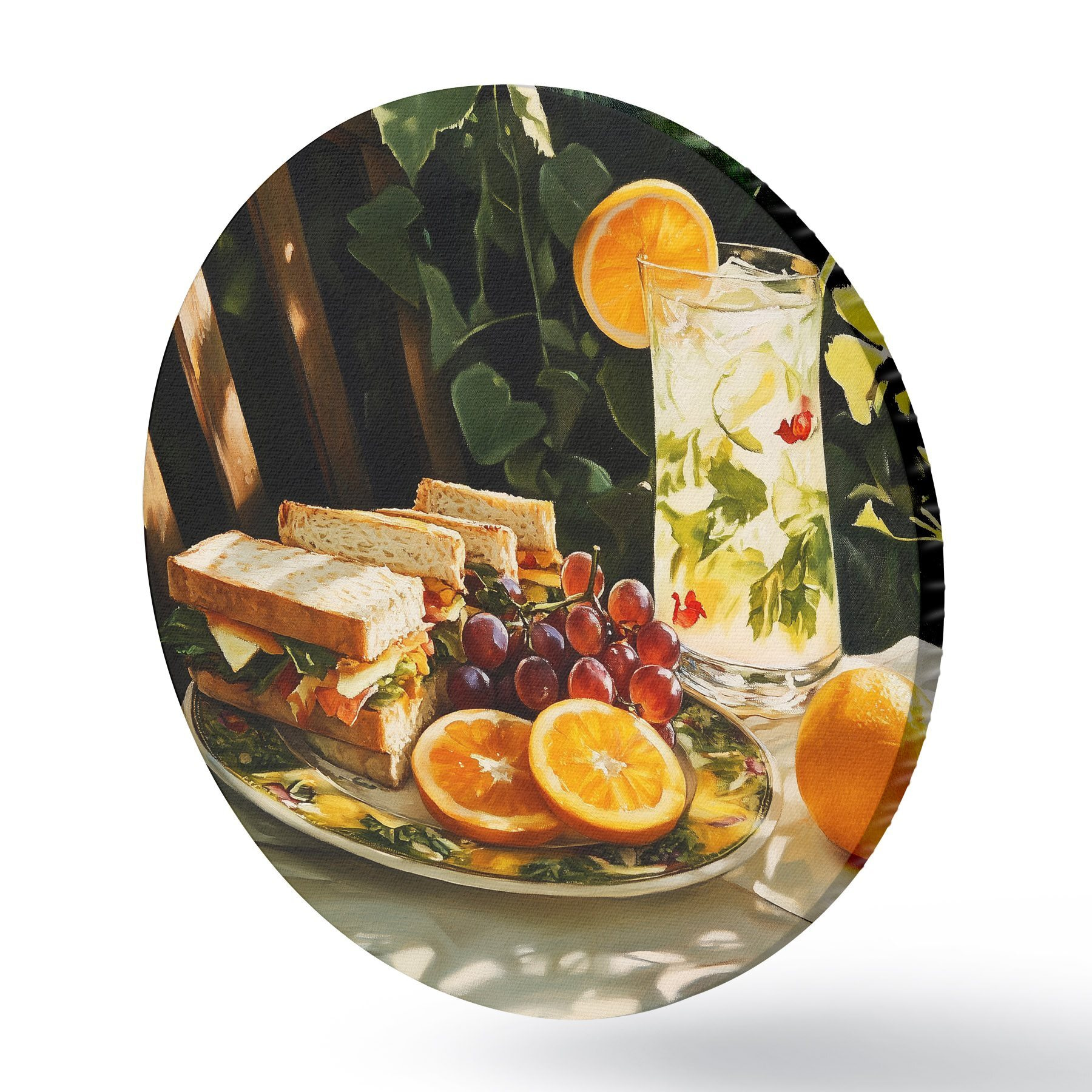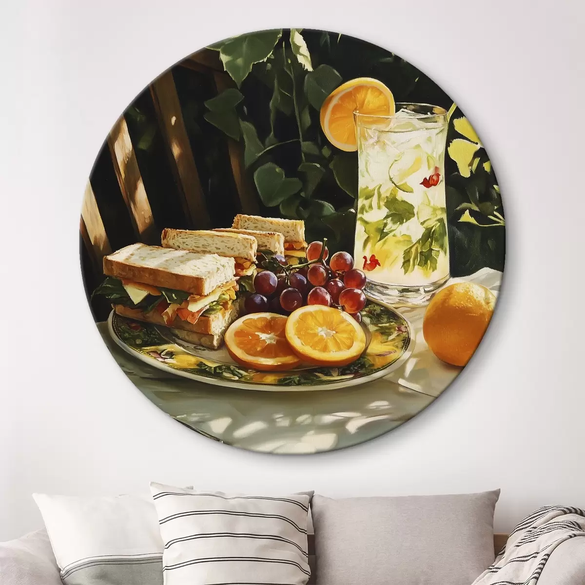 Cuadros redondos Estético picnic en el jardín de verano, bocadillos, naranjas, limonada r44306