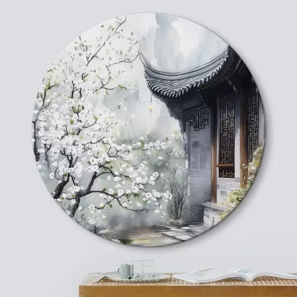 Cuadros redondos Jardín japonés con cerezo y casa, estilo oriental, acuarela r44309