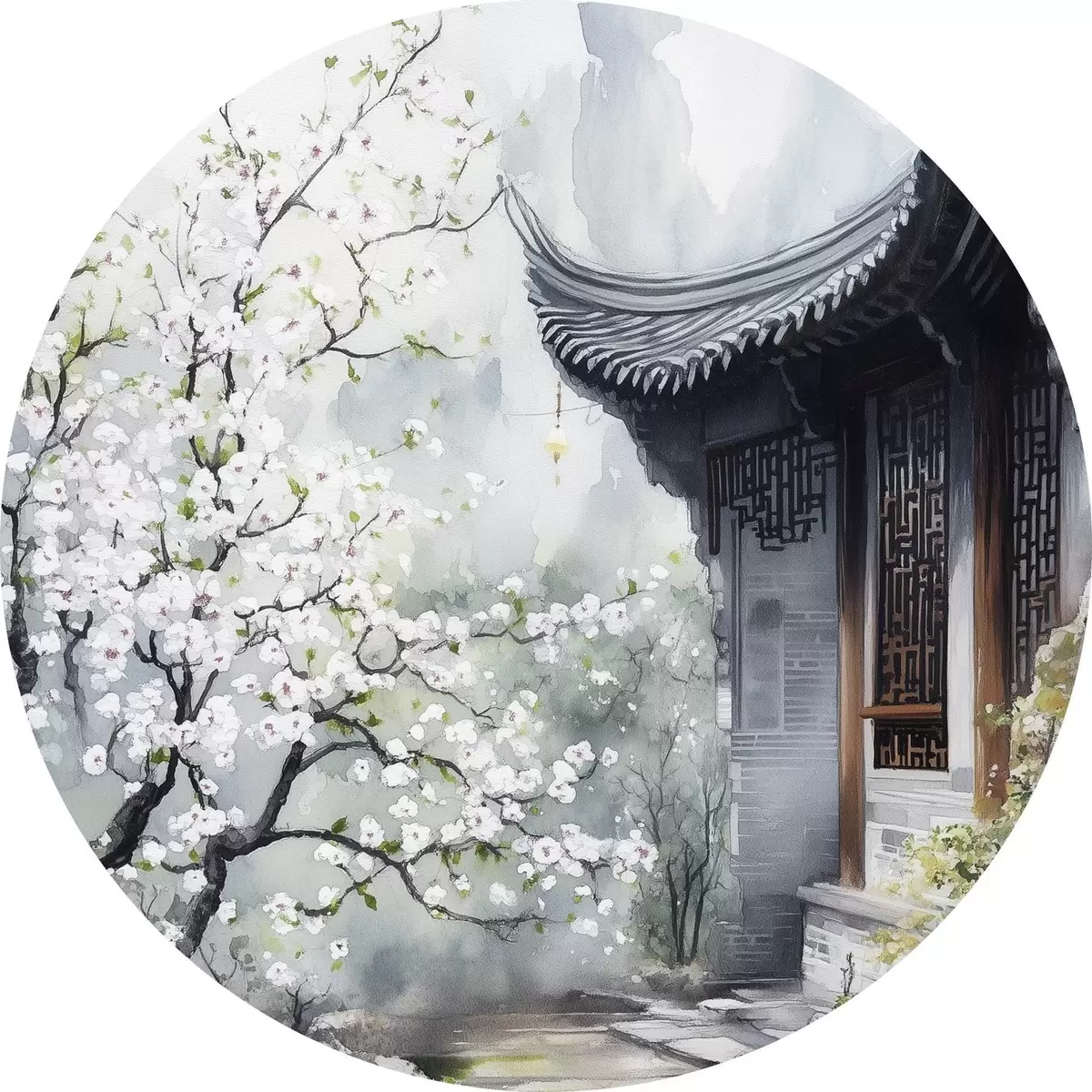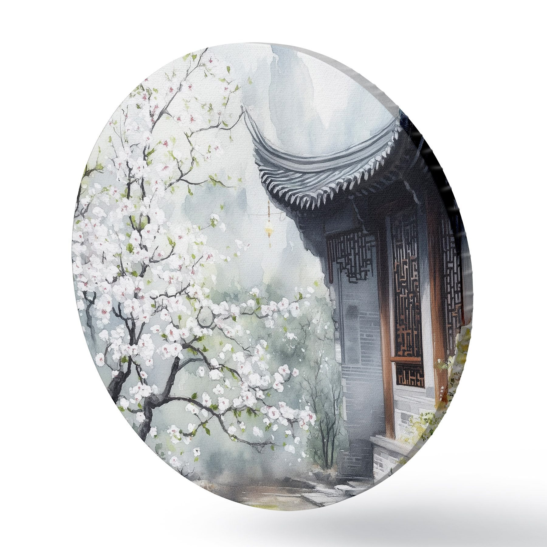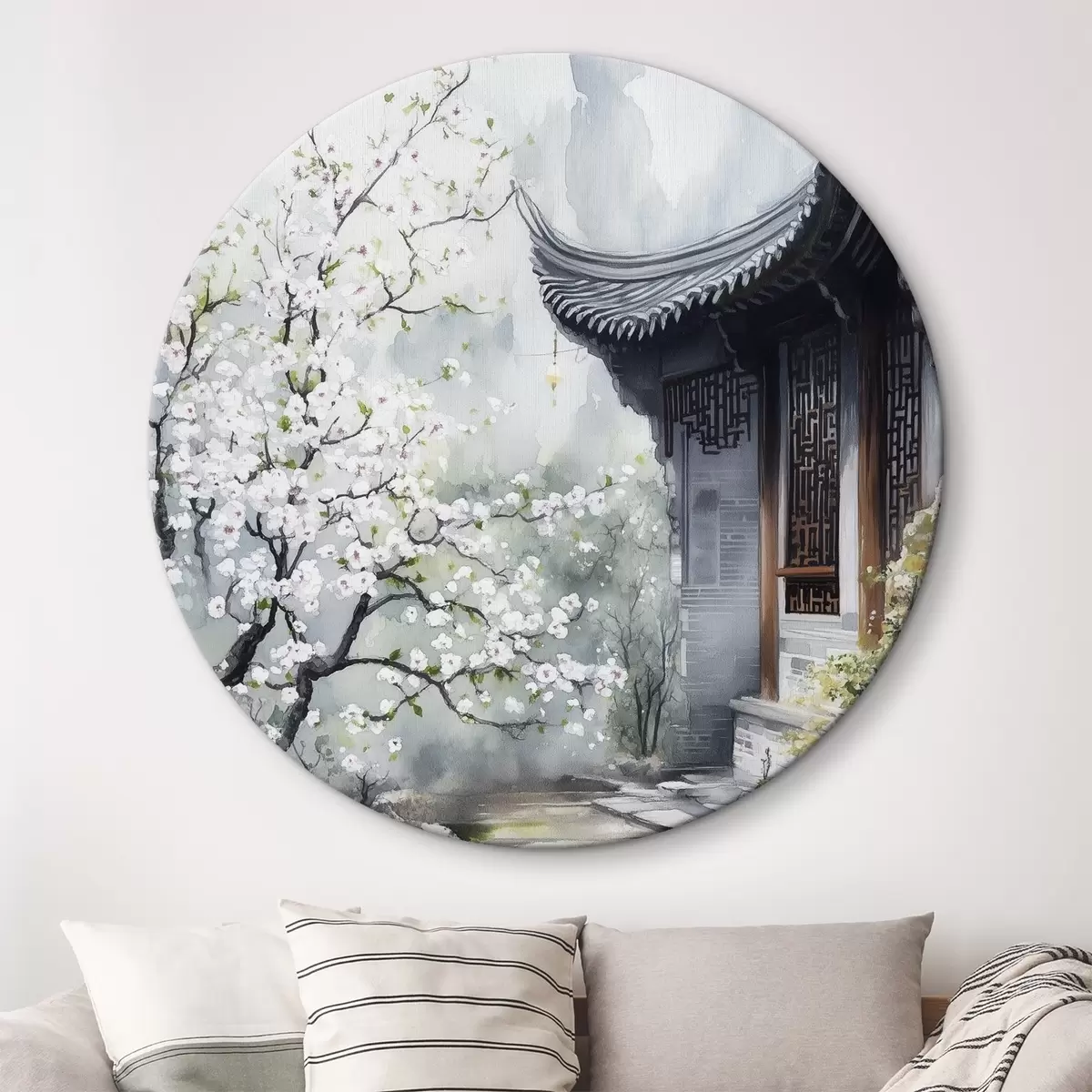 Cuadros redondos Jardín japonés con cerezo y casa, estilo oriental, acuarela r44309