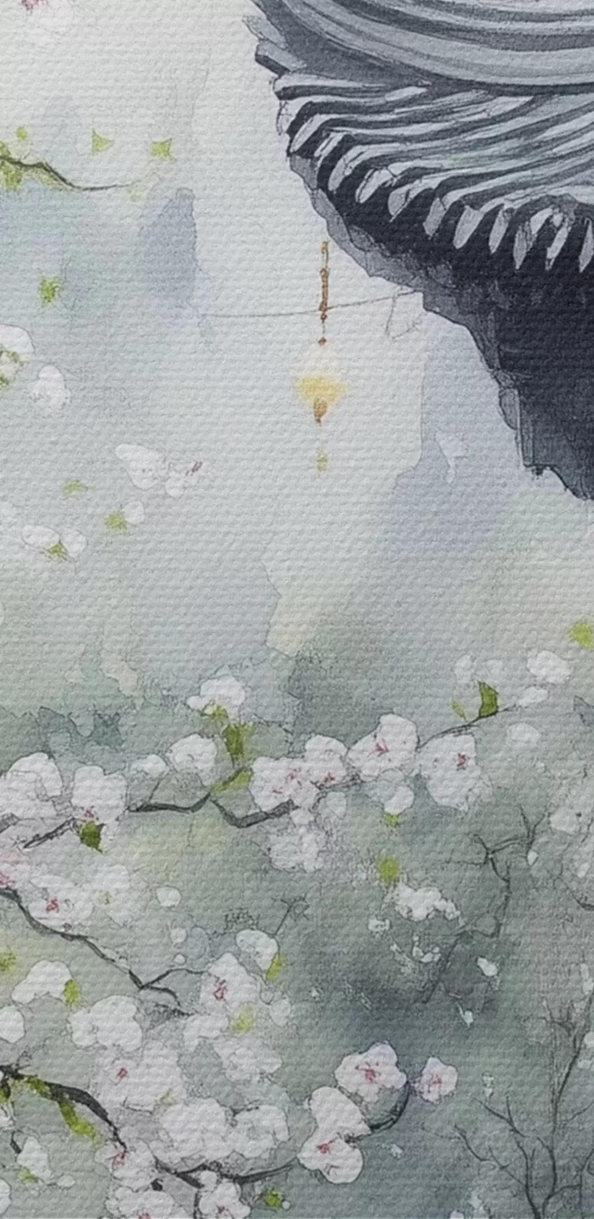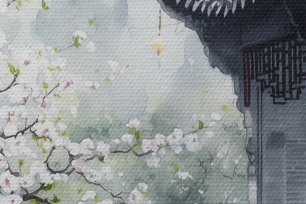 Foto Jardín japonés con cerezo y casa, estilo oriental, acuarela Nr r44309