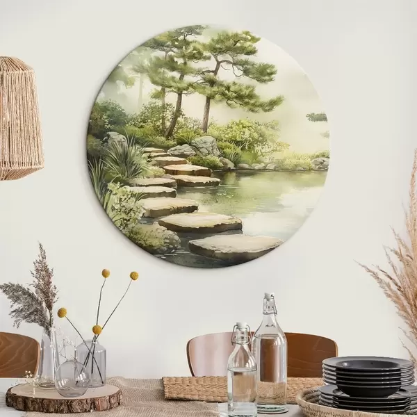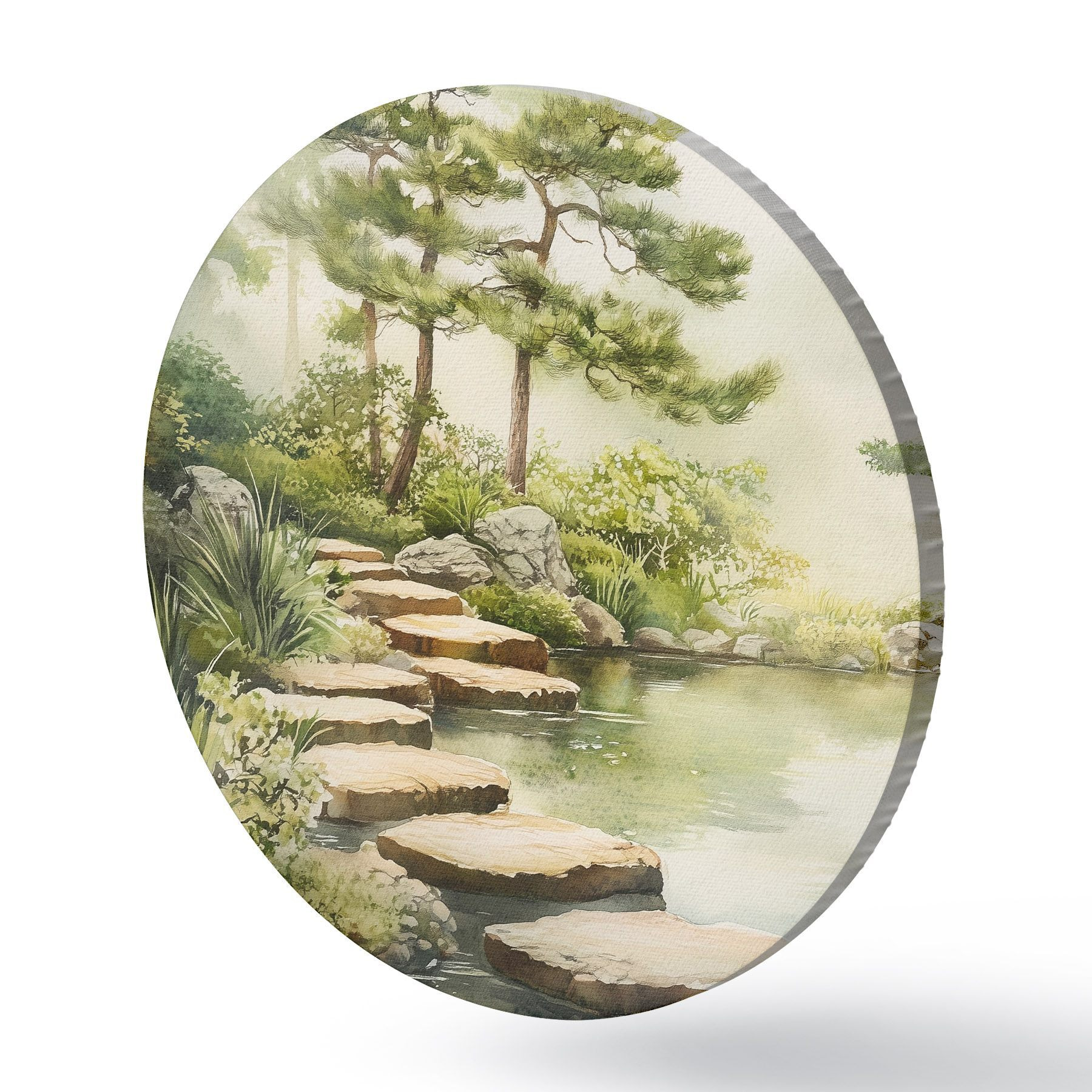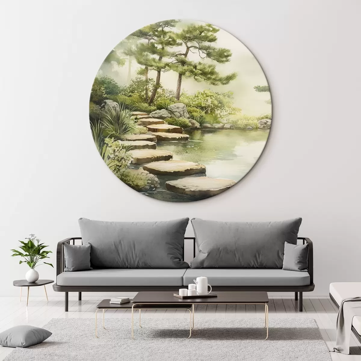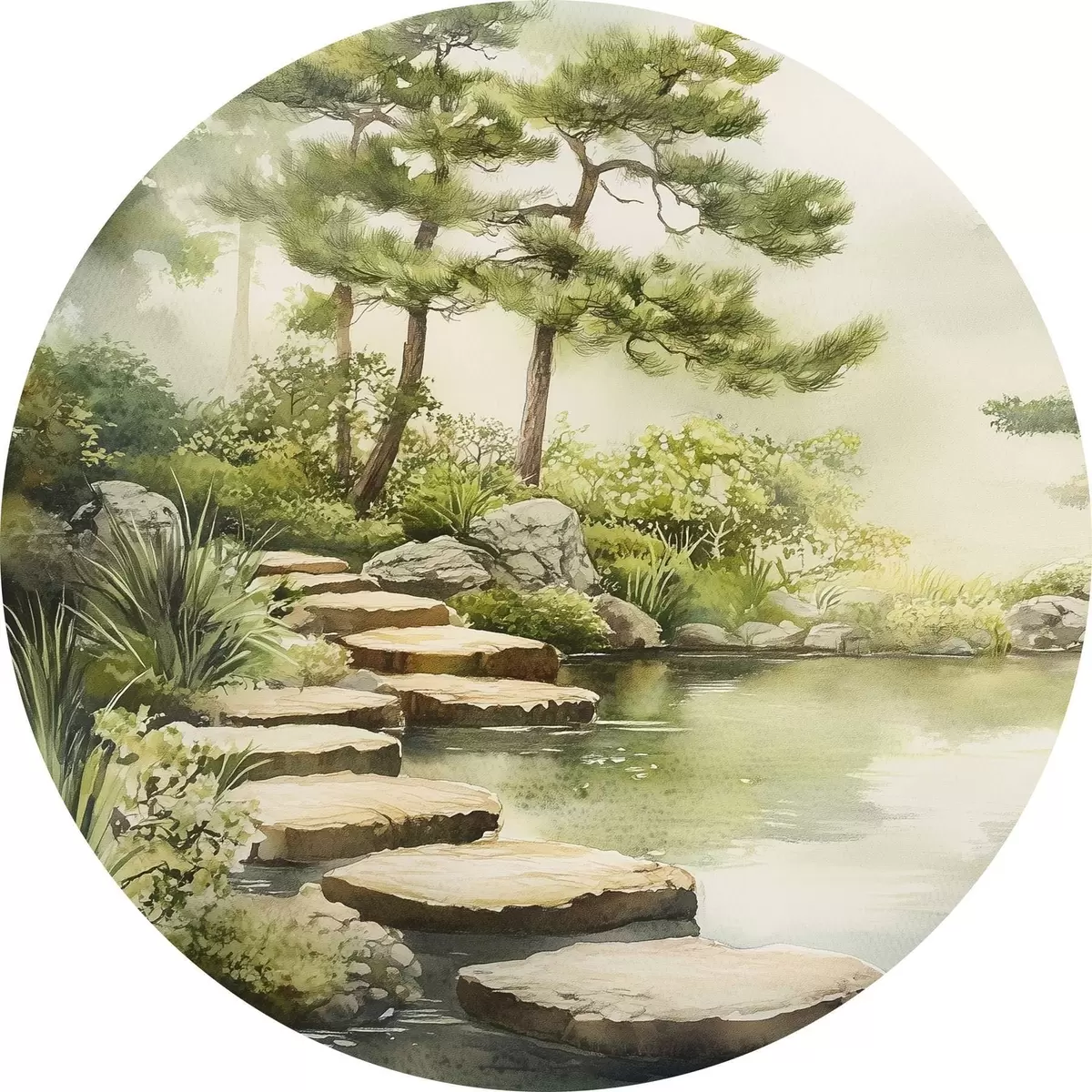 Cuadros redondos Jardín oriental con lago y árboles, naturaleza, estilo acuarela r44313