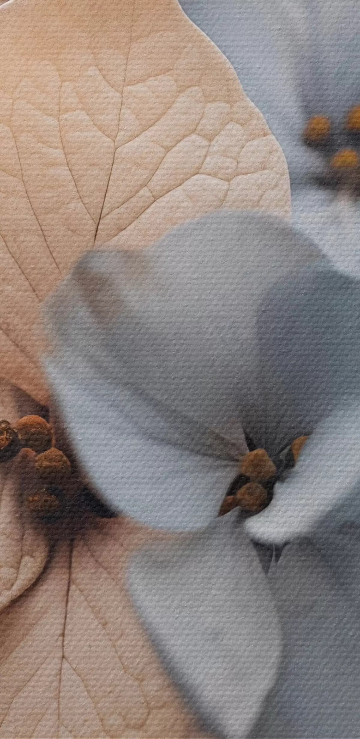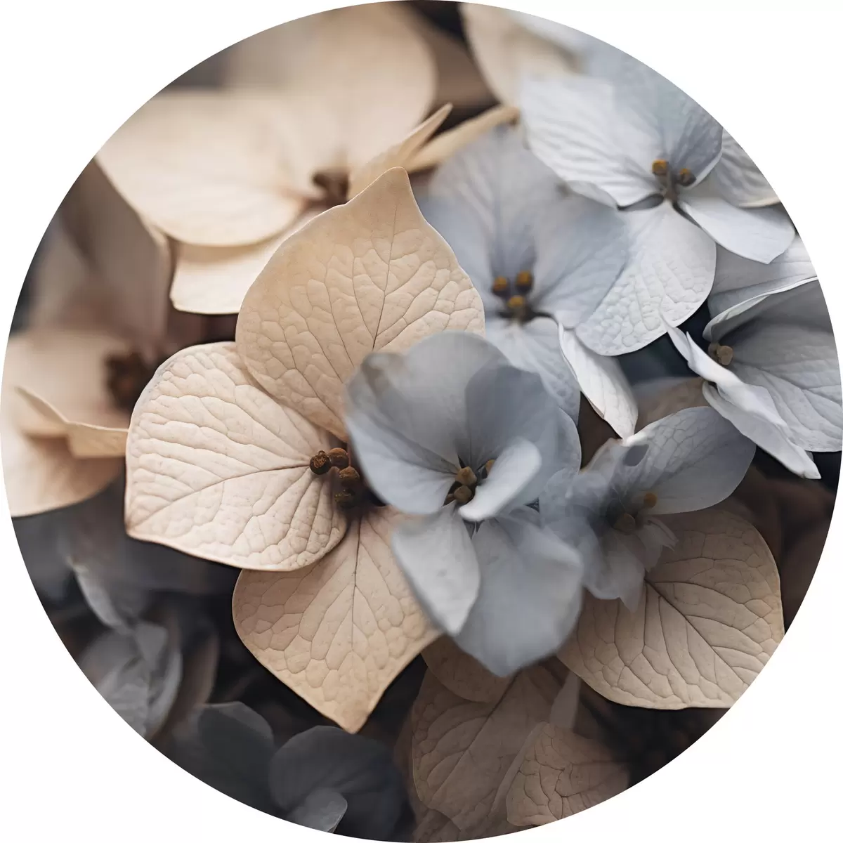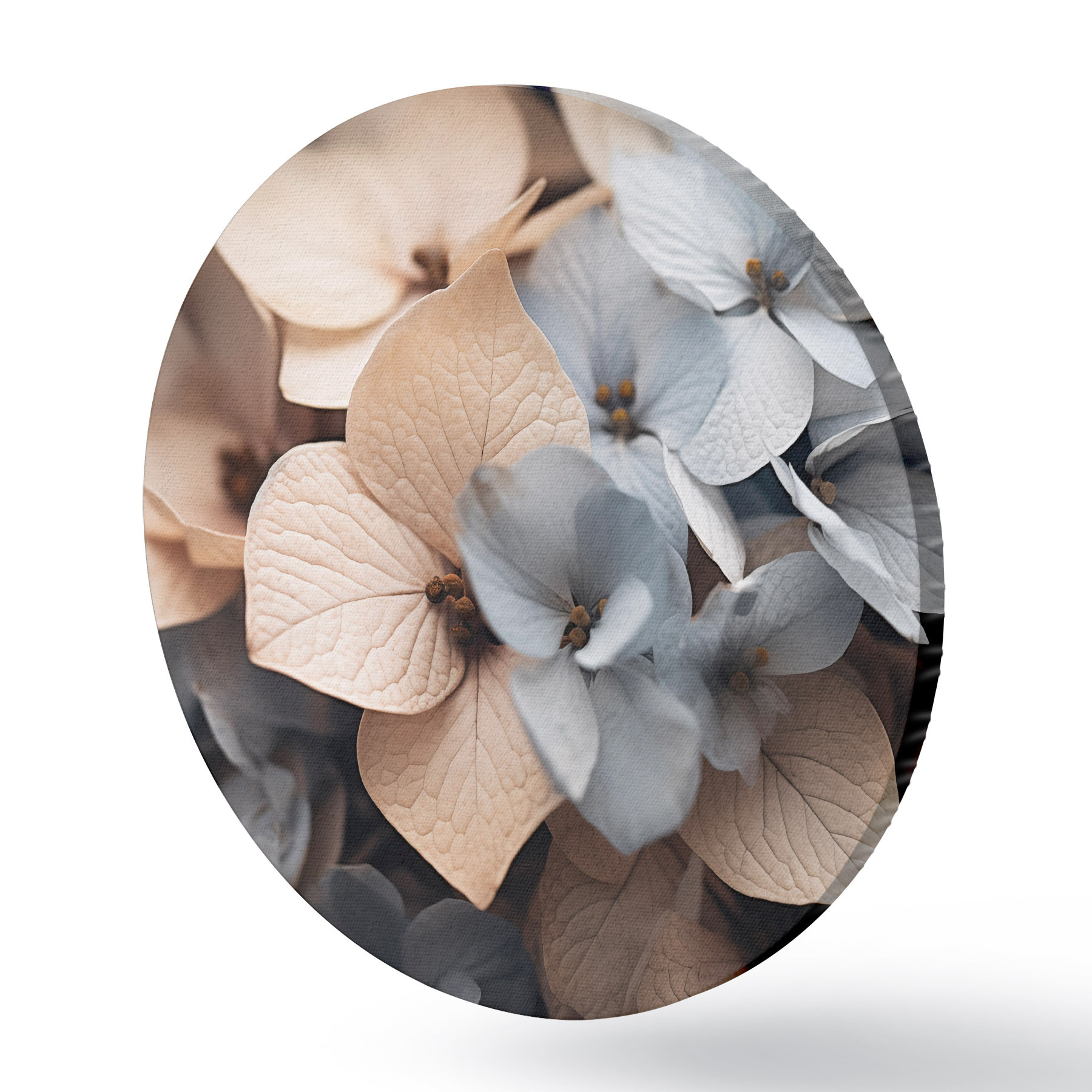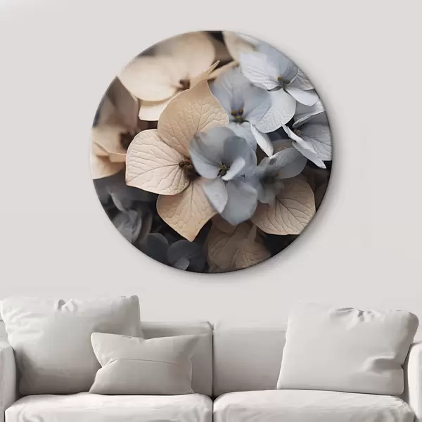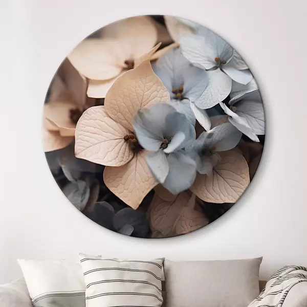 Cuadros redondos Flores de hortensia, pétalos azul claro y beige, con texturas detalladas, elegante arreglo floral r44394