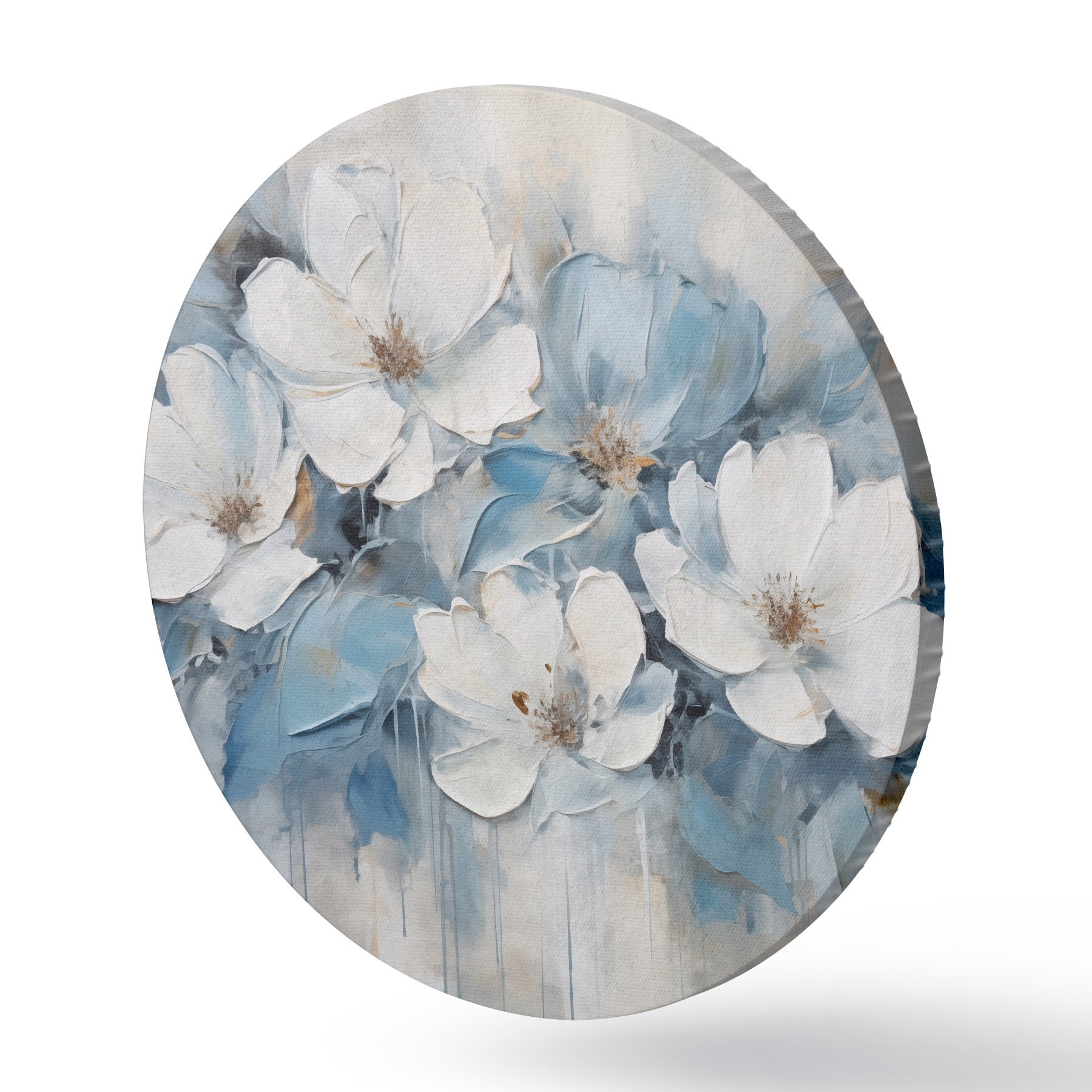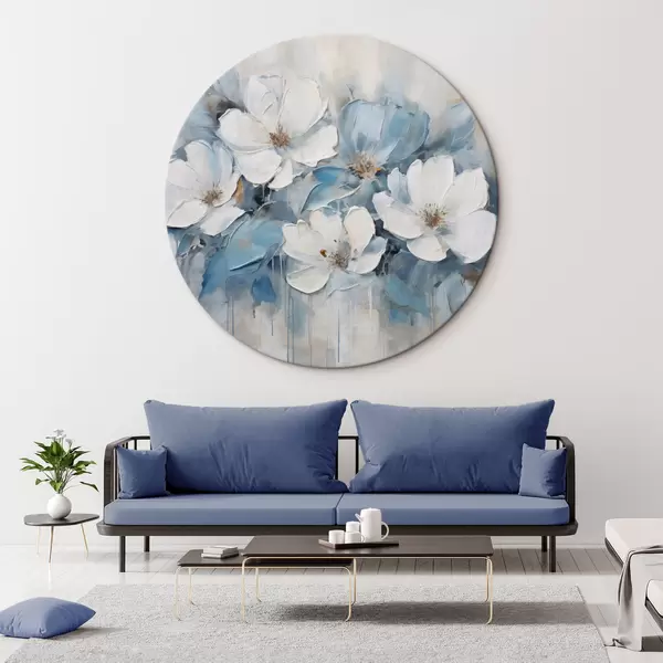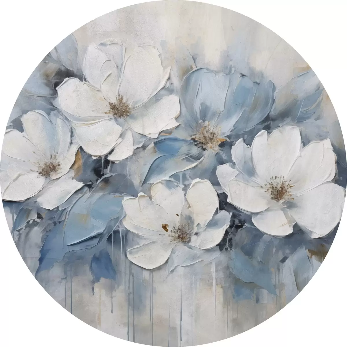 Cuadros redondos Flores blancas con hojas azules, sobre fondo beige claro, con pinceladas visibles r44395
