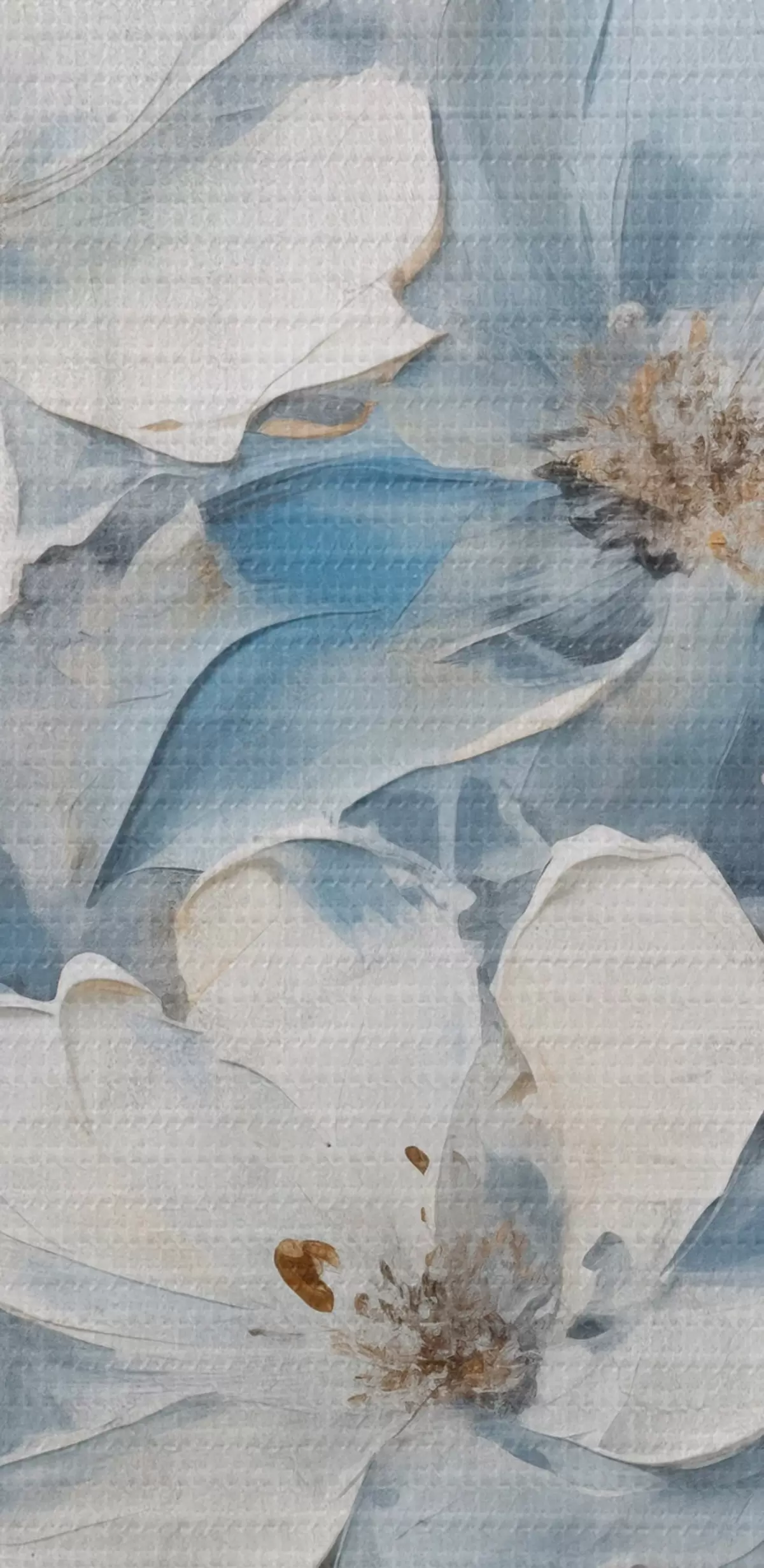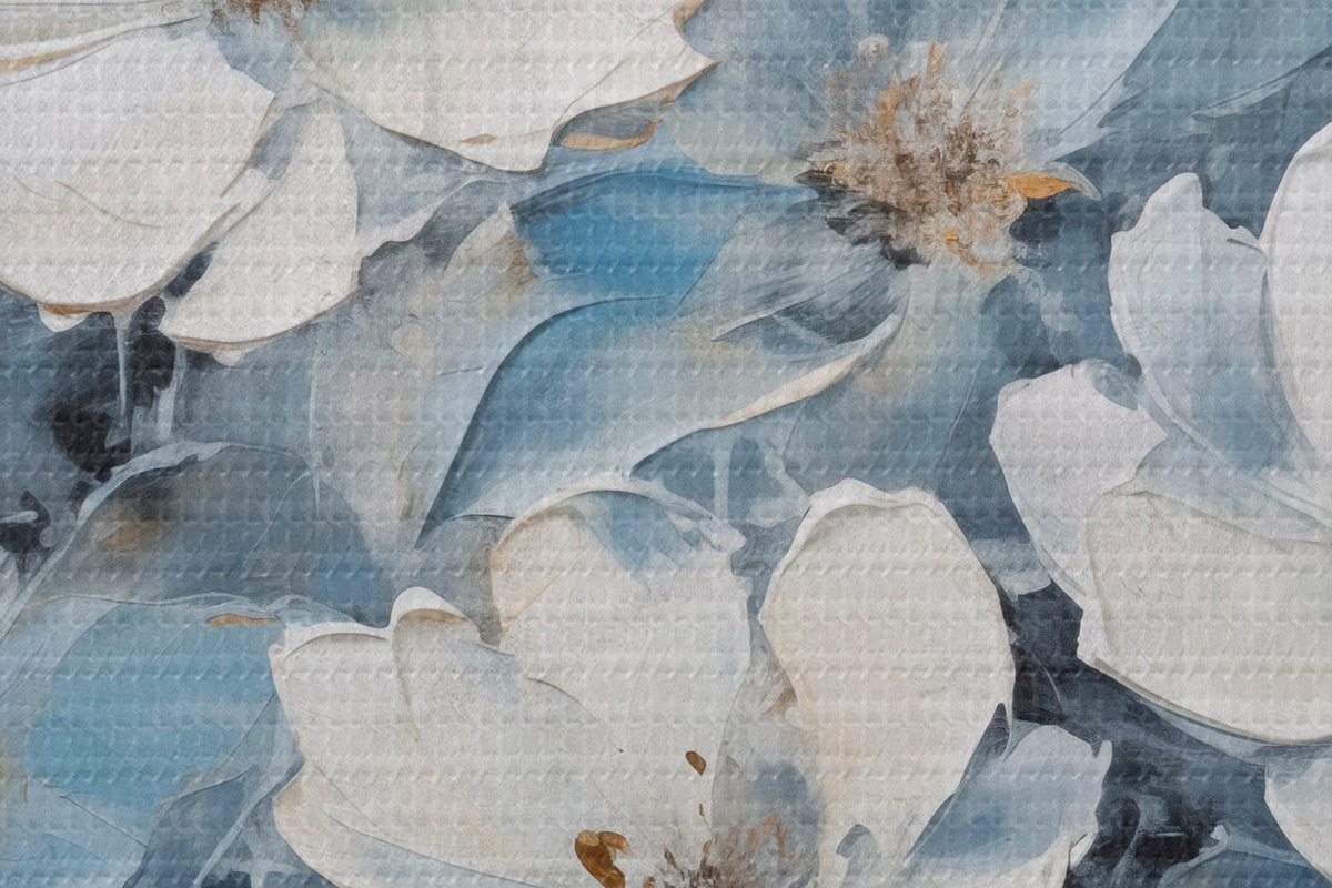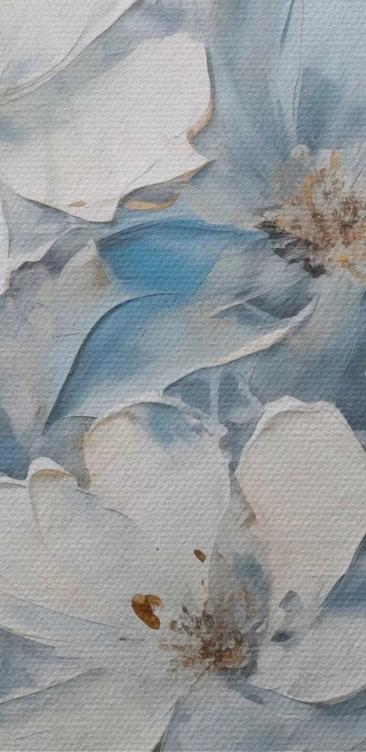 Foto Flores blancas con hojas azules, sobre fondo beige claro, con pinceladas visibles Nr r44395