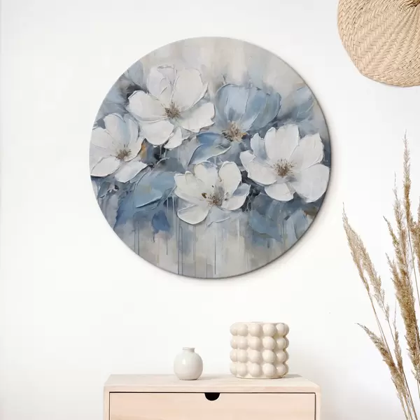 Cuadros redondos Flores blancas con hojas azules, sobre fondo beige claro, con pinceladas visibles r44395