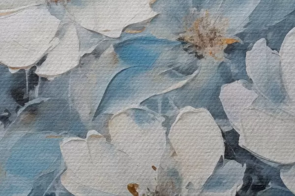 Foto Flores blancas con hojas azules, sobre fondo beige claro, con pinceladas visibles Nr r44395