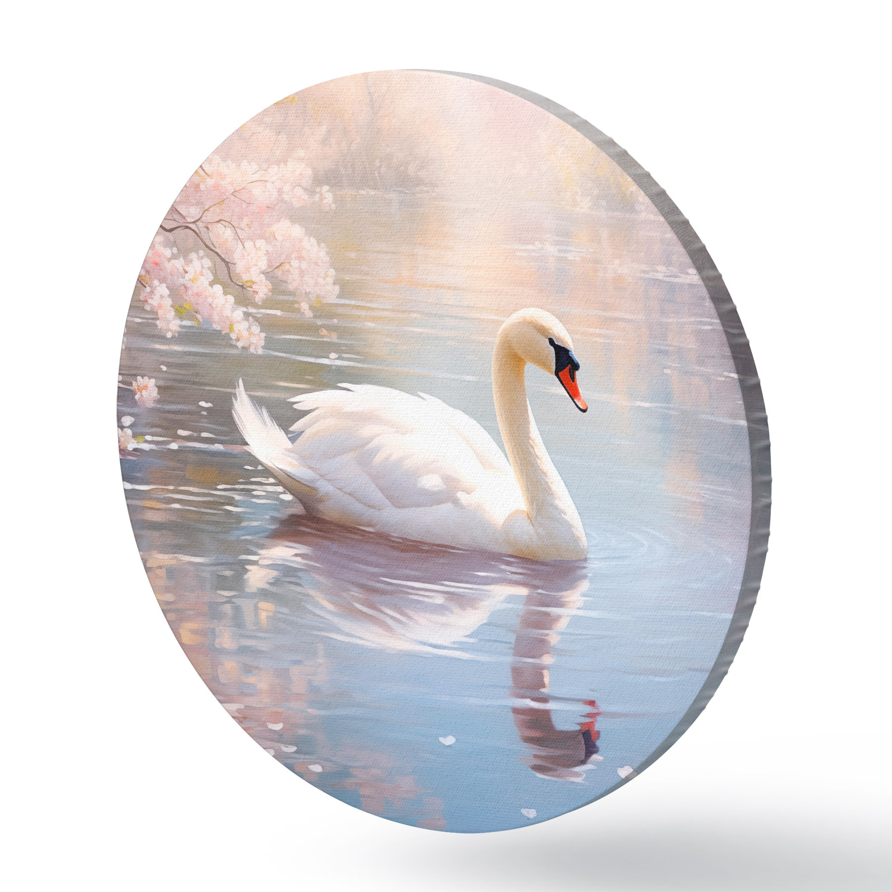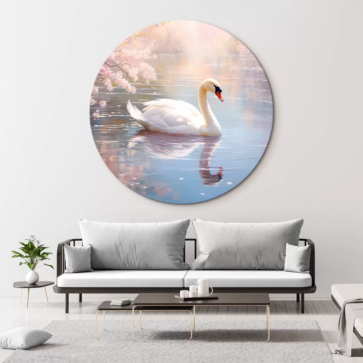 Cuadros redondos Un cisne blanco nadando en un lago con cerezos en flor, colores pastel r44396