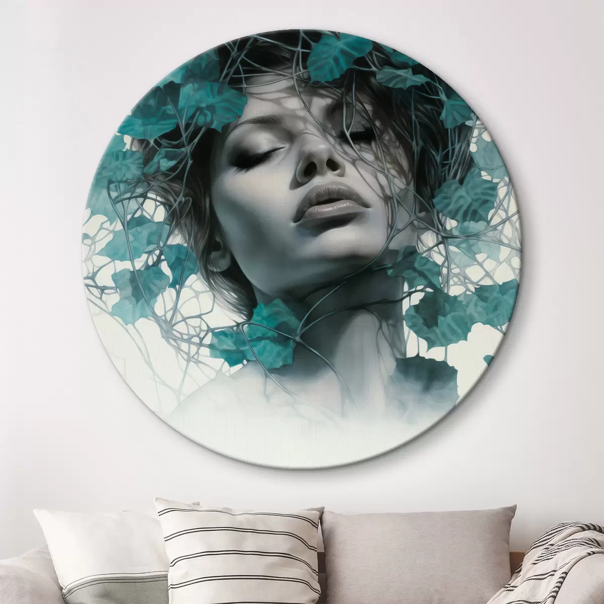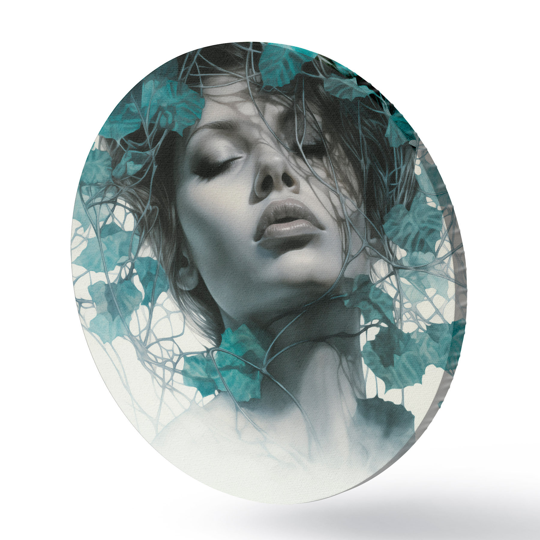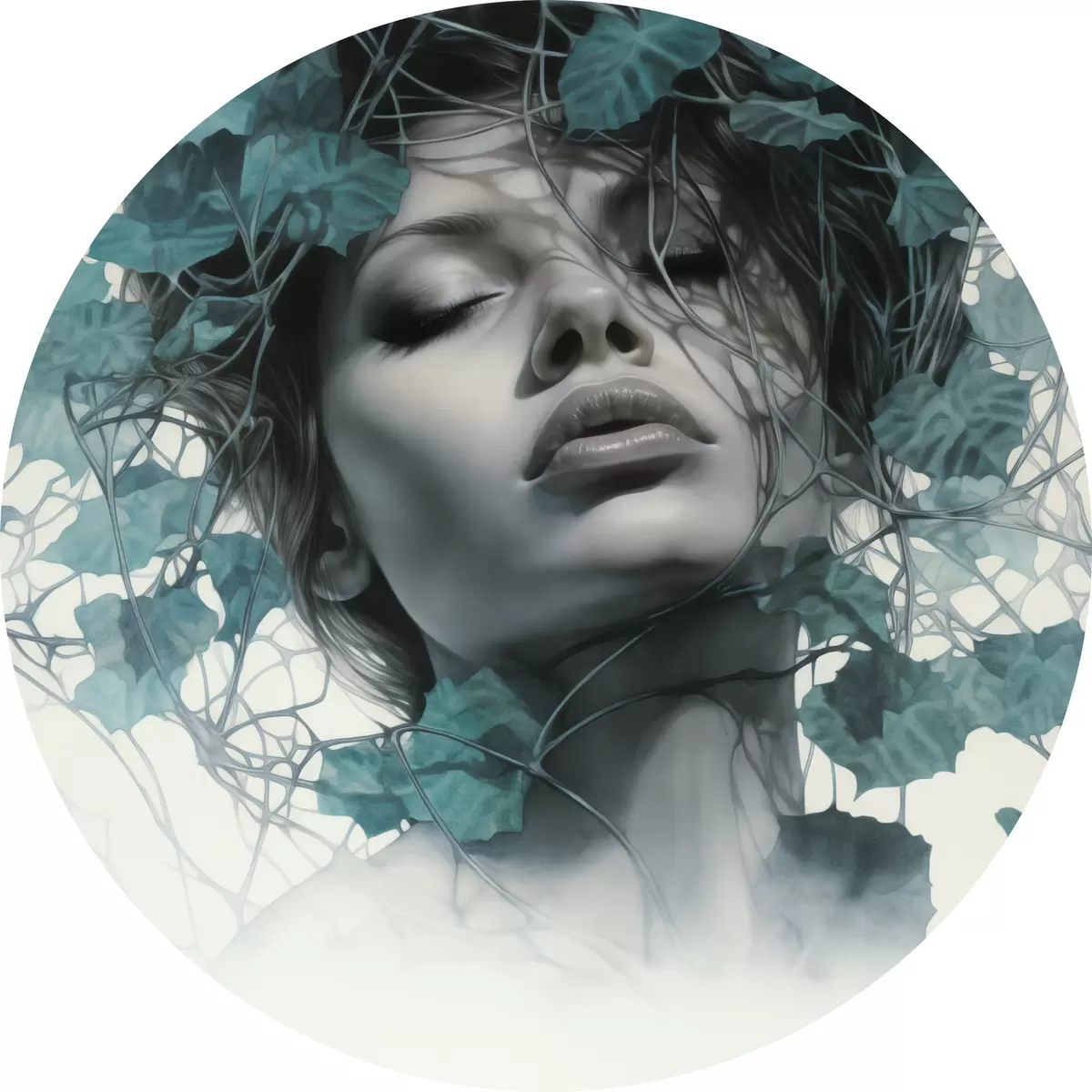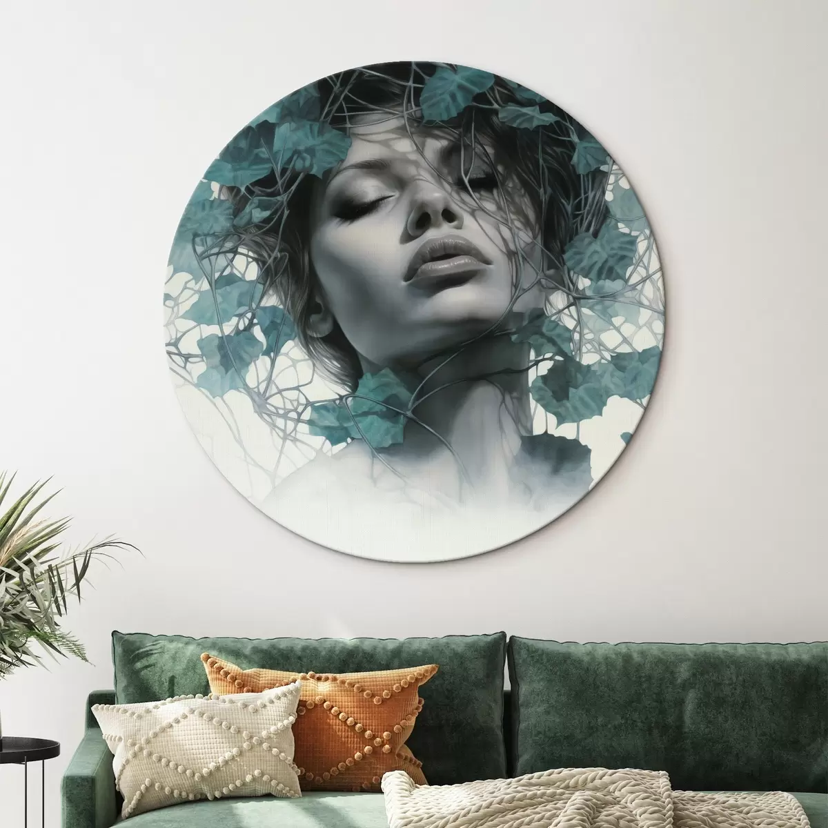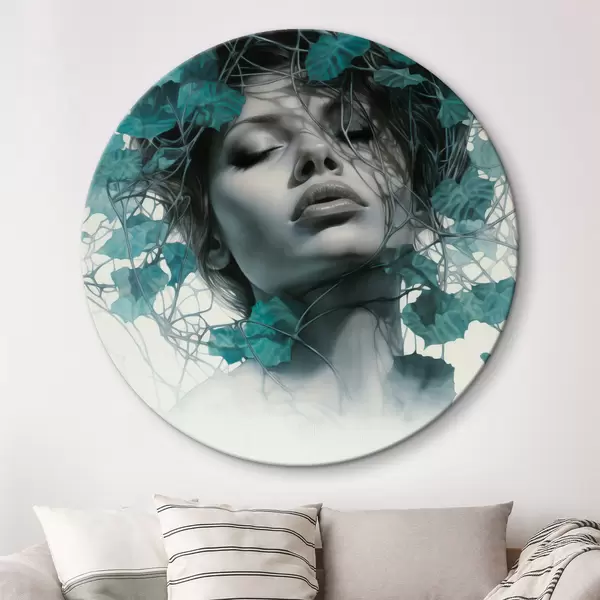 Cuadros redondos Retrato de una mujer con los ojos cerrados, rodeada de hojas y ramas verdes r44399