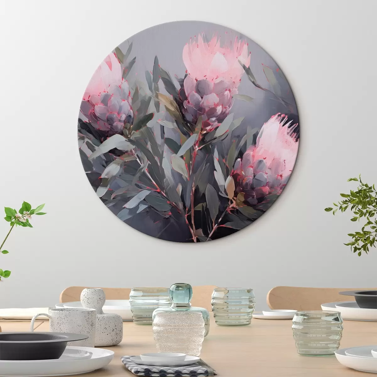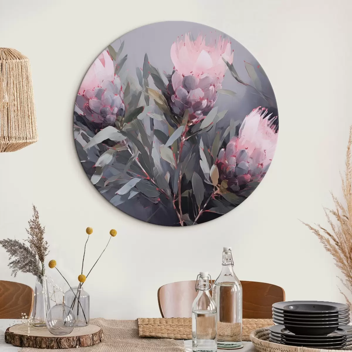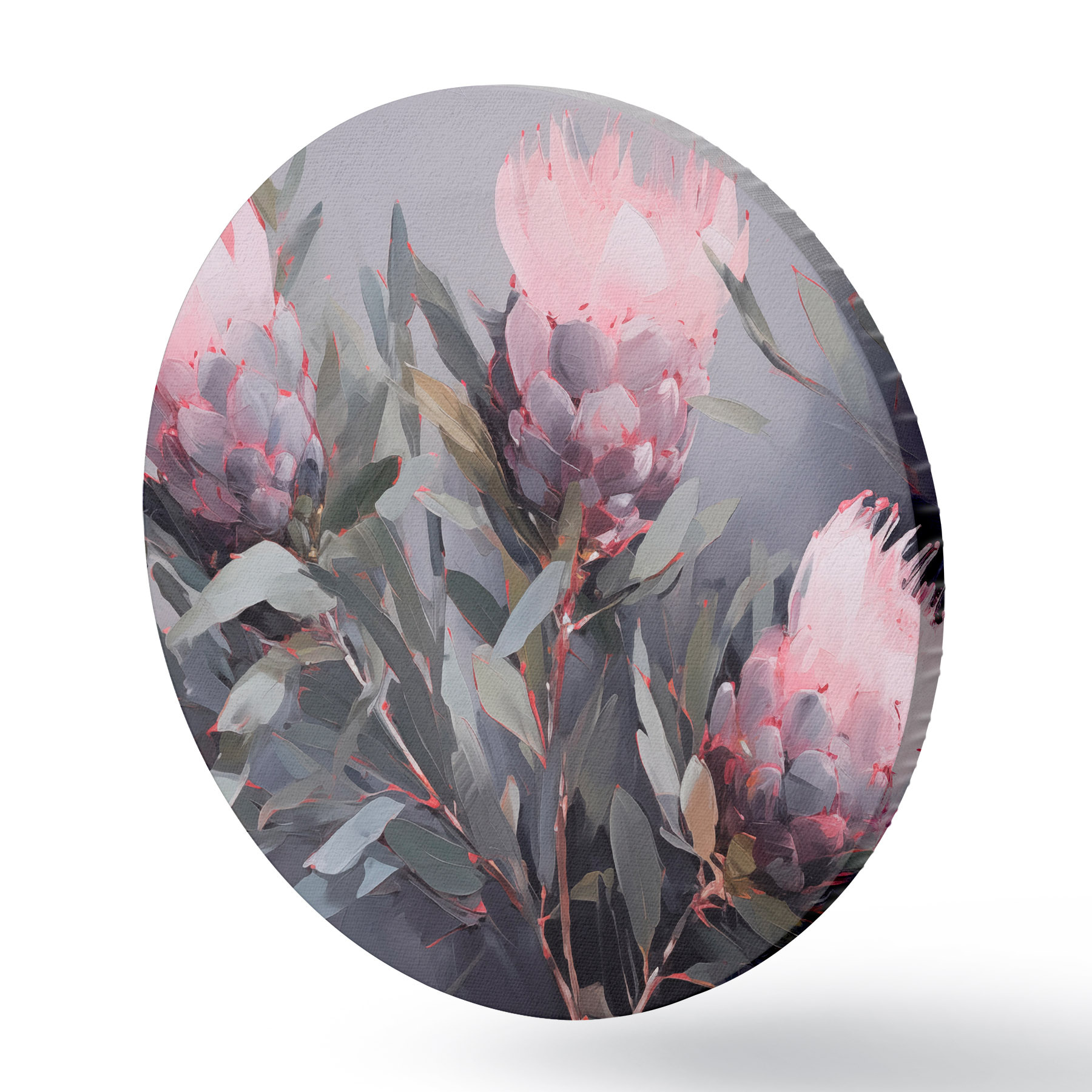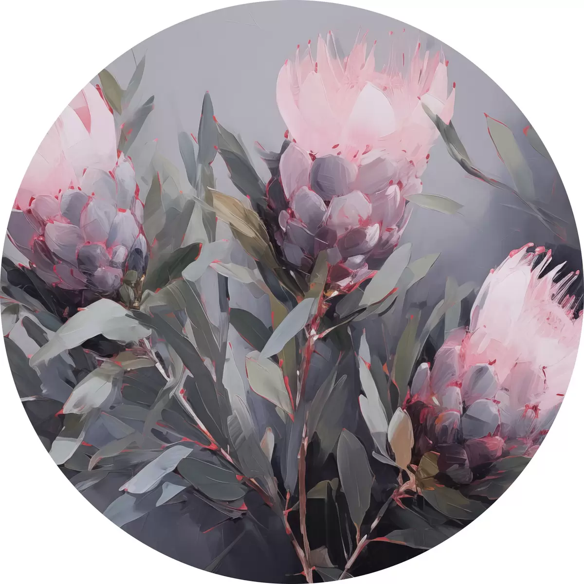 Cuadros redondos Flores de protea rosa con hojas verdes, pinceladas suaves, colores oscuros, composición elegante r44400