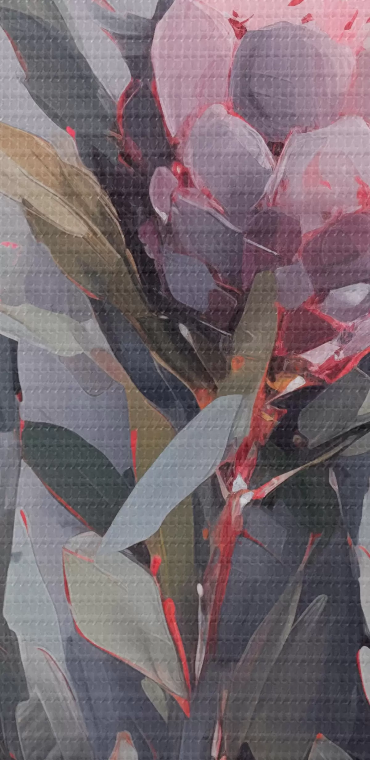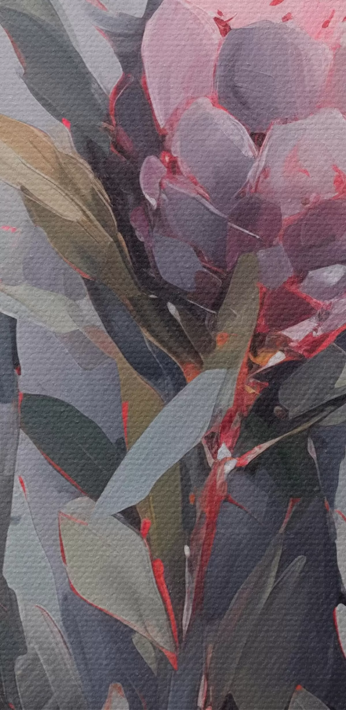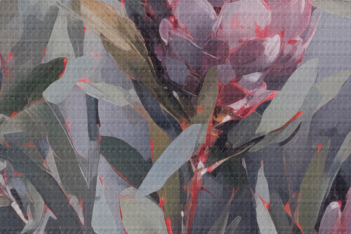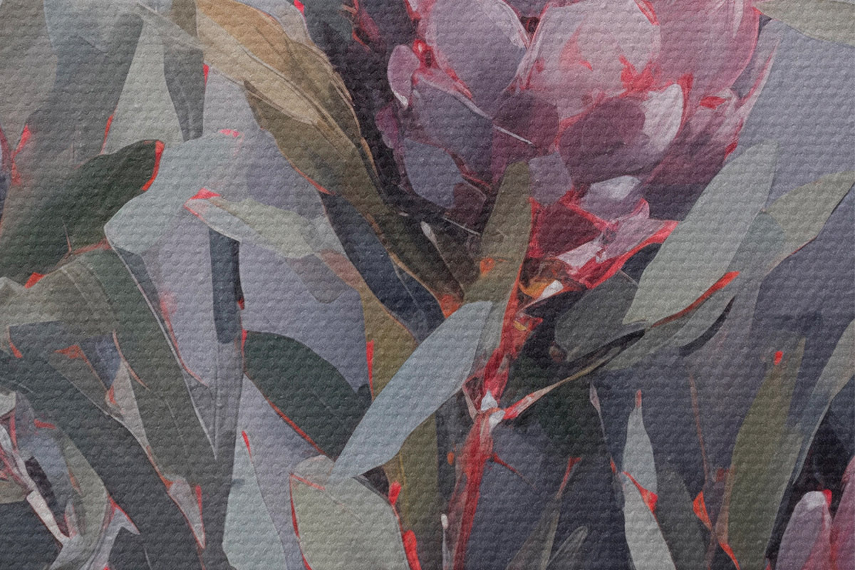Foto Flores de protea rosa con hojas verdes, pinceladas suaves, colores oscuros, composición elegante Nr r44400