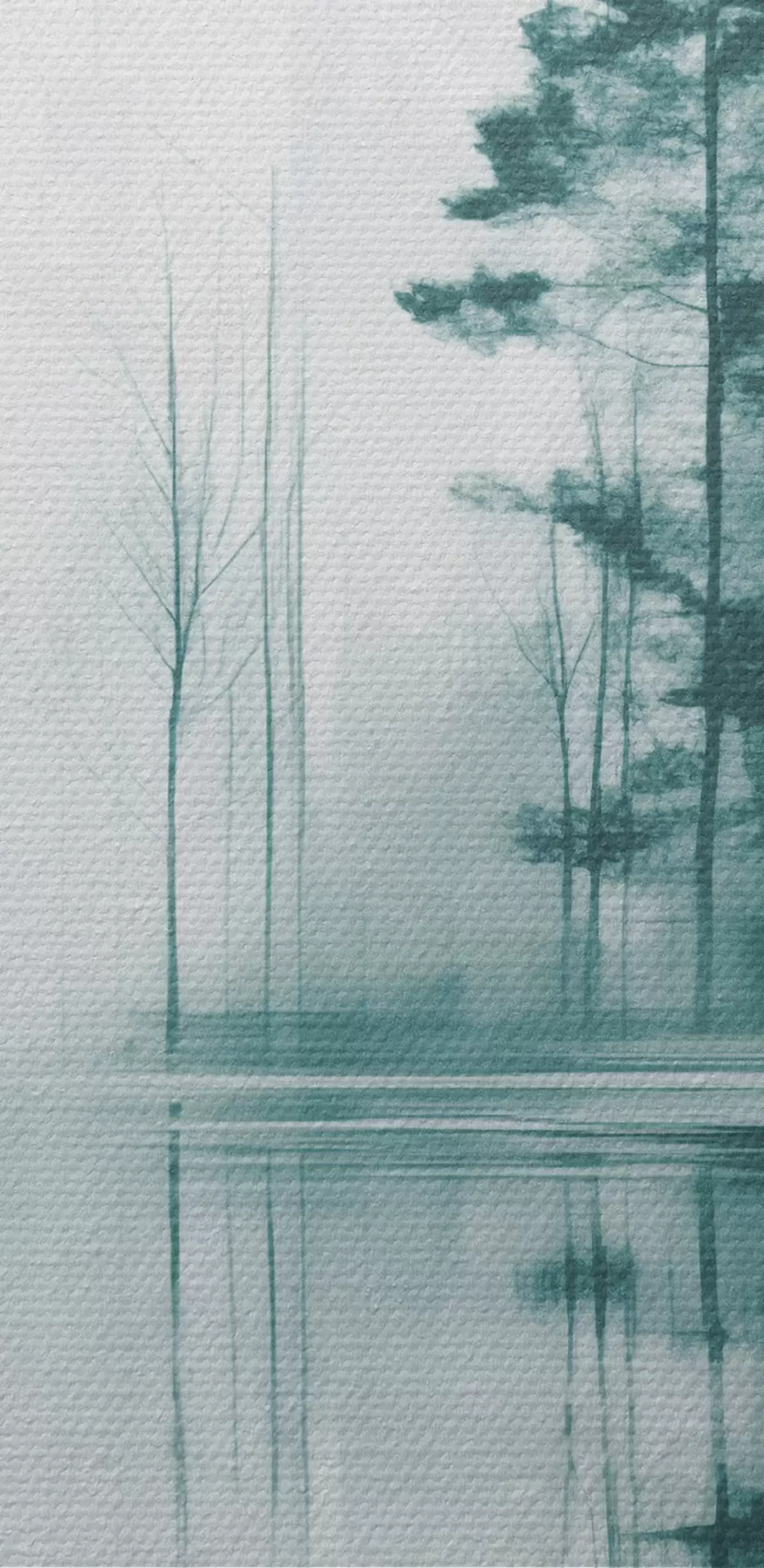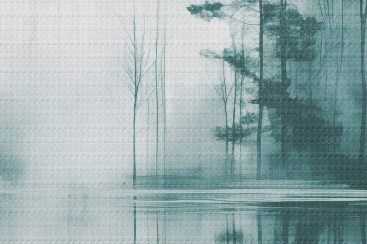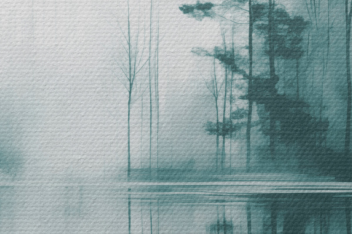 Foto Bosque abstracto con altos árboles reflejados en el agua, paleta de colores apagados Nr r44403