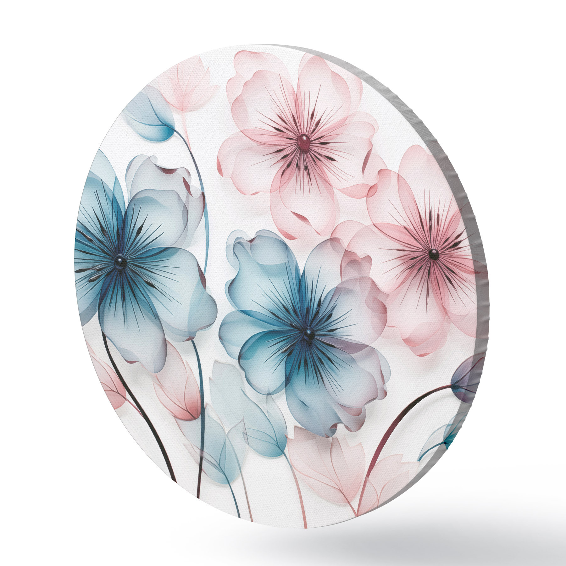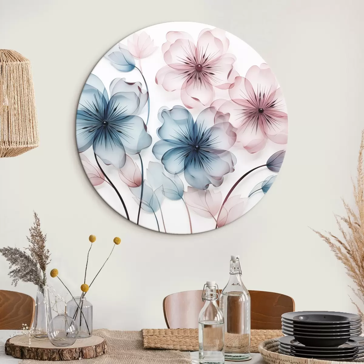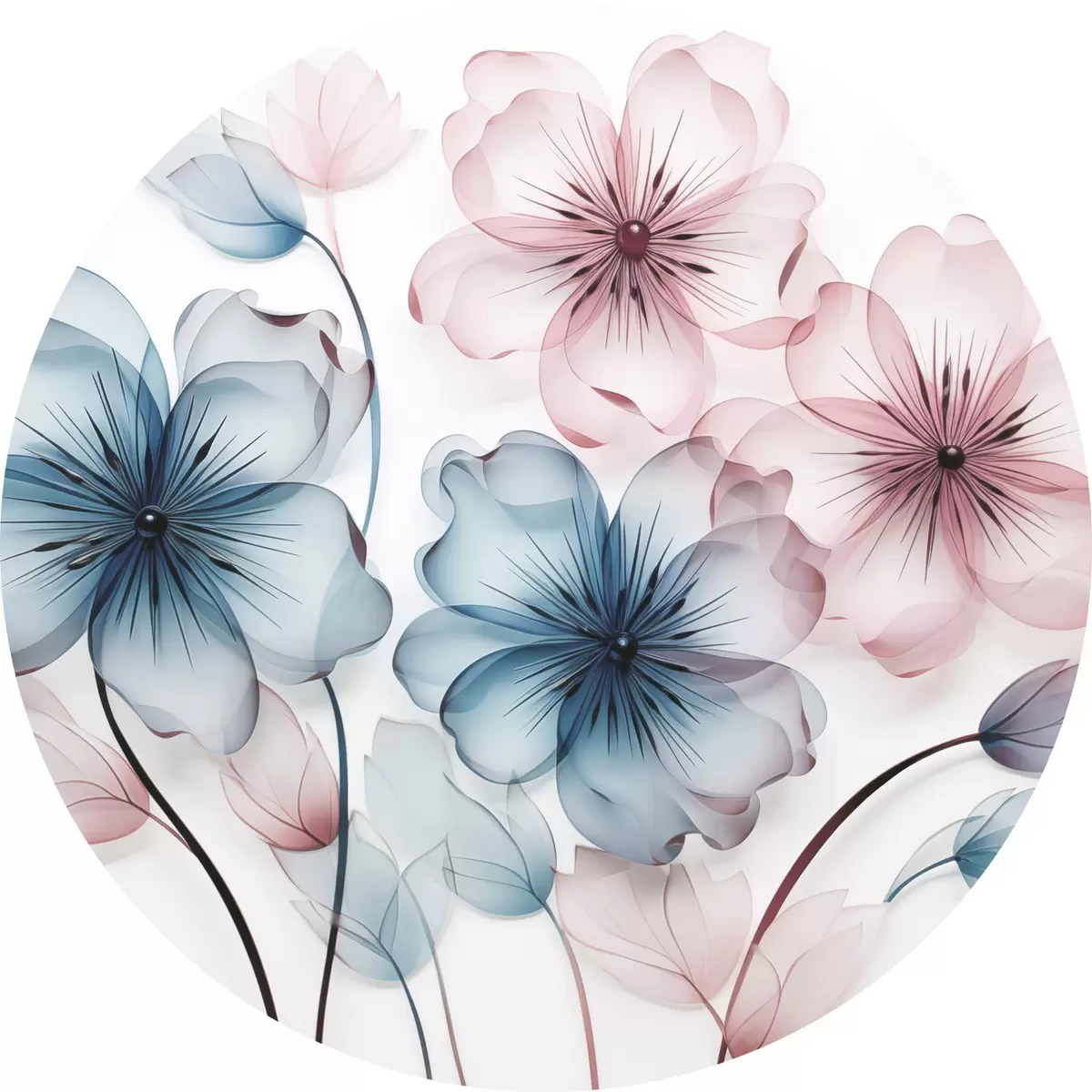 Cuadros redondos Flores translúcidas de color rosa y azul apagados con estambres y tallos visibles r44405