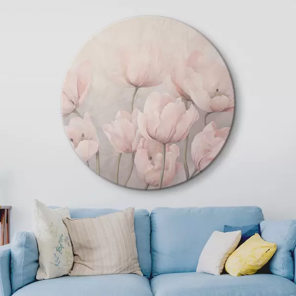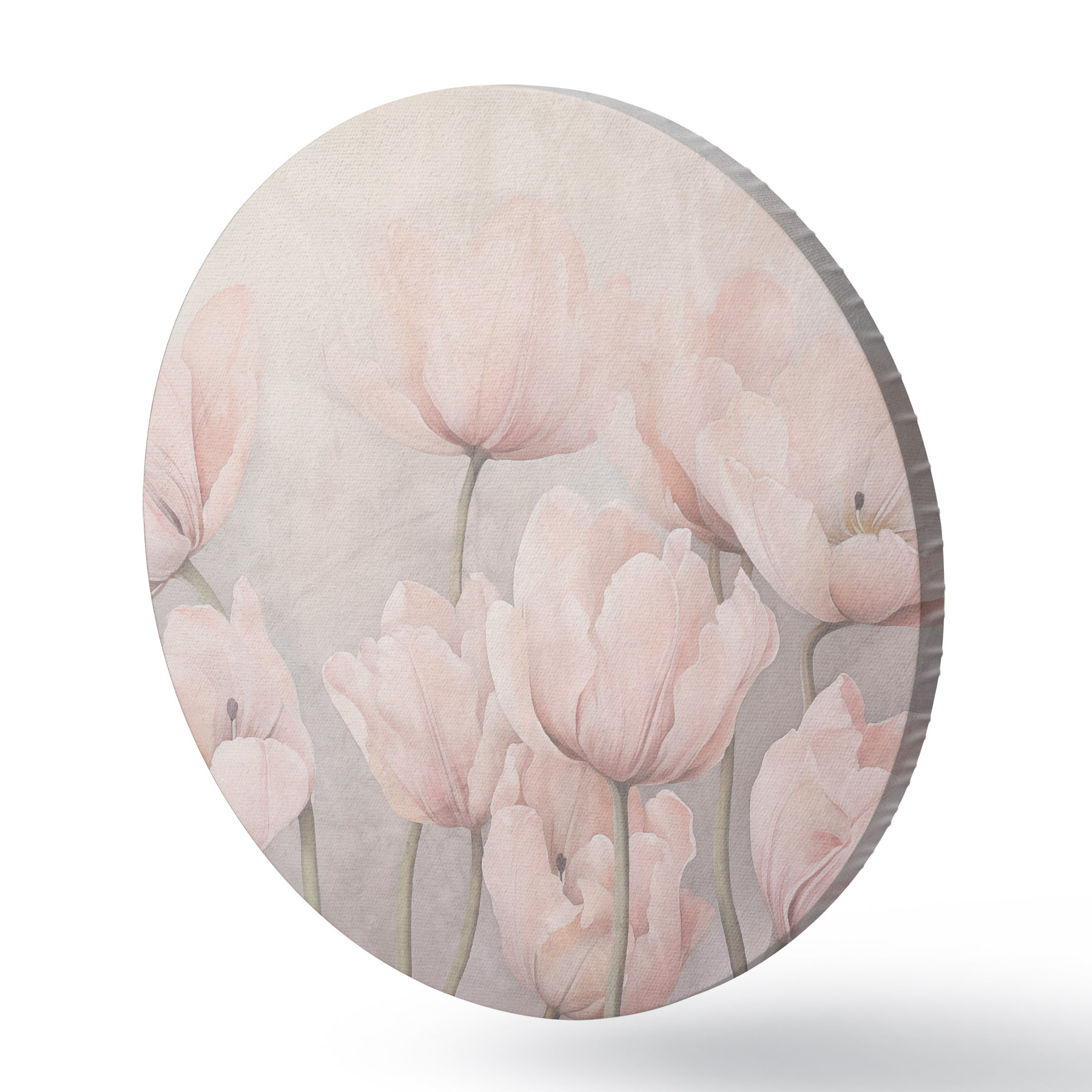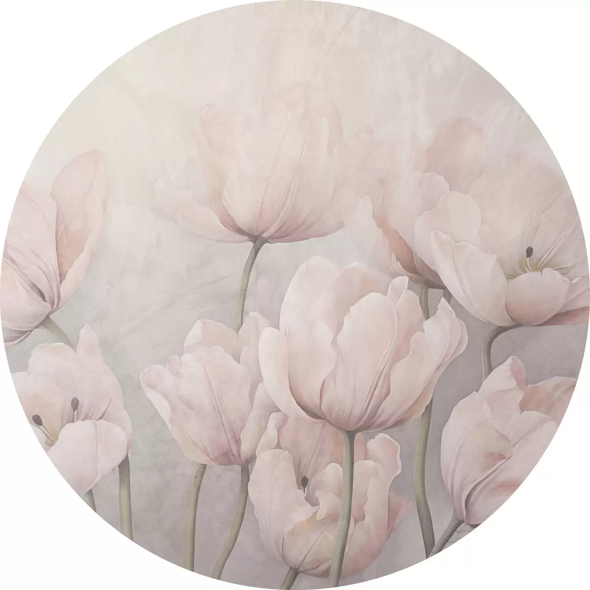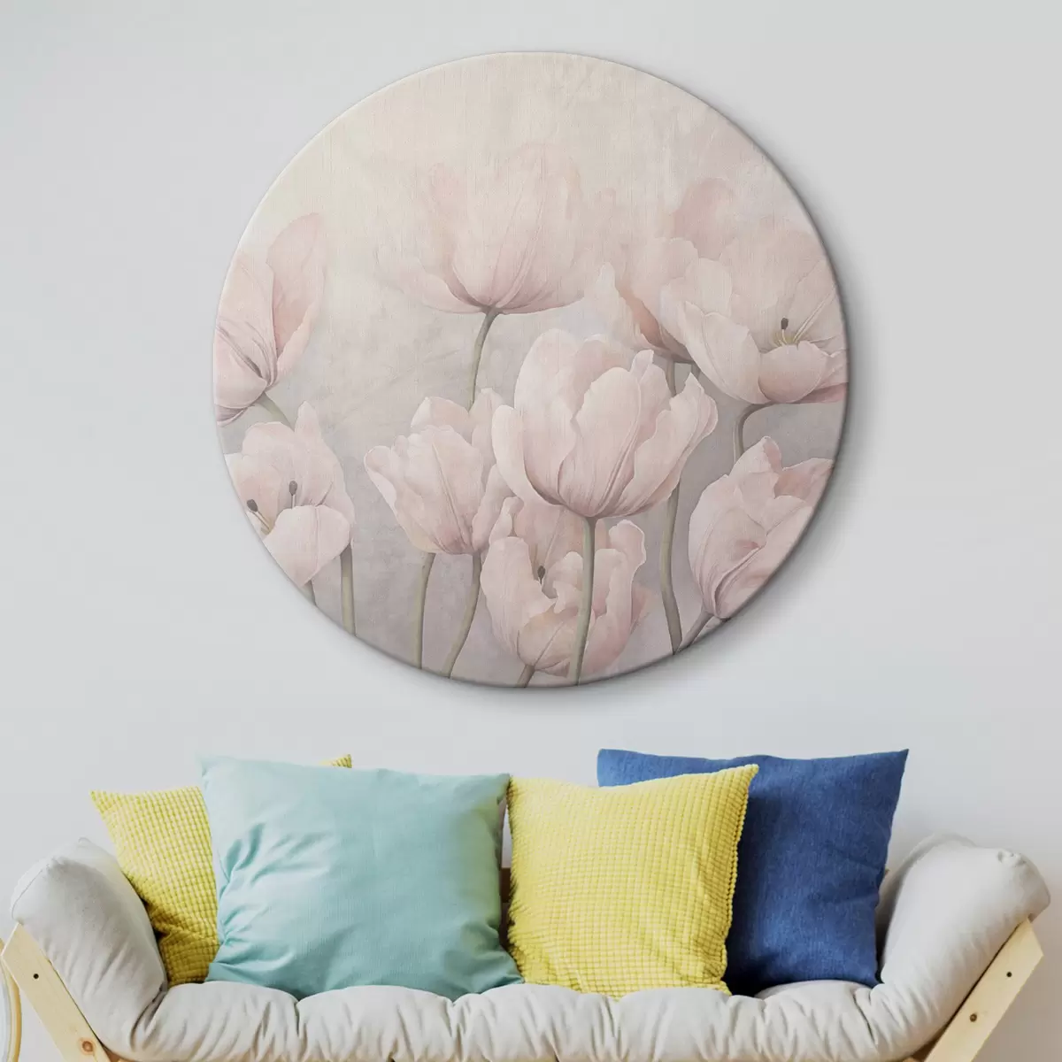 Cuadros redondos Tulipanes rosas con textura vintage y tallos largos, colores suaves y apagados, fondo gris claro r44407