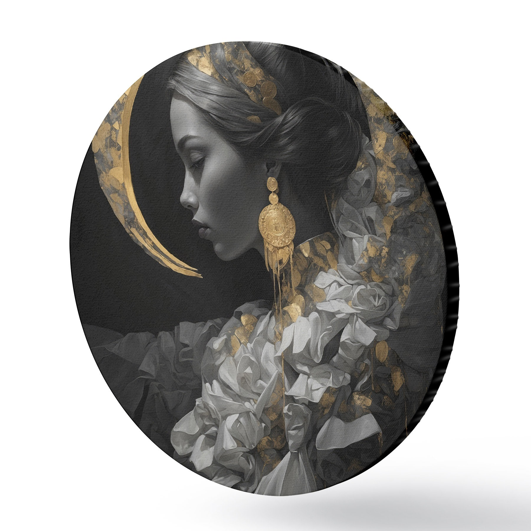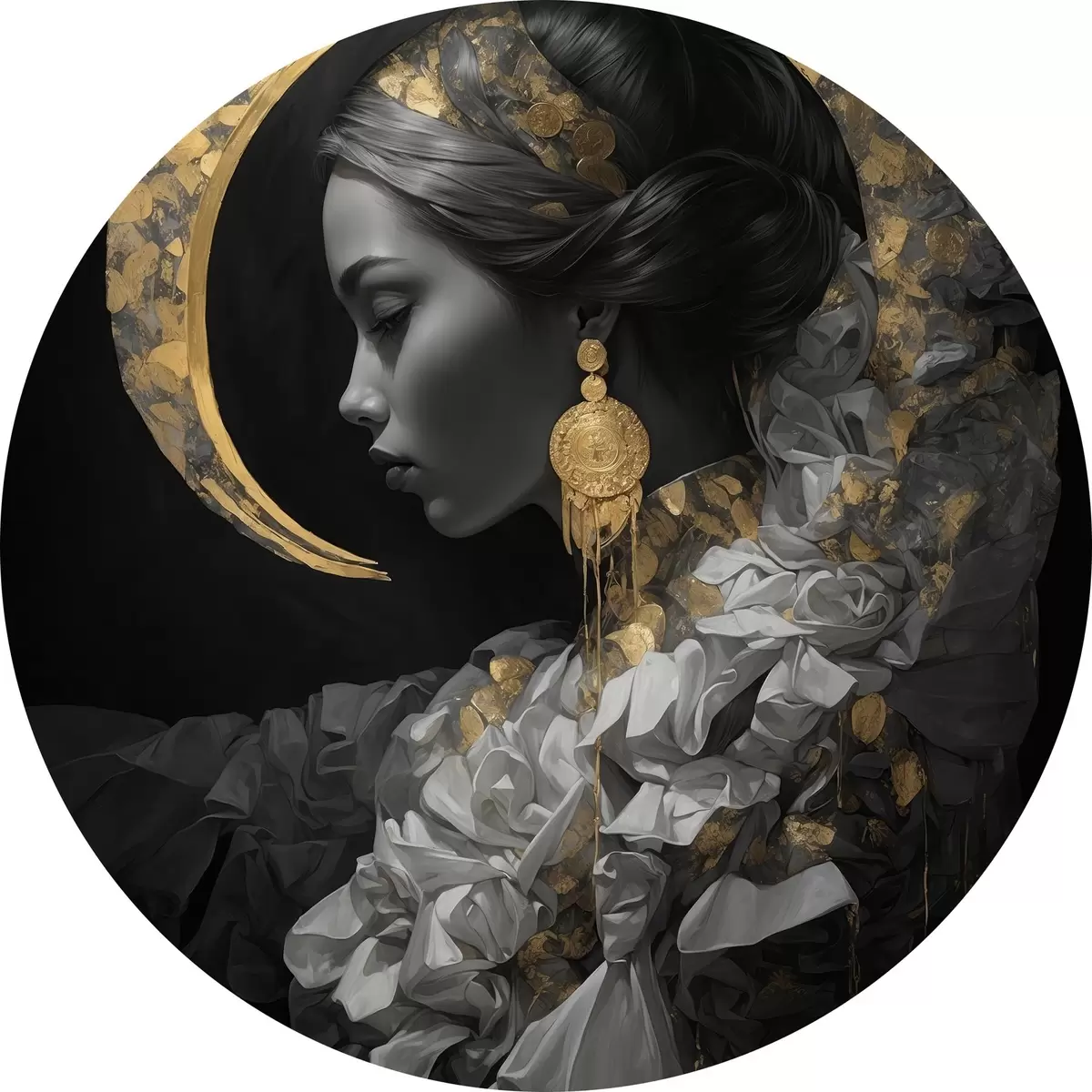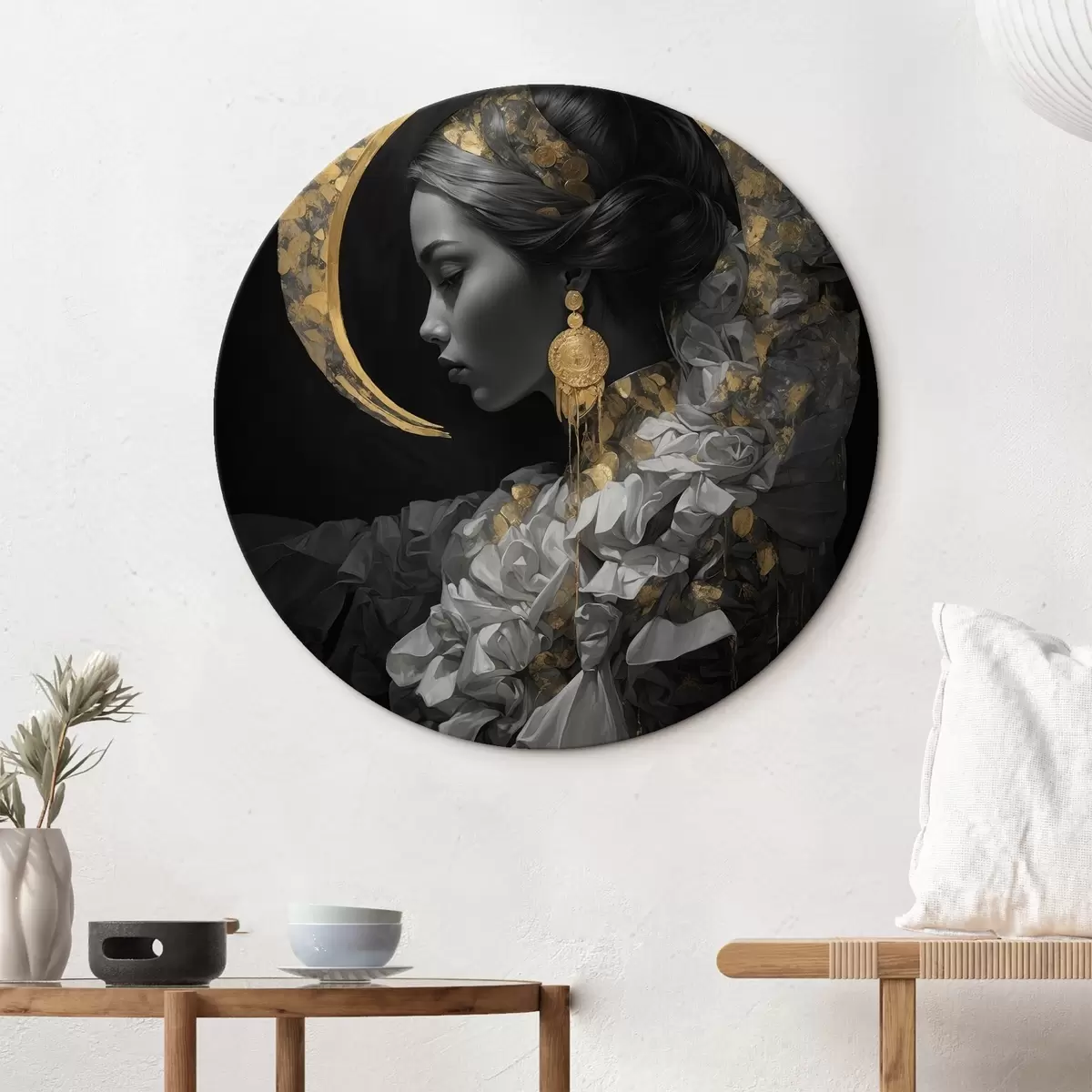 Cuadros redondos Chica y luna creciente amarilla sobre fondo negro r44449