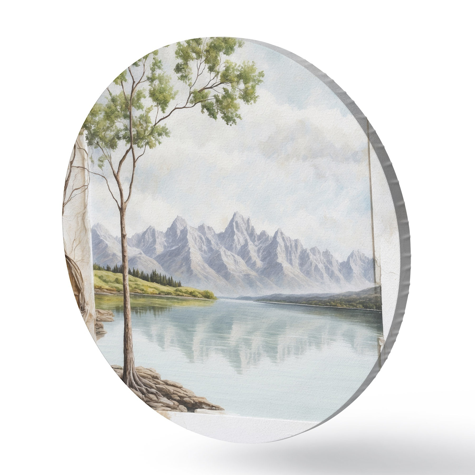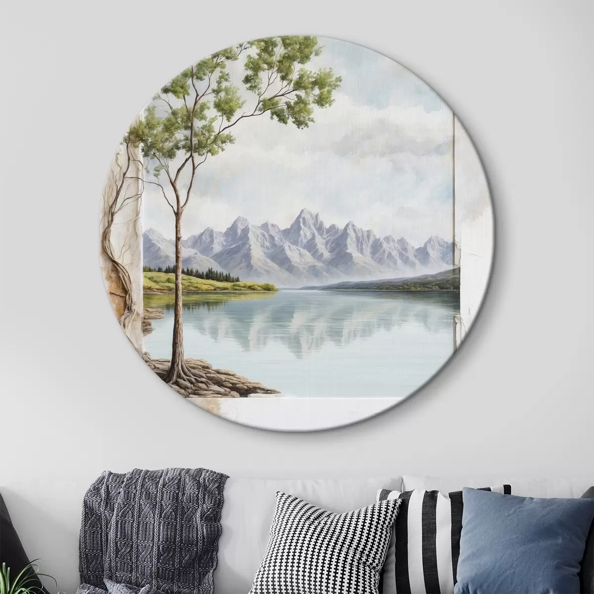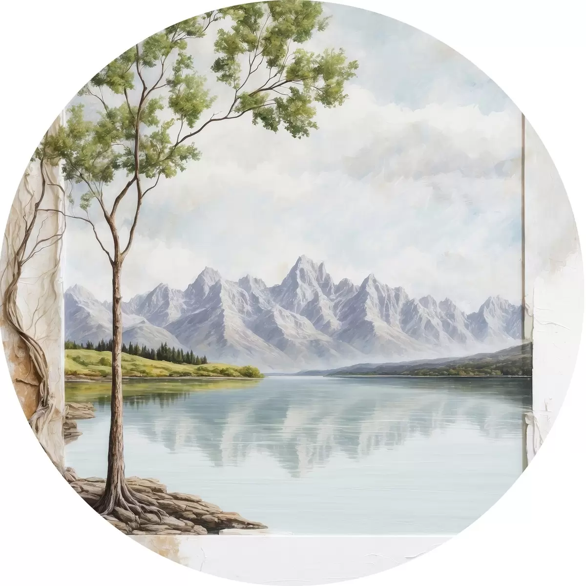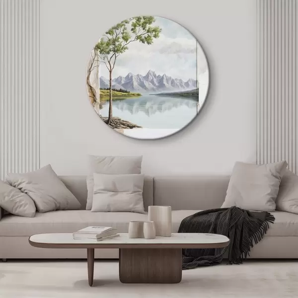 Cuadros redondos Vista sobre el lago y montañas nevadas en el encuadre r44458