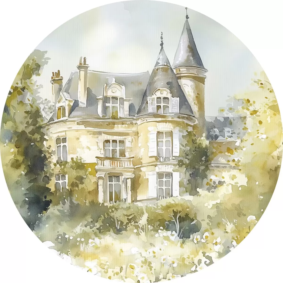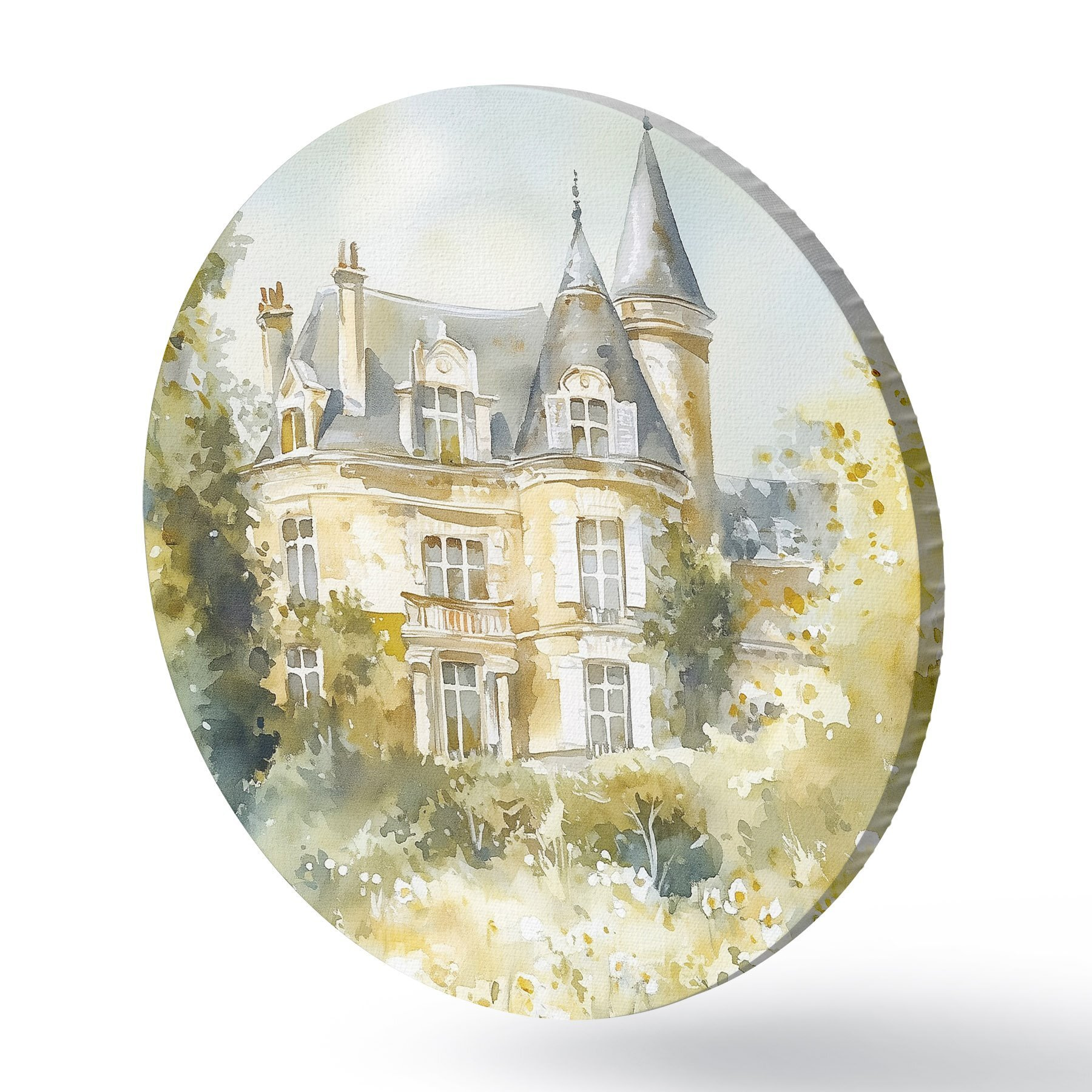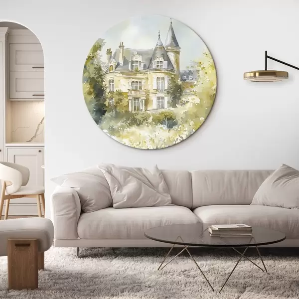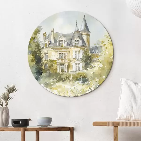 Cuadros redondos Hermoso castillo con vegetación y flores blancas, estilo acuarela r44506