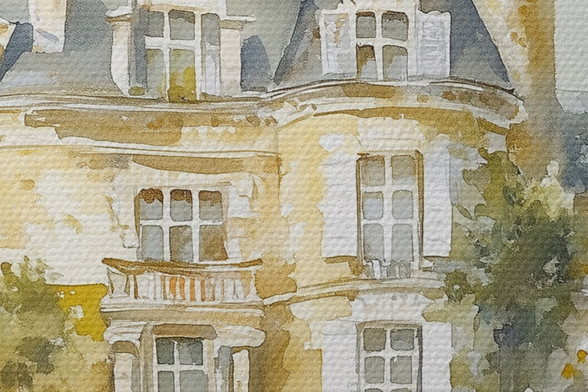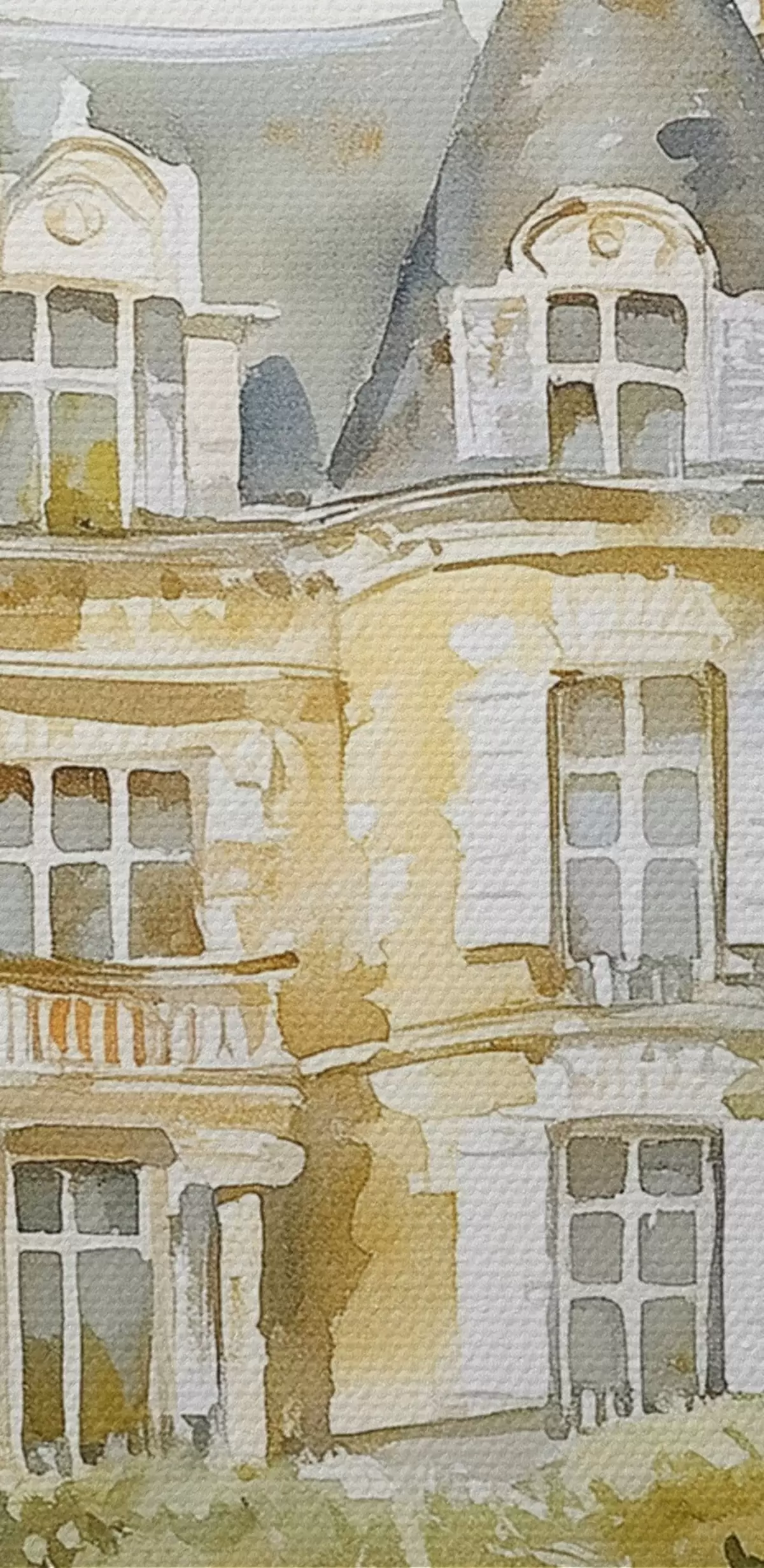 Foto Hermoso castillo con vegetación y flores blancas, estilo acuarela Nr r44506