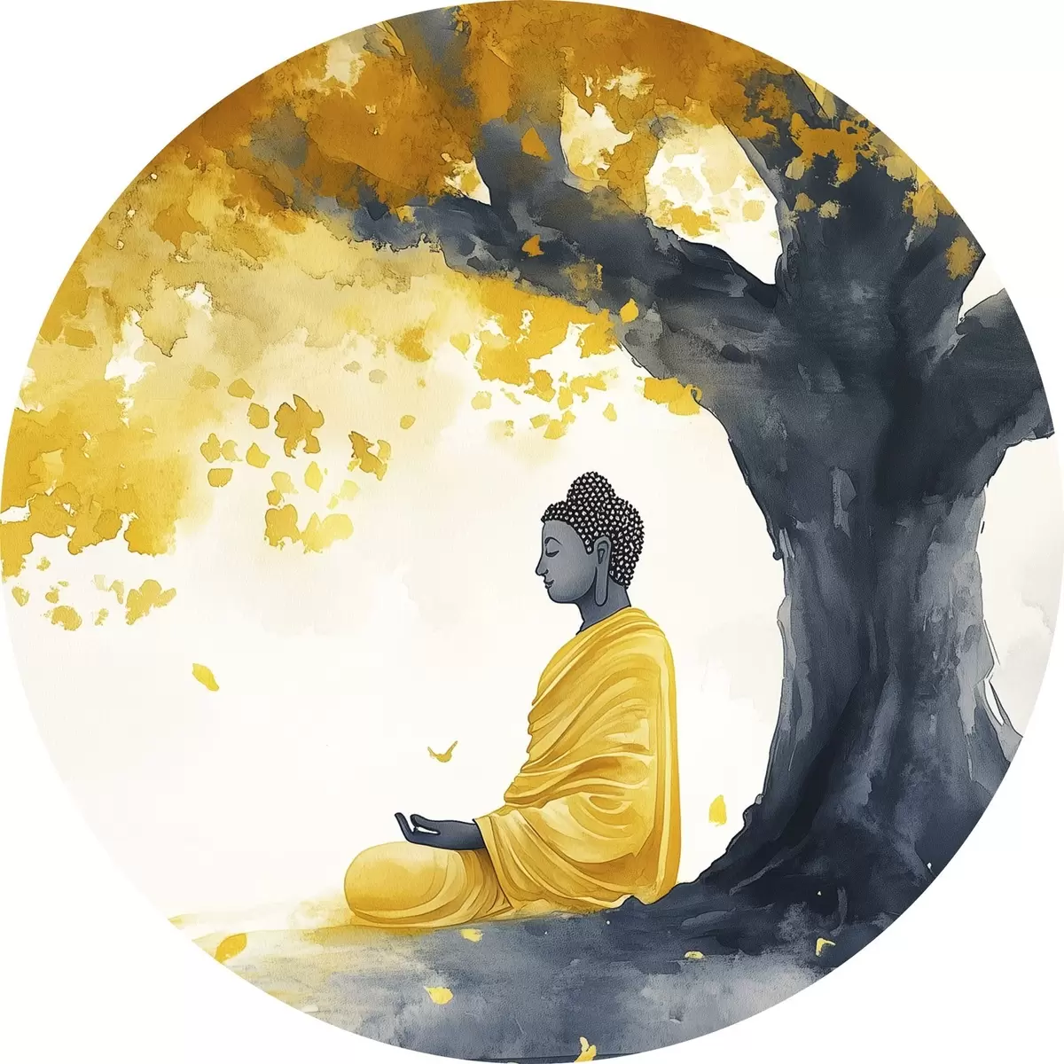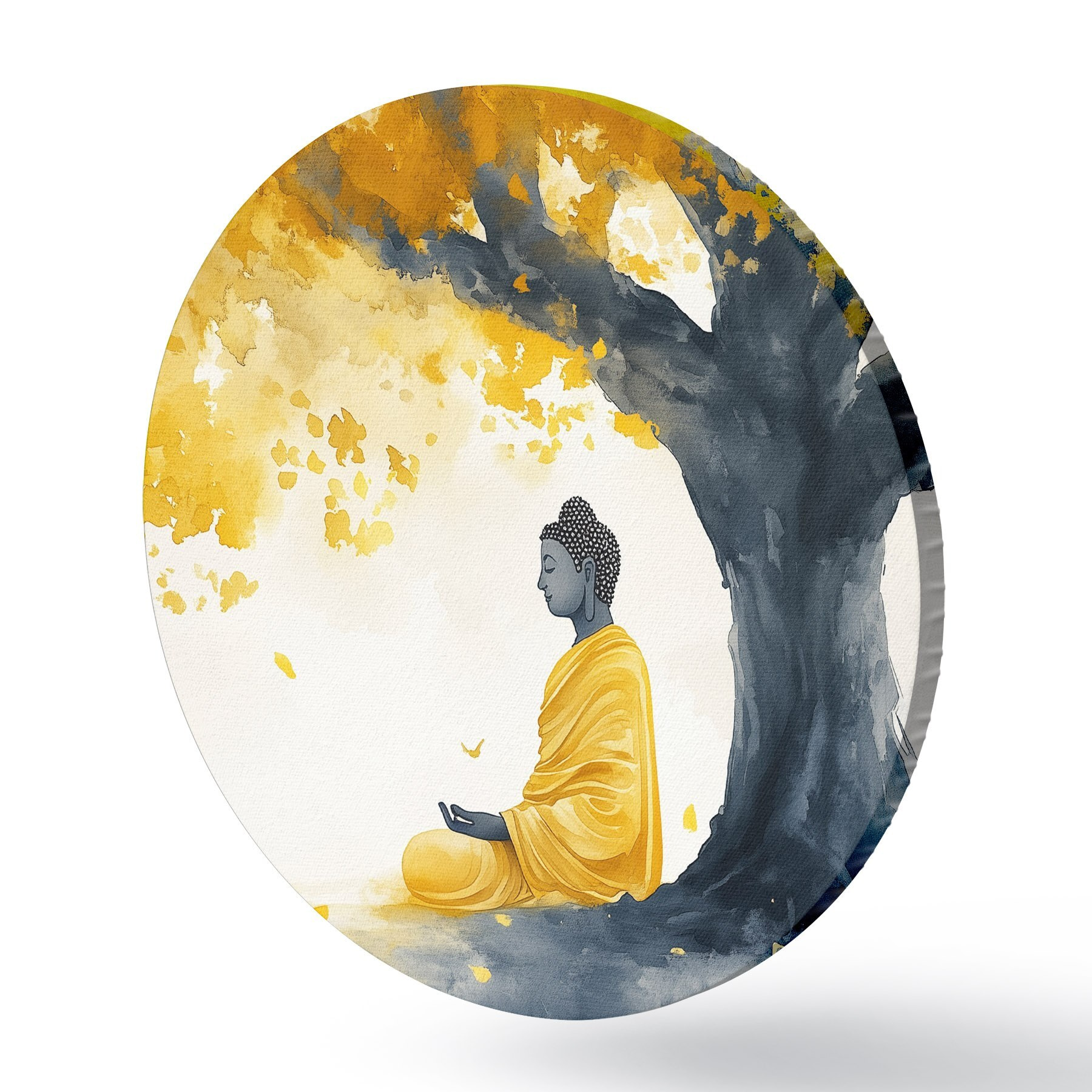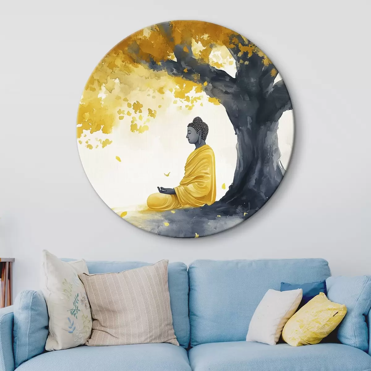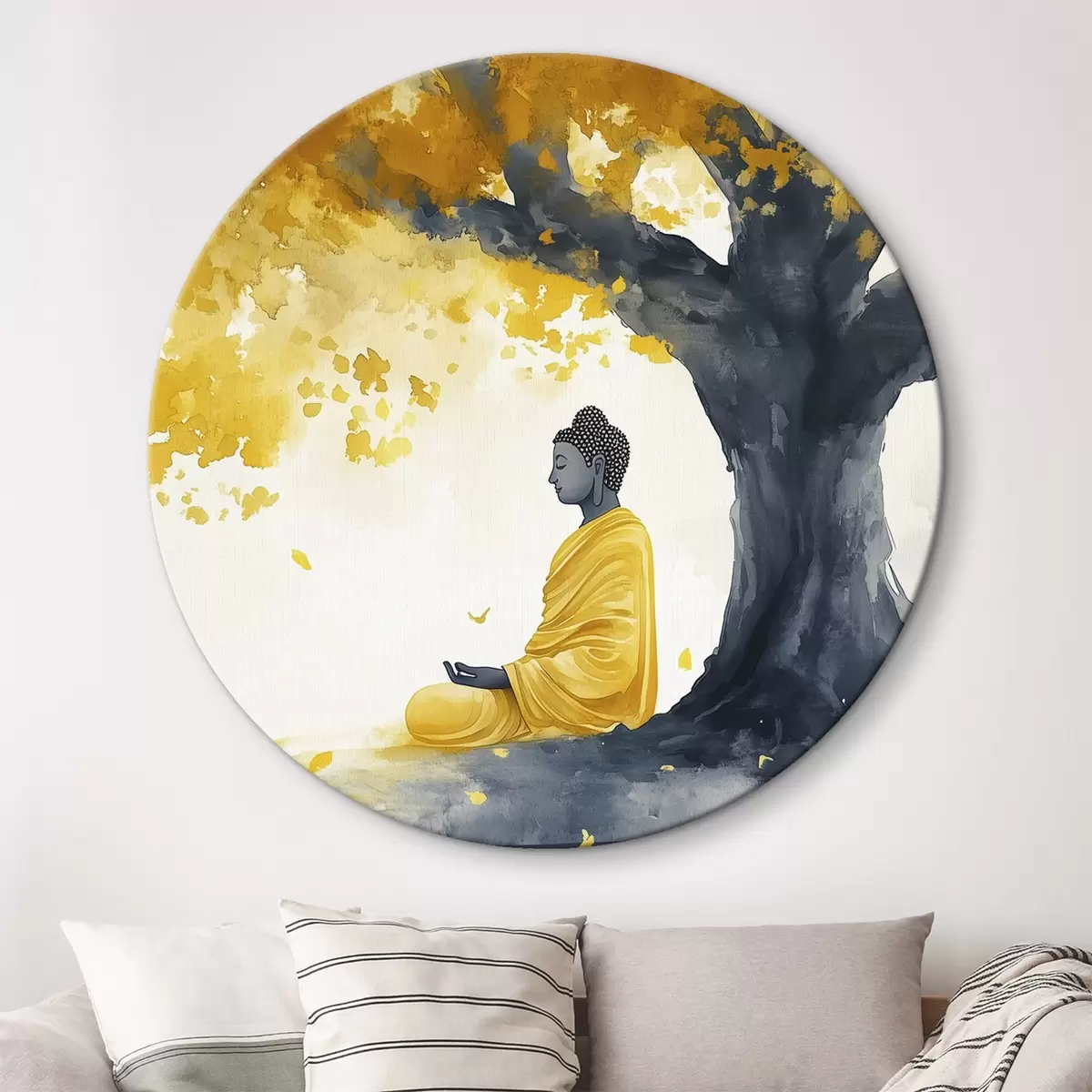 Cuadros redondos Buda meditando bajo el árbol, colores amarillo y gris r44509