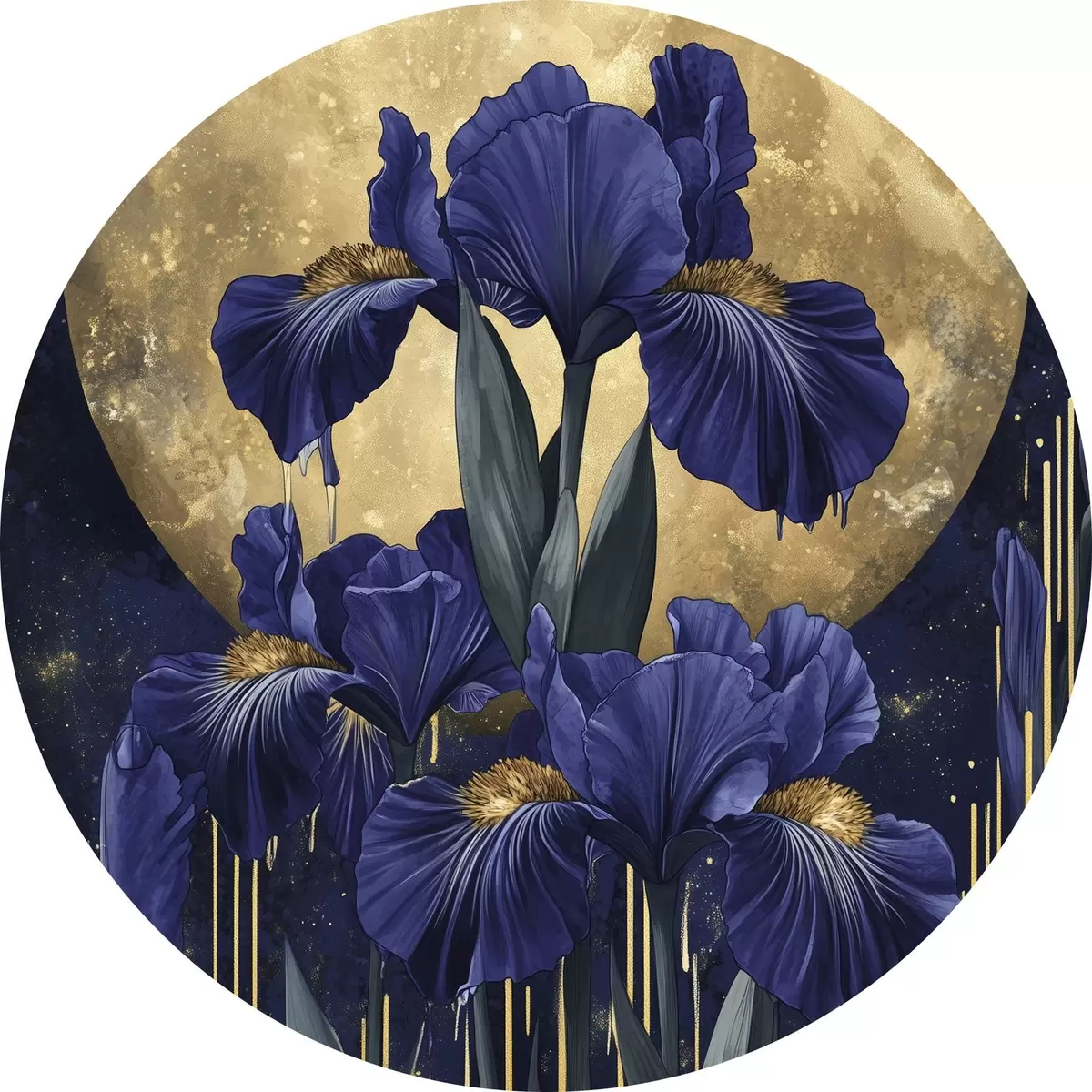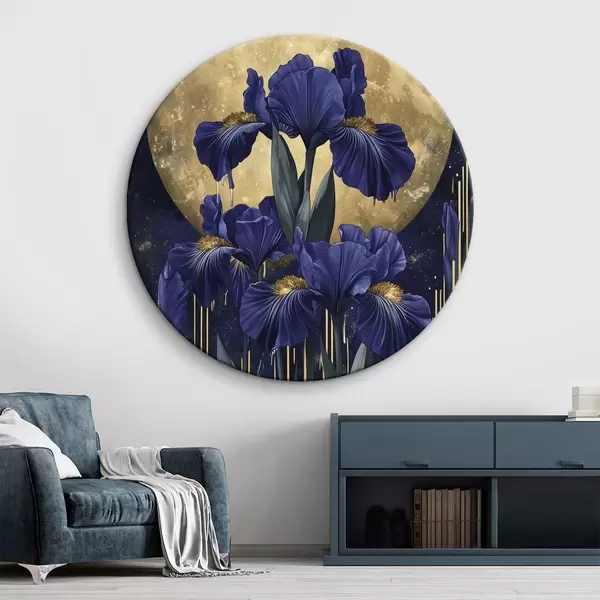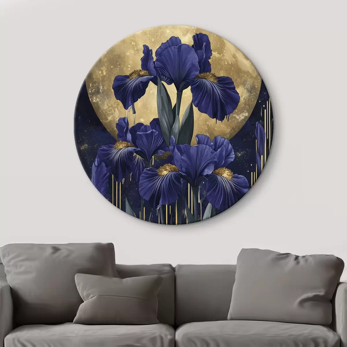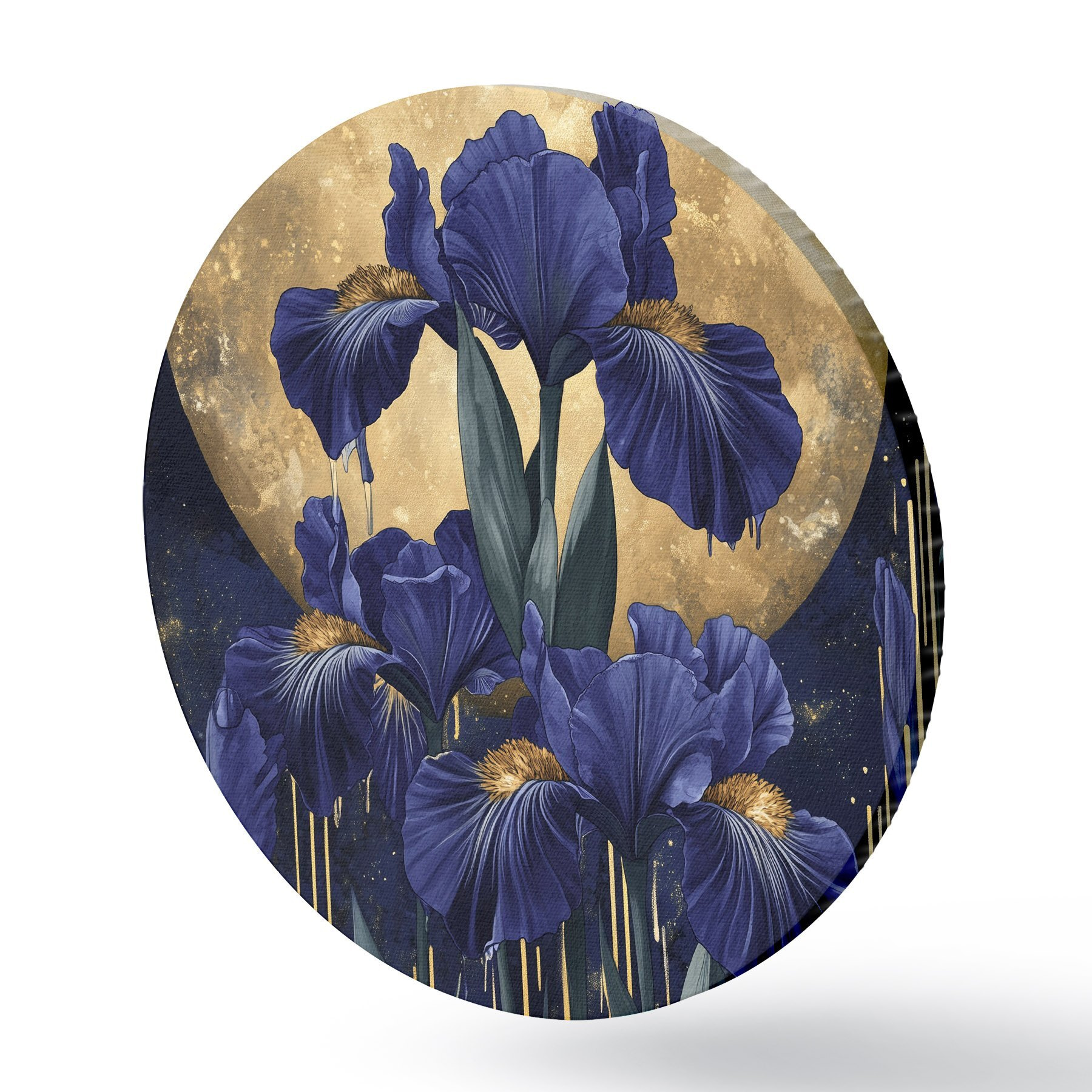 Cuadros redondos Flores de iris, luna brillante, cielo nocturno, colores azules r44510