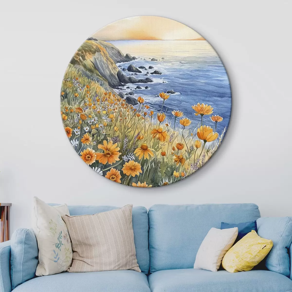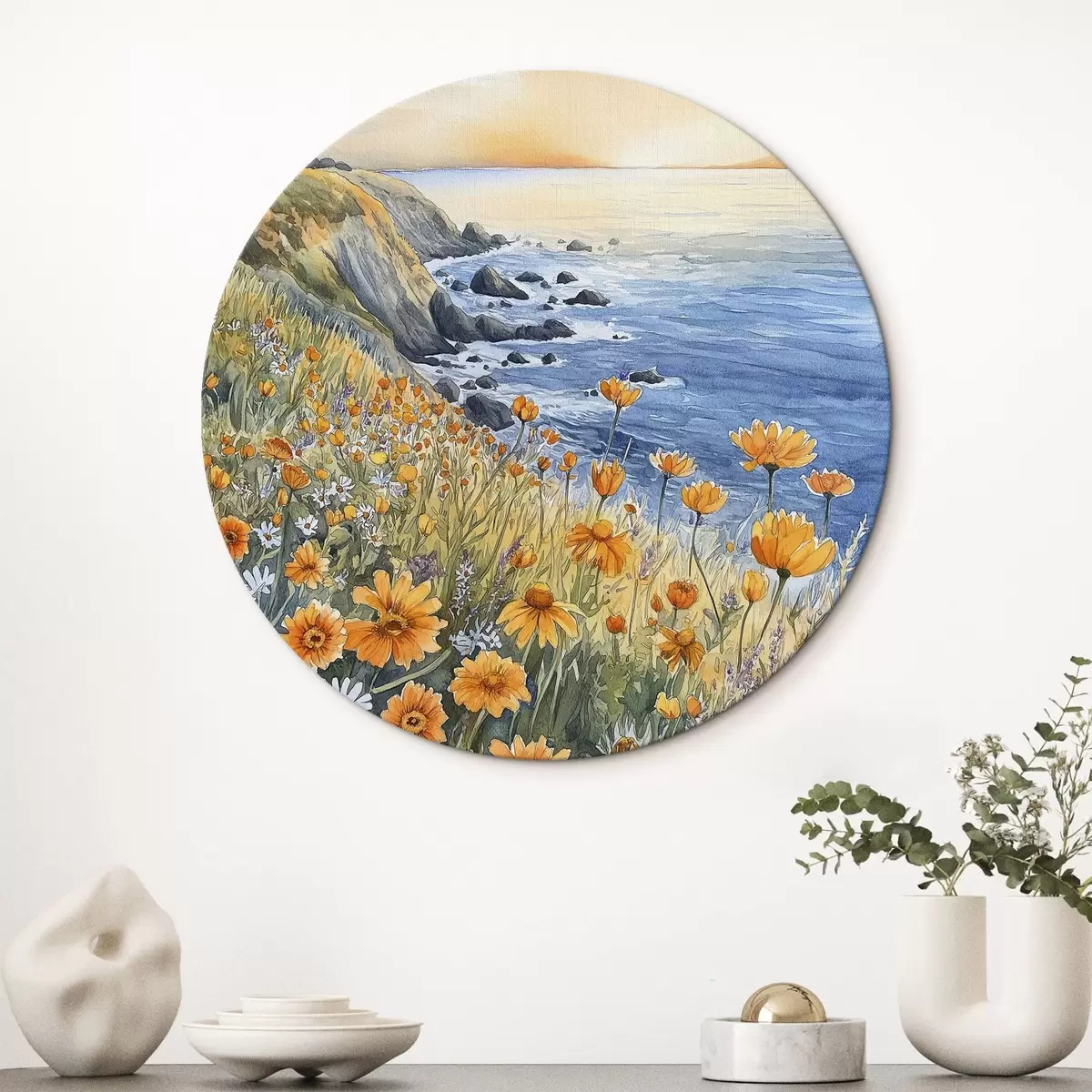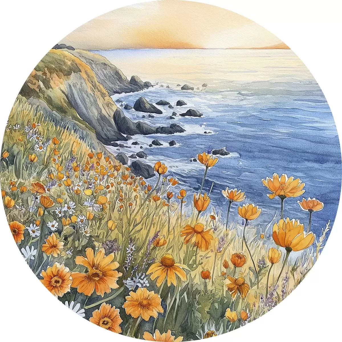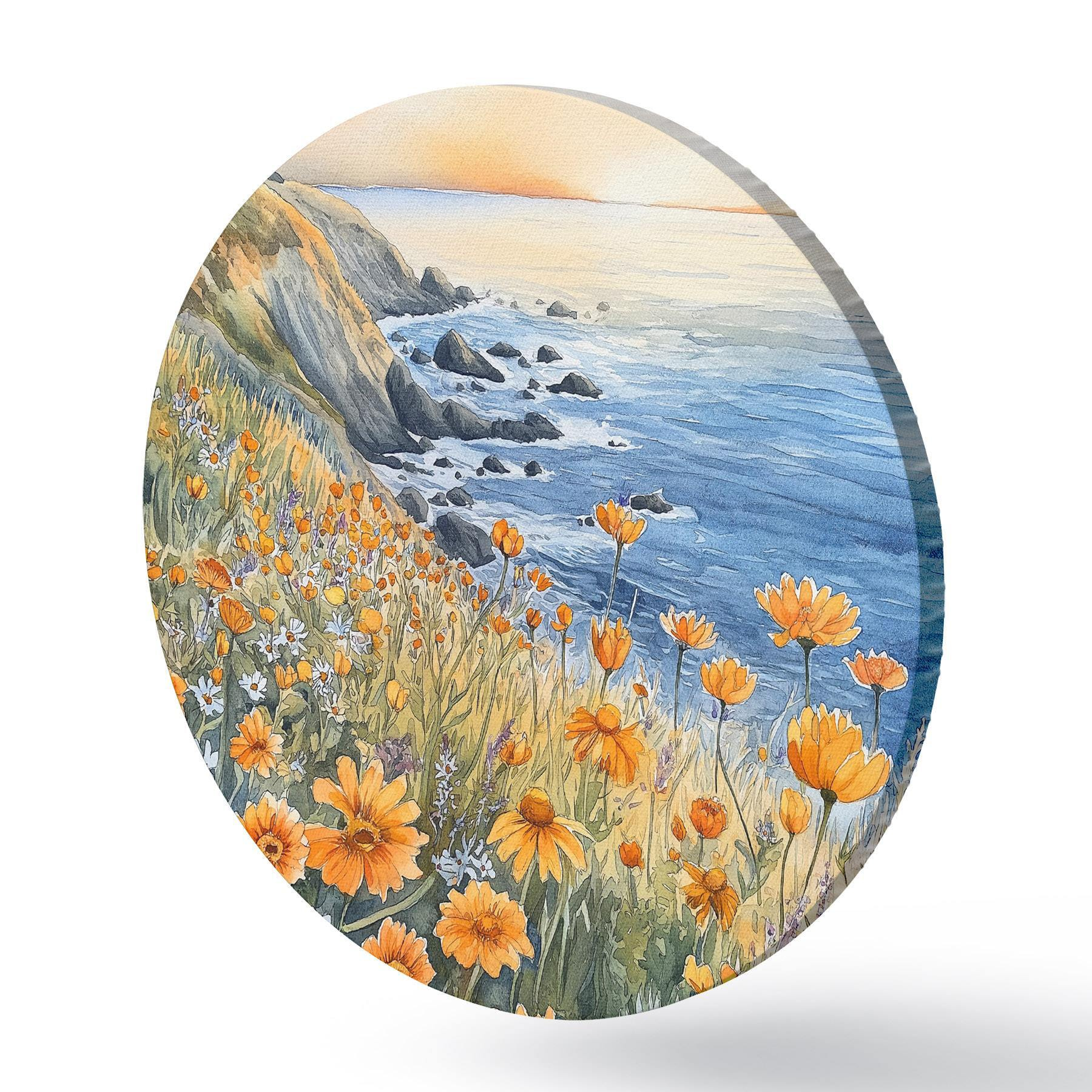 Cuadros redondos Acantilado con flores naranjas, costa oceánica, Portugal, estilo acuarela r44604