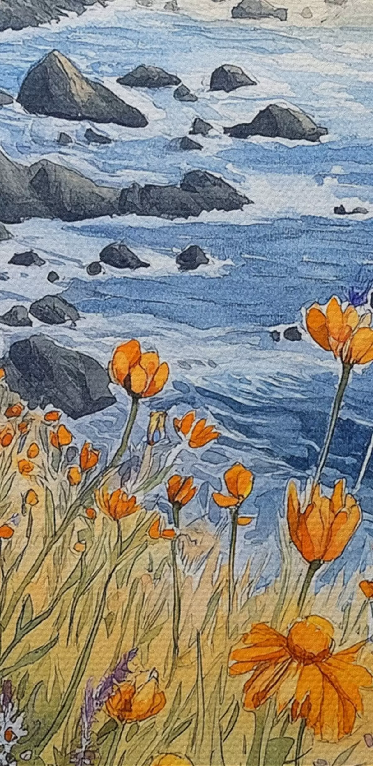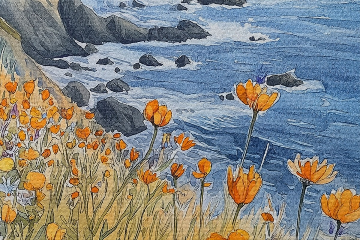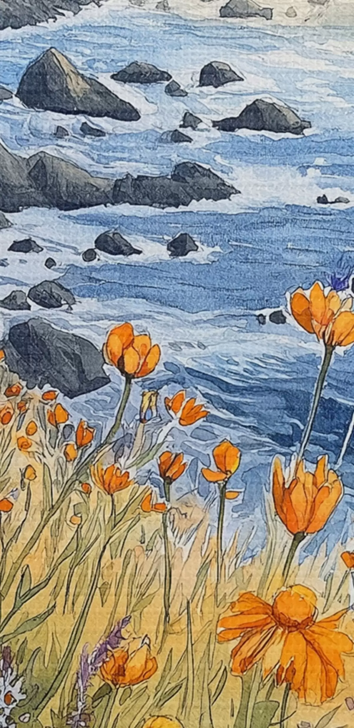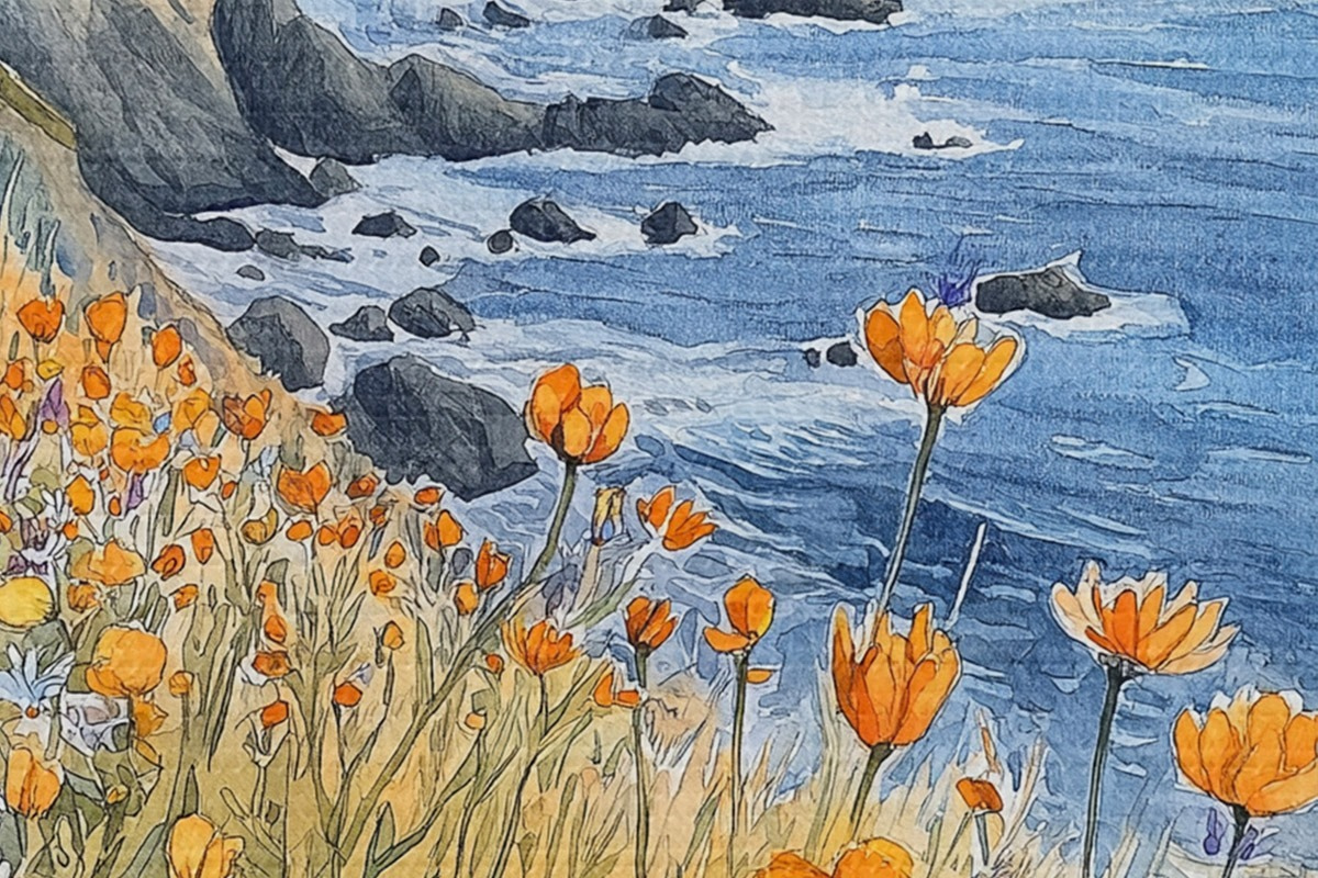 Foto Acantilado con flores naranjas, costa oceánica, Portugal, estilo acuarela Nr r44604
