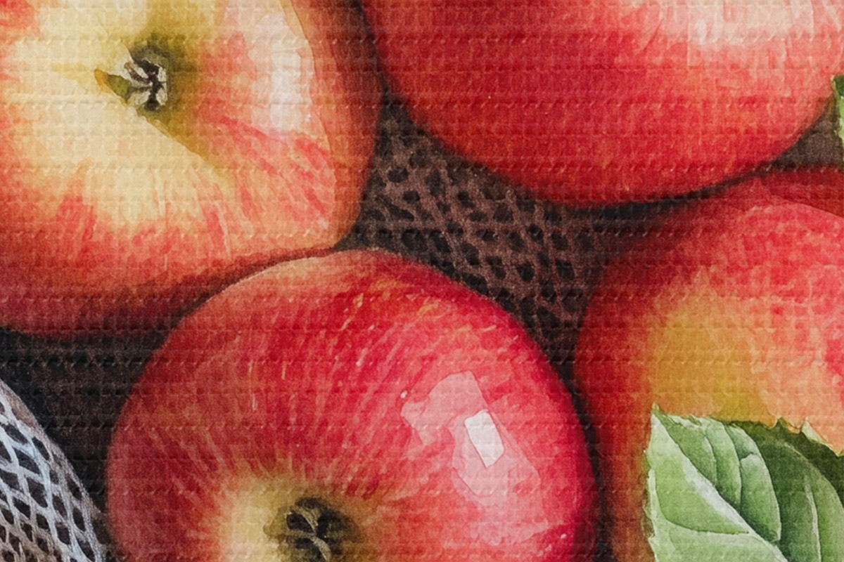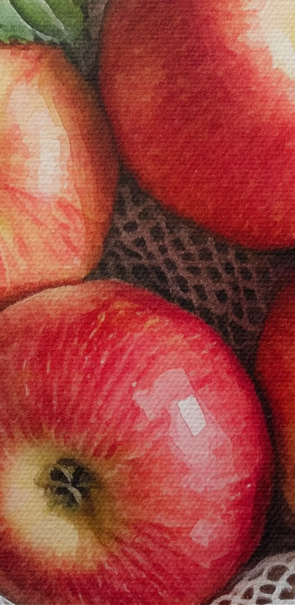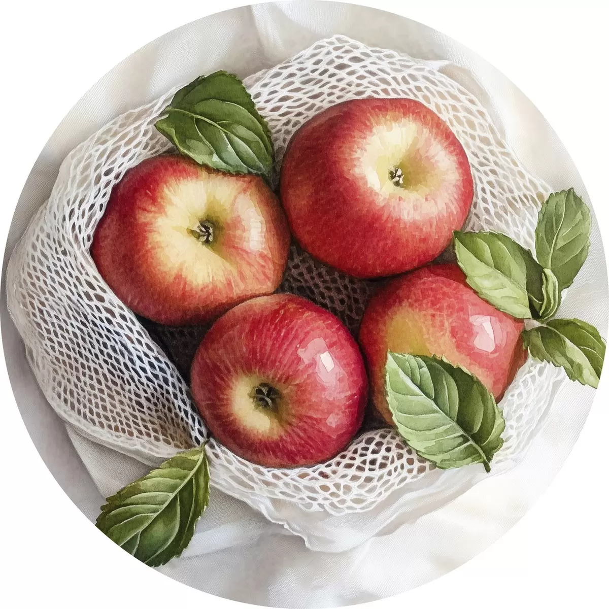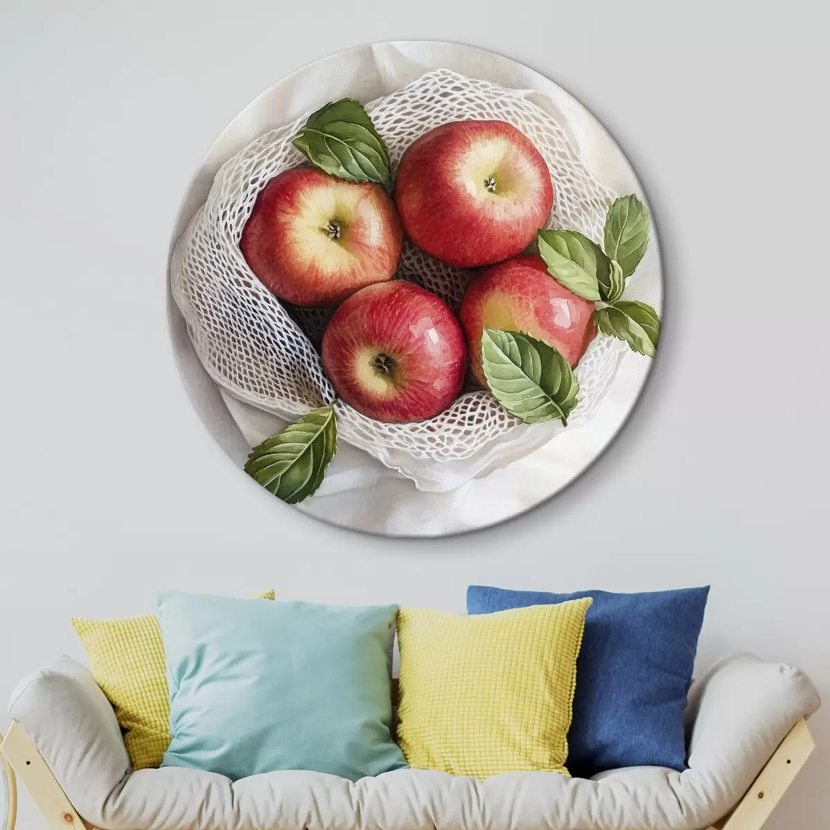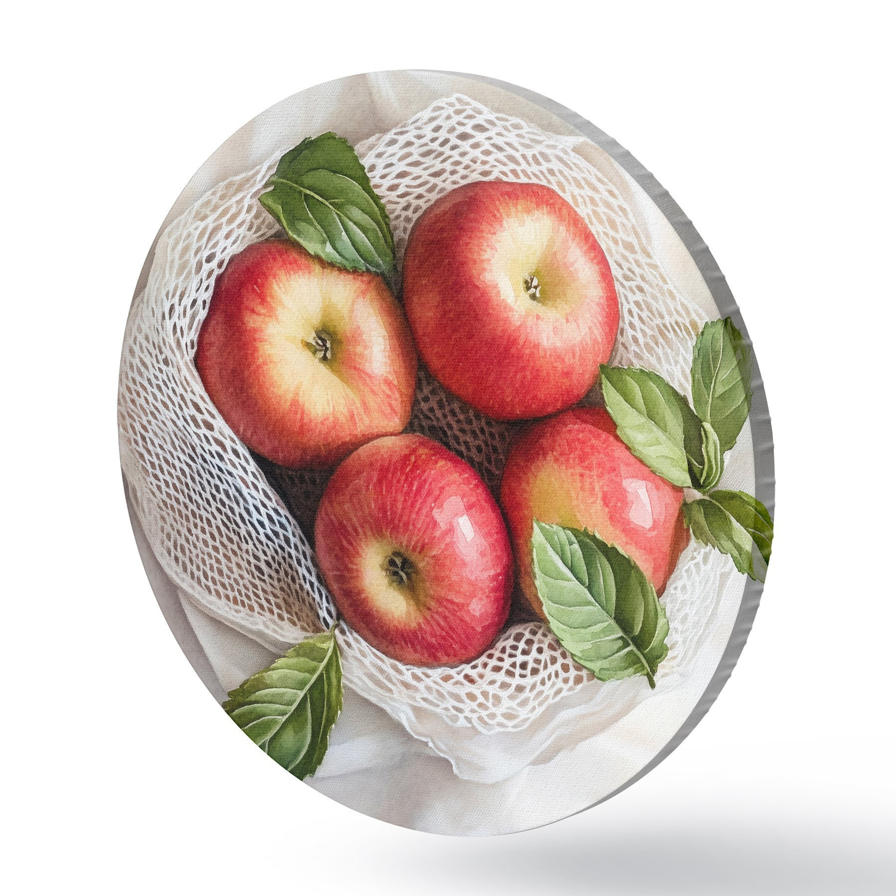 Cuadros redondos Manzanas rojas en la bolsa de lino con hojas de menta, estilo rústico, frutas r44609