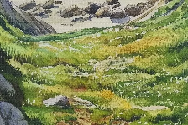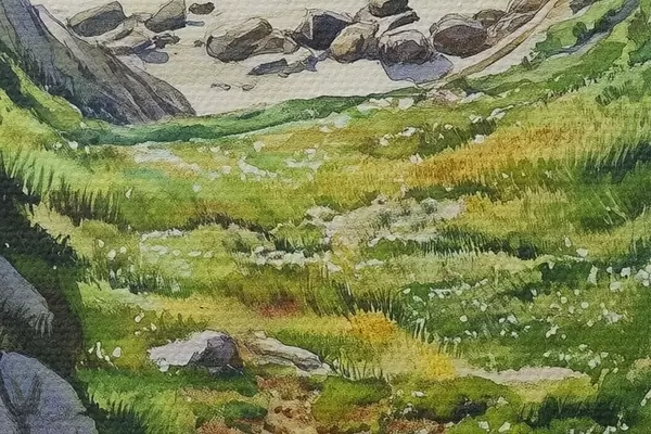 Foto Costa marina con rocas y hierba verde, estilo acuarela, verano Nr r44616