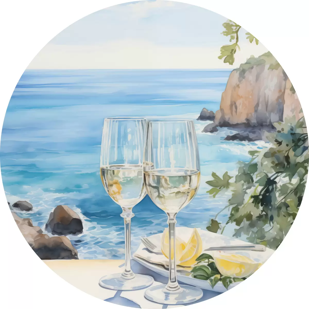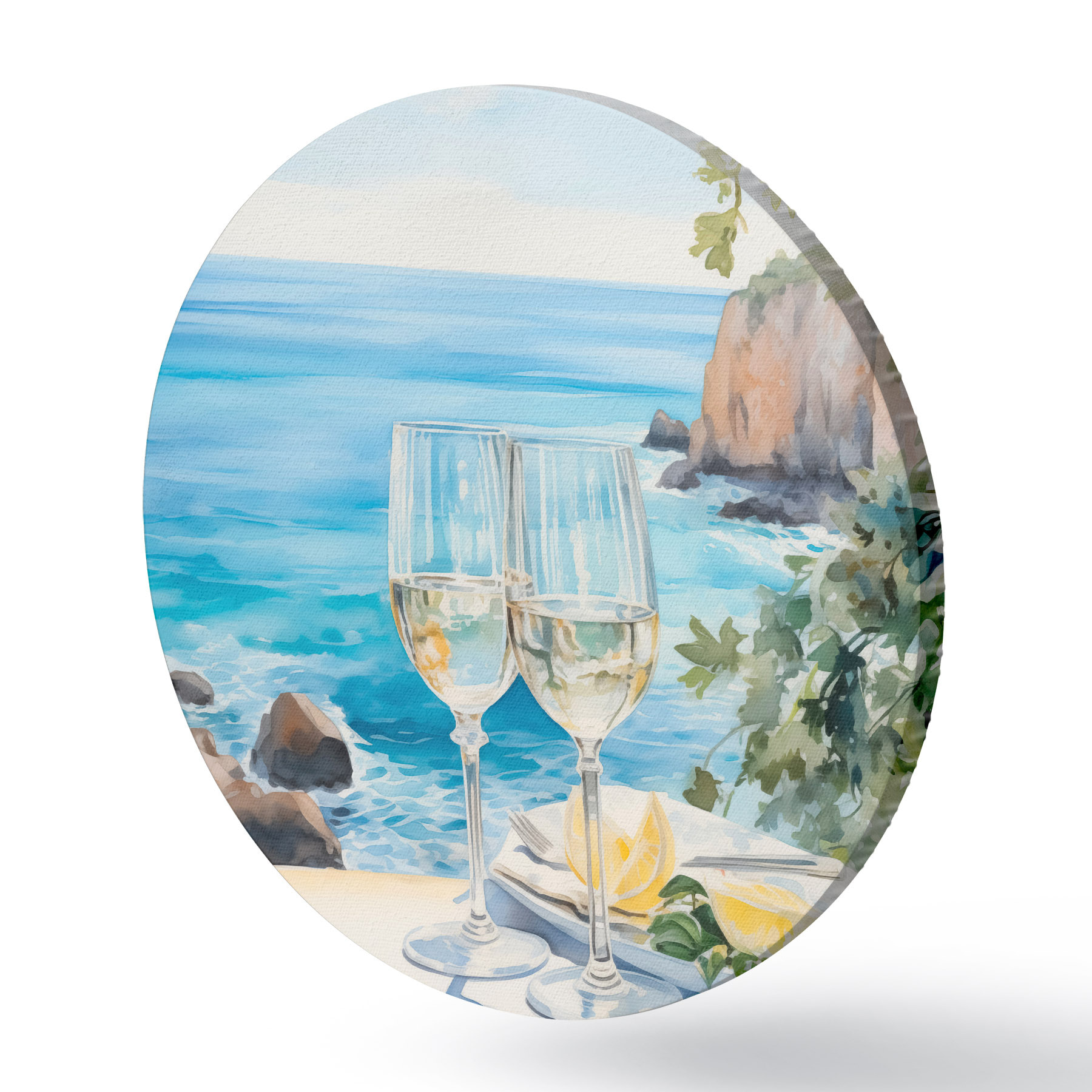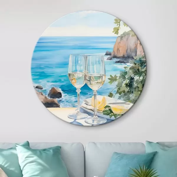 Cuadros redondos Copas de vino frente al mar r44644