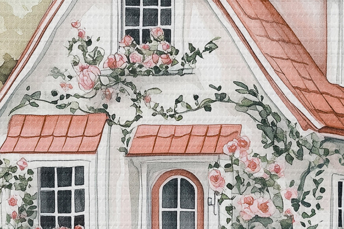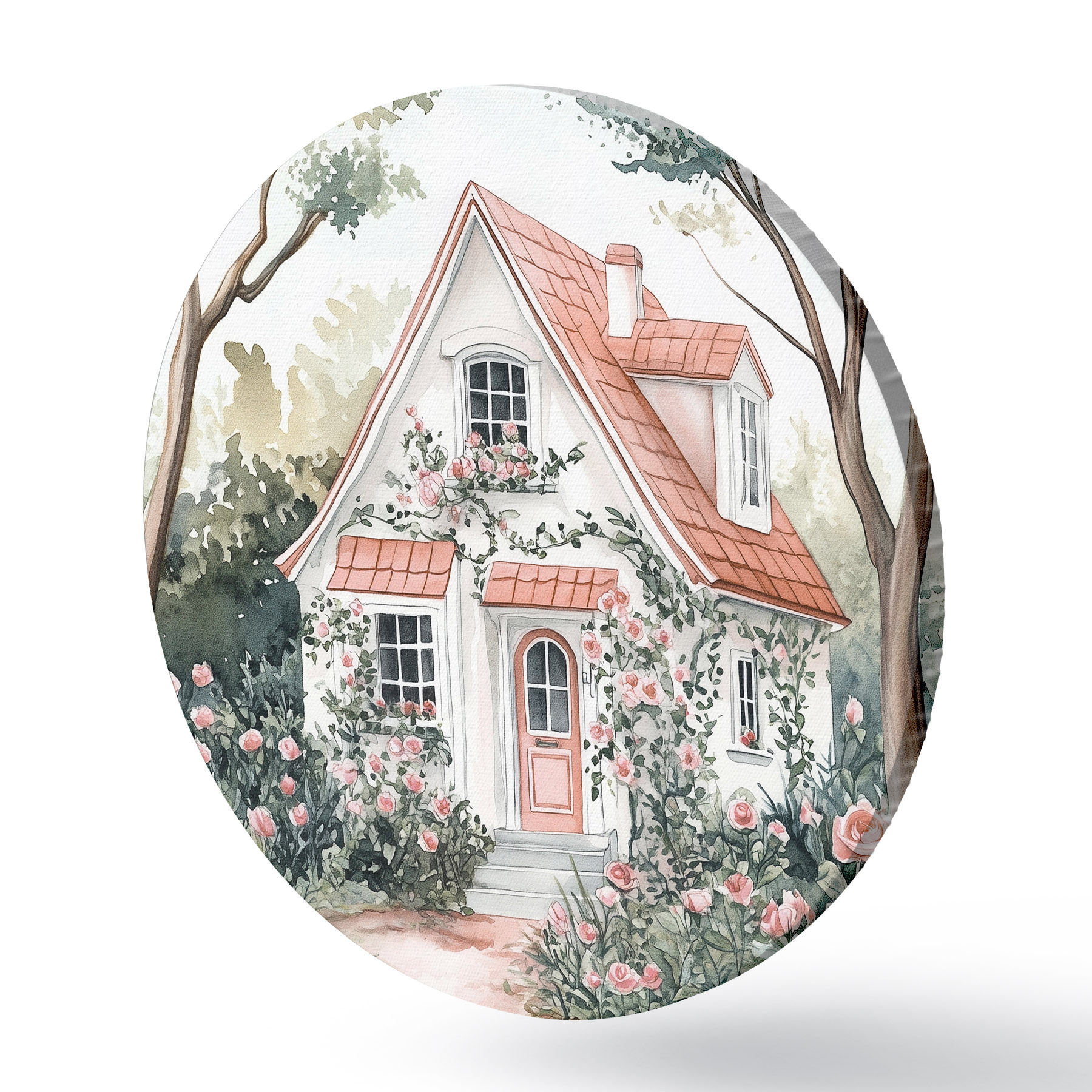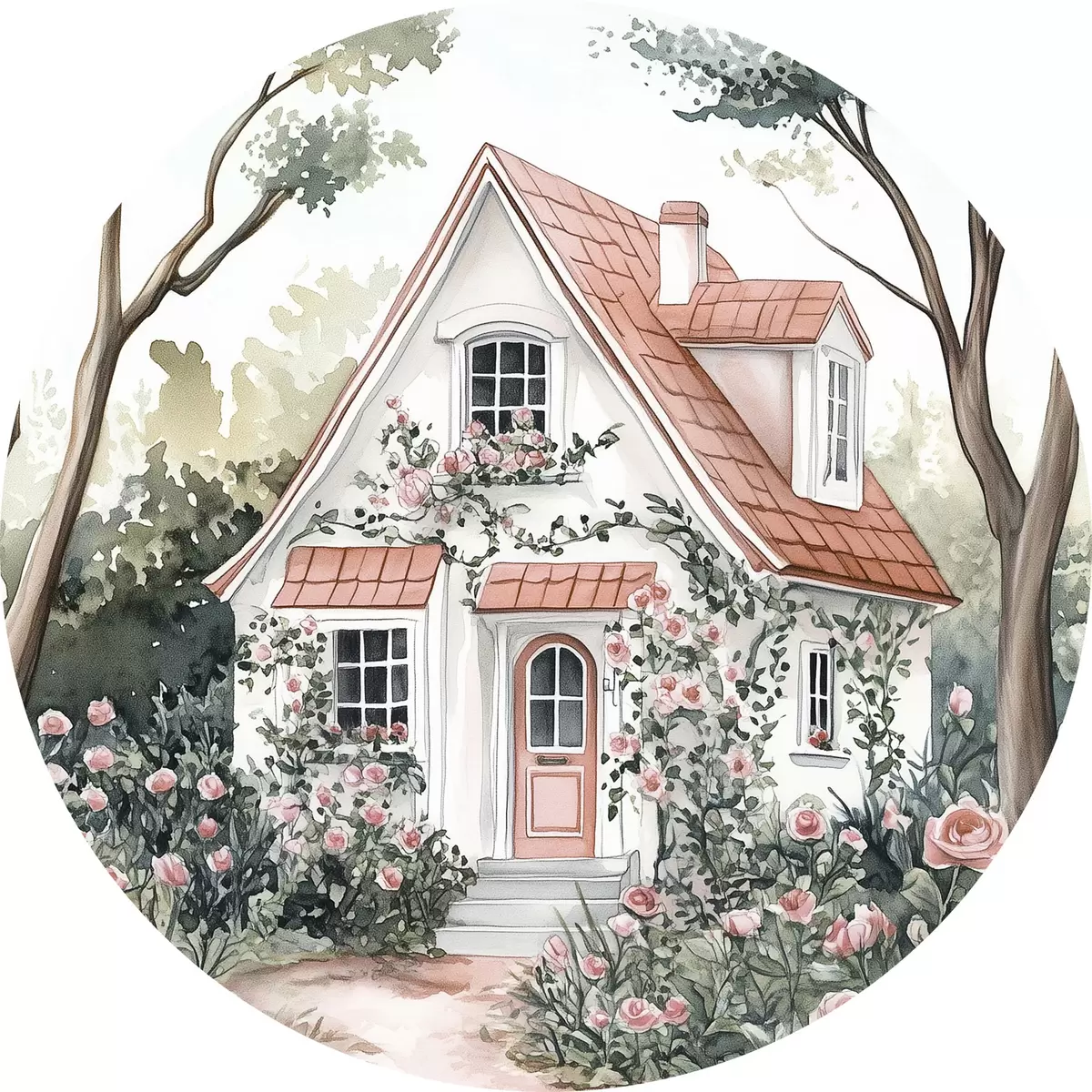 Cuadros redondos Casa blanca con jardín de rosas en el bosque r44716
