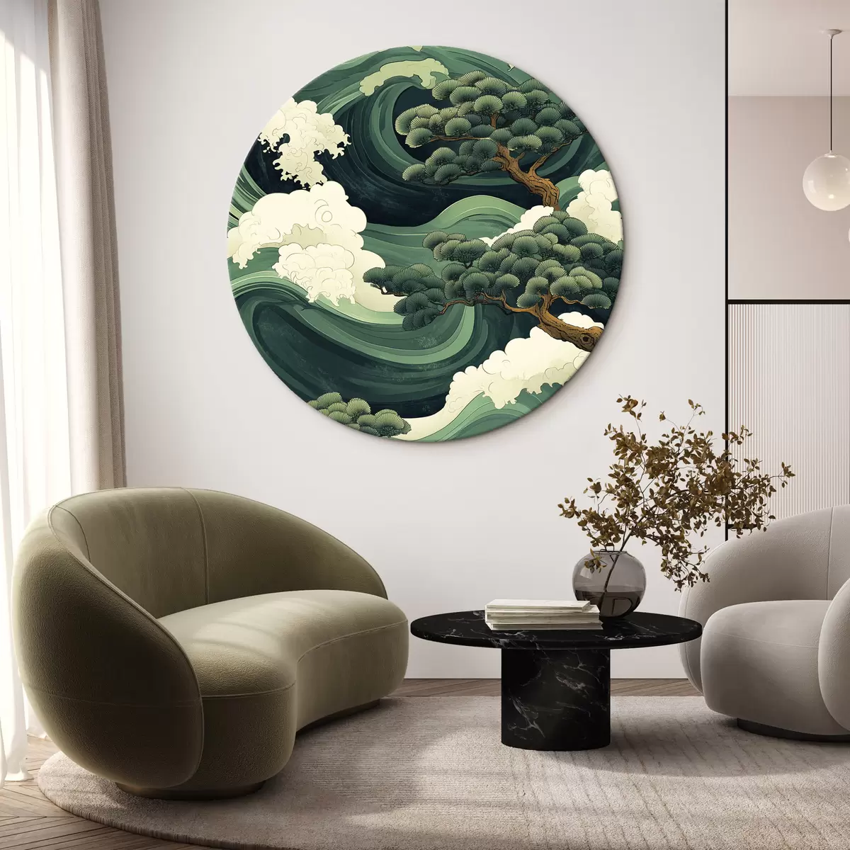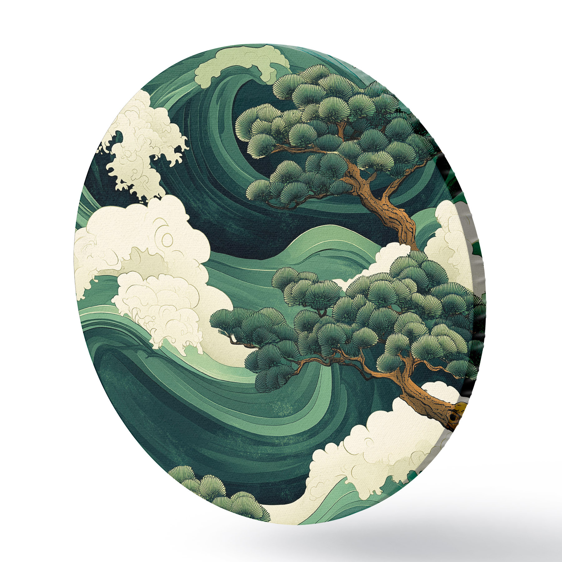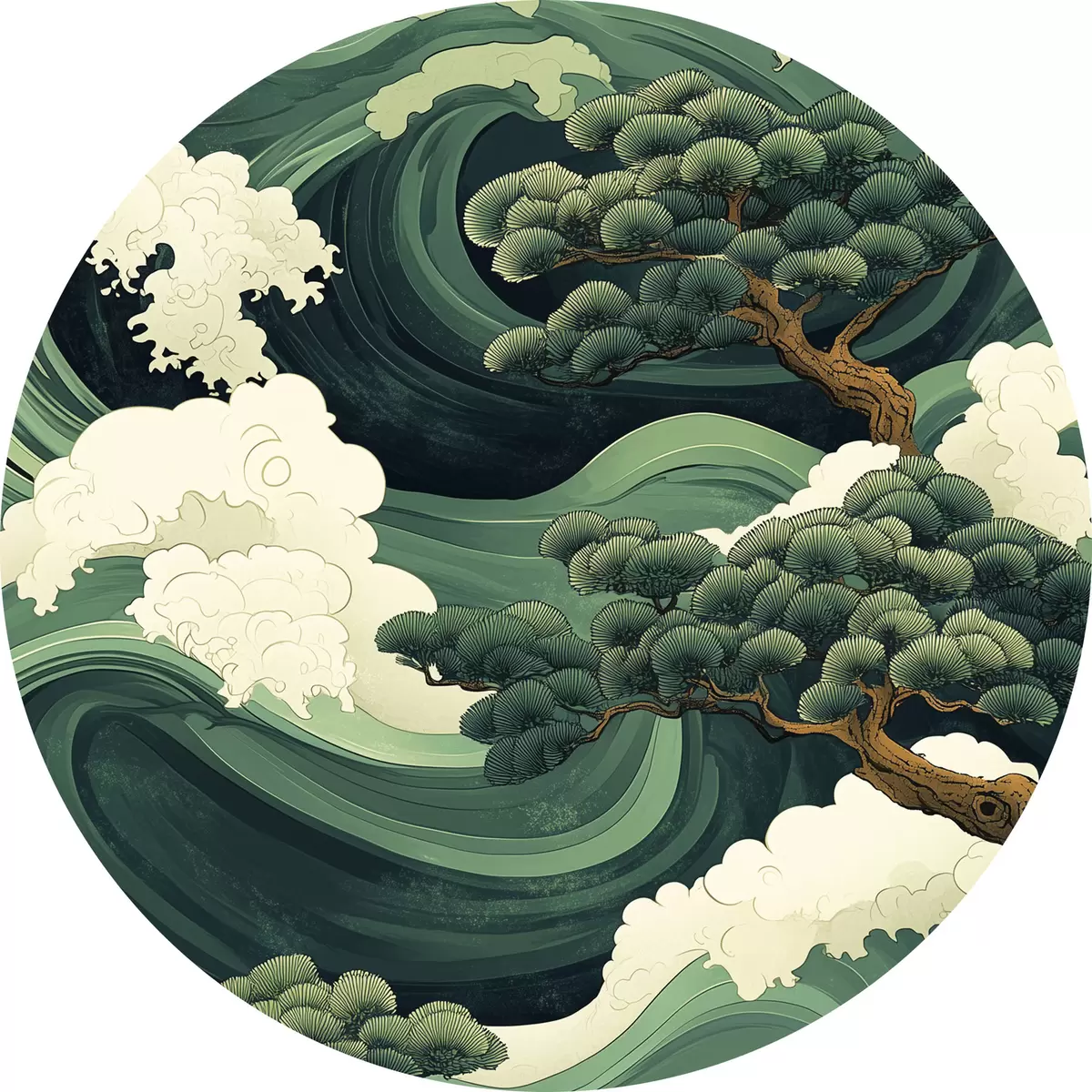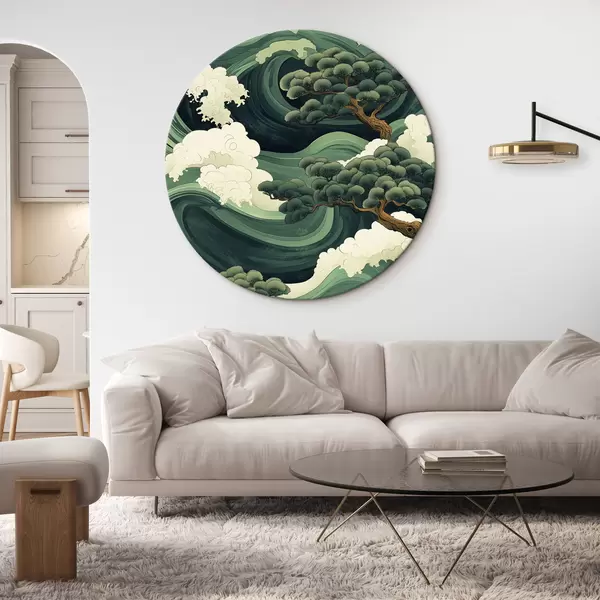 Cuadros redondos Dibujo de estilo chino con olas de mar y pinos r44719