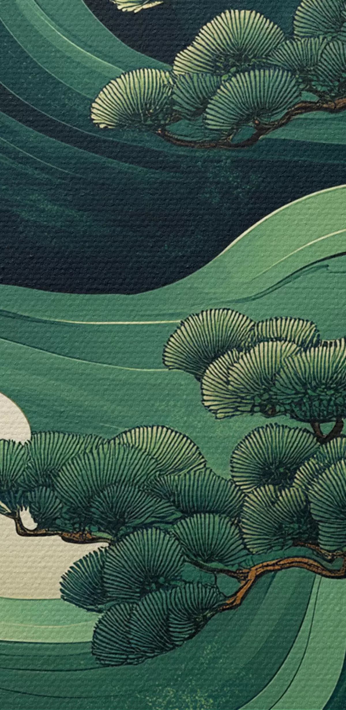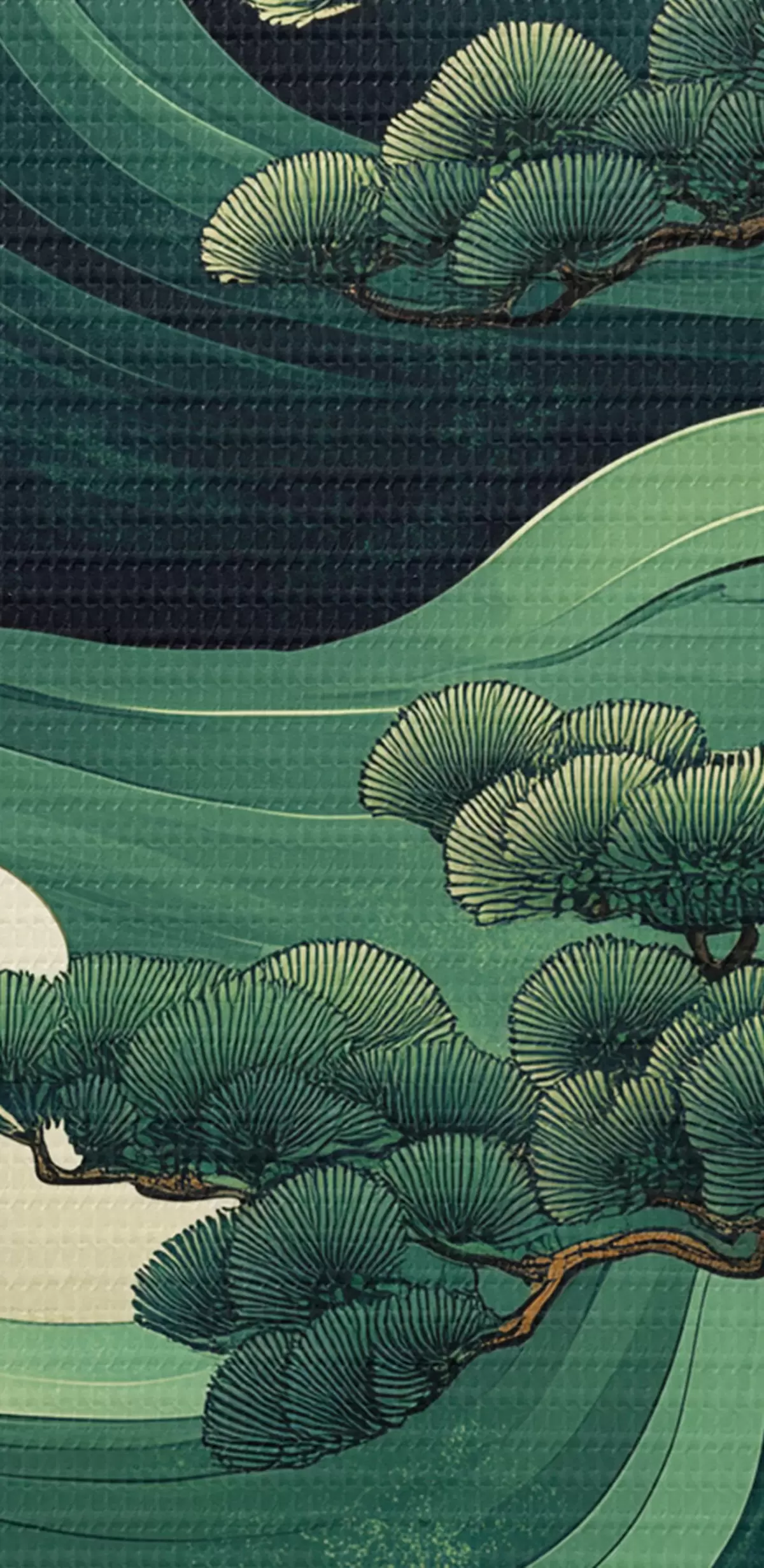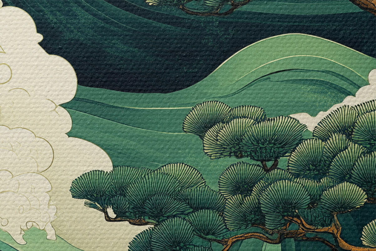 Foto Dibujo de estilo chino con olas de mar y pinos Nr r44719