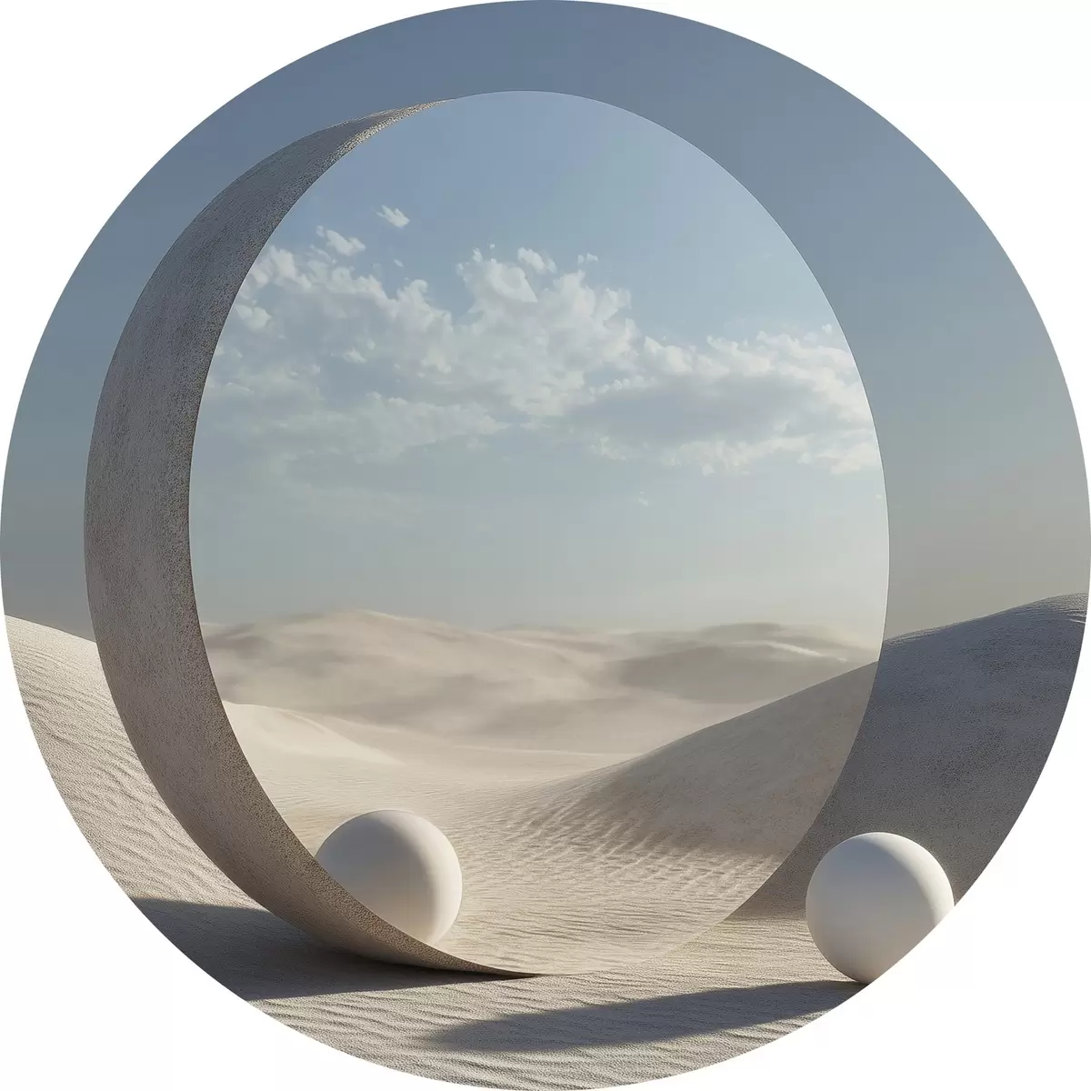 Foto Surrealista paisaje desértico con un espejo redondo que refleja el cielo y la luna Nr r44792