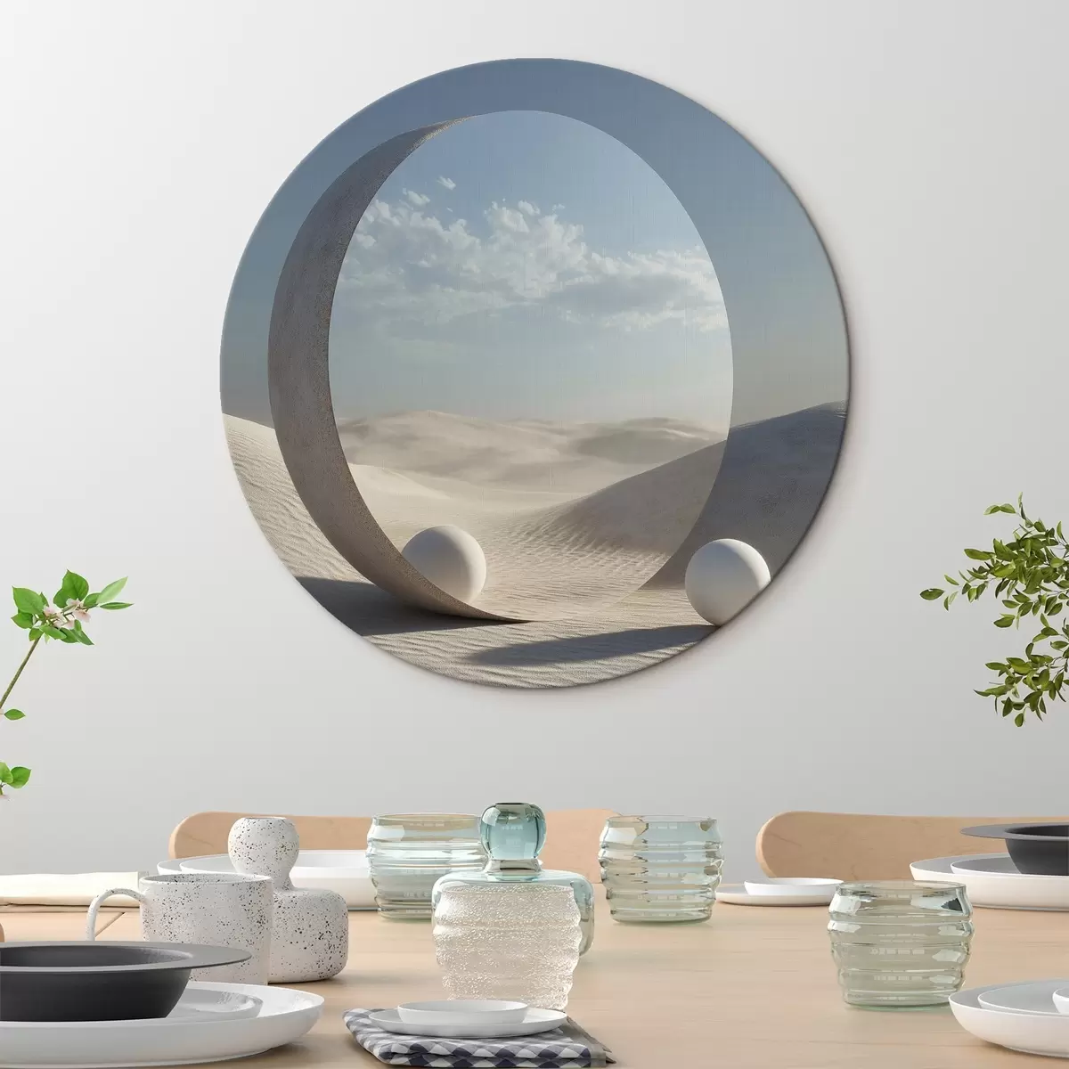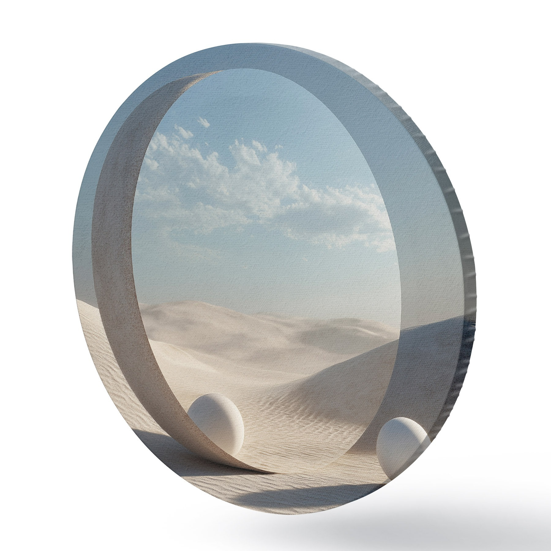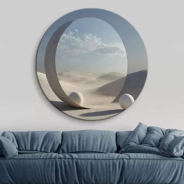 Cuadros redondos Surrealista paisaje desértico con un espejo redondo que refleja el cielo y la luna r44792