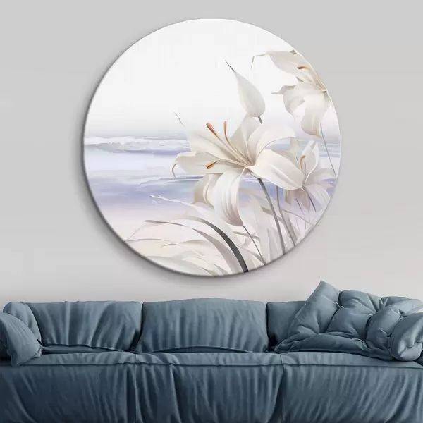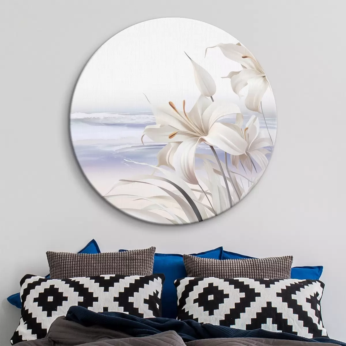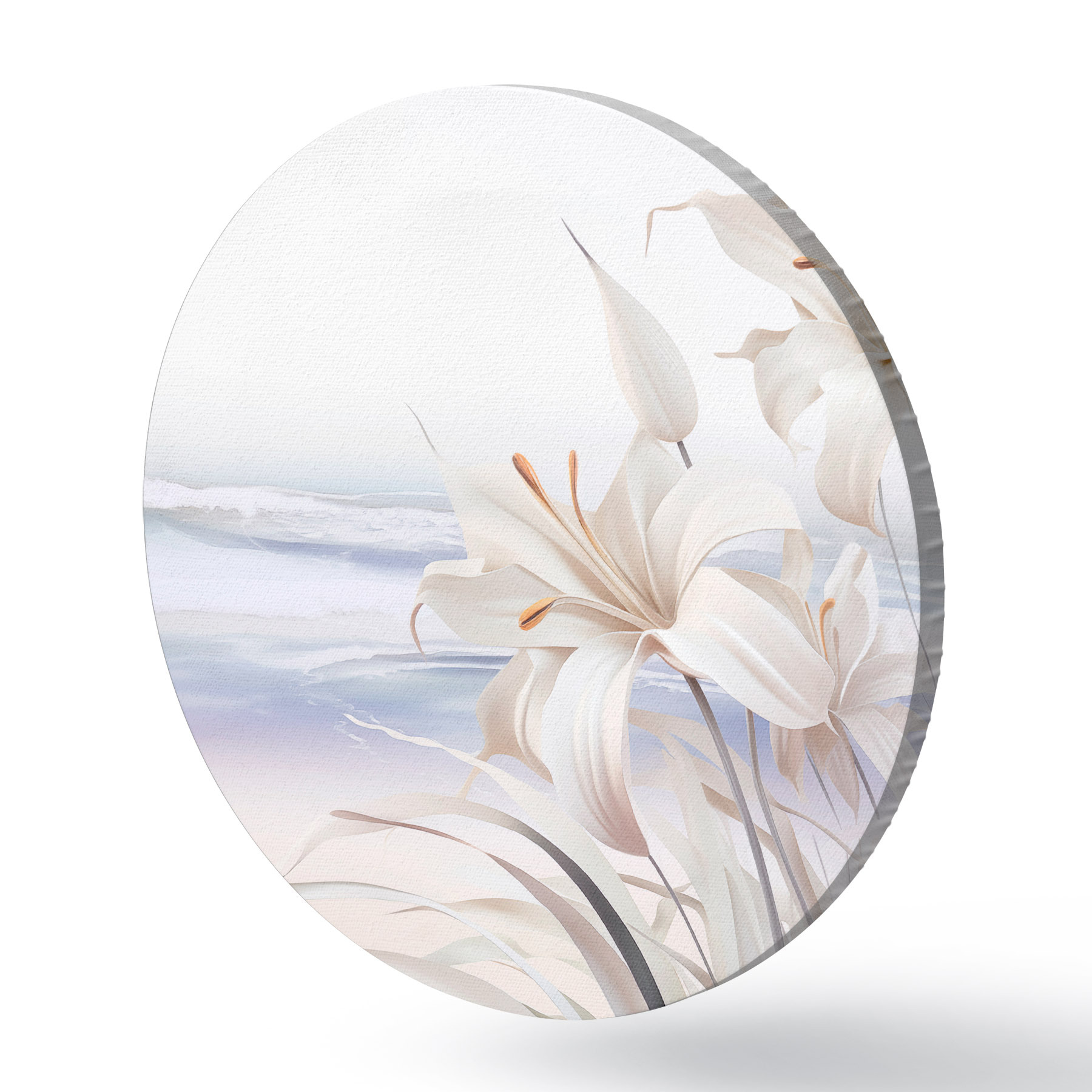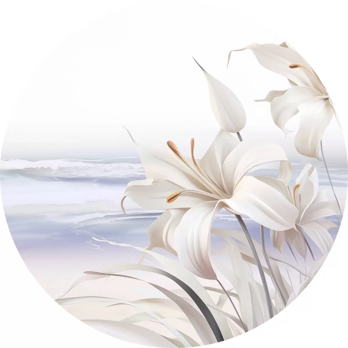 Cuadros redondos Lirios blancos con pistilos naranjas y hojas largas en una playa con suaves olas de fondo, colores pastel r44850