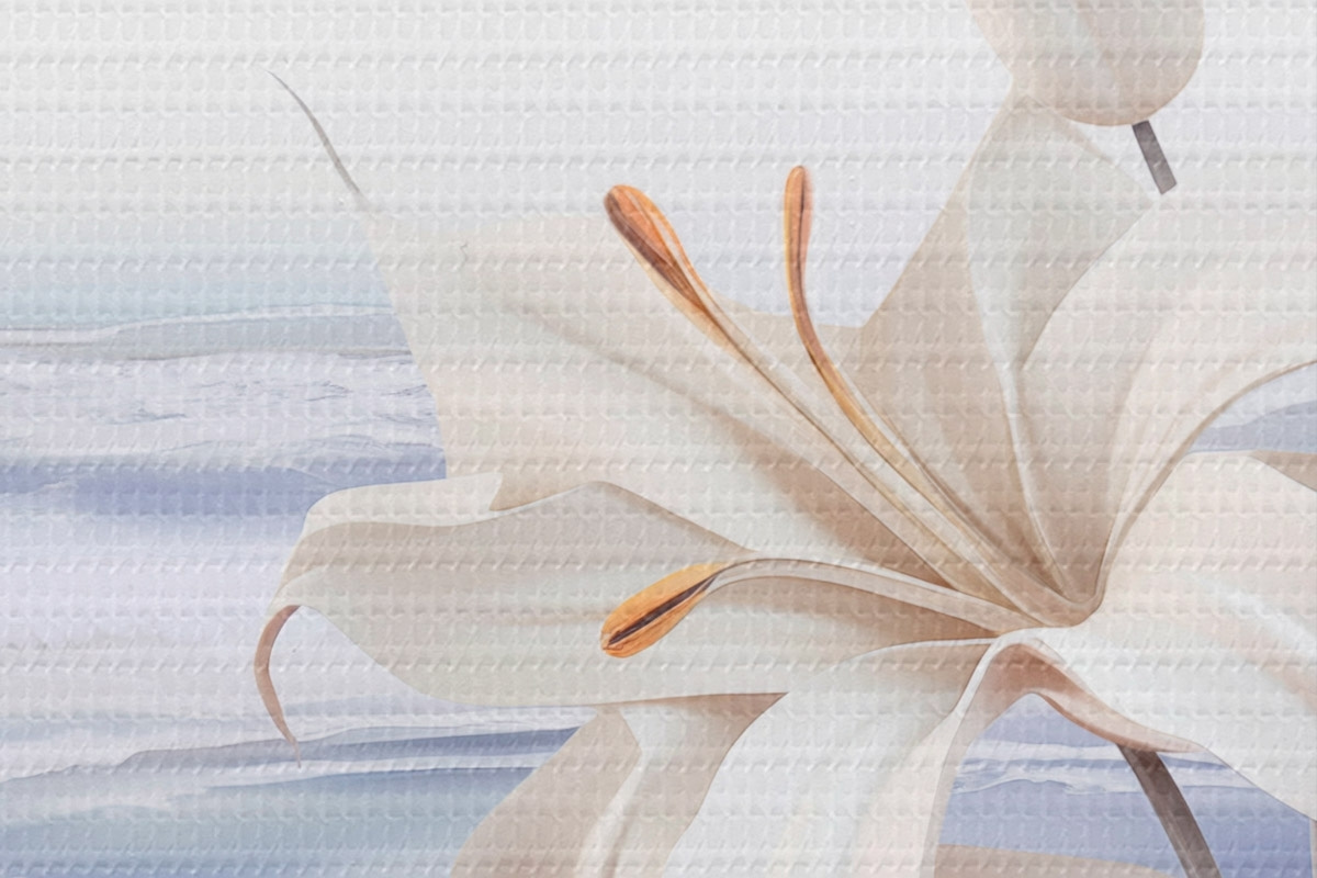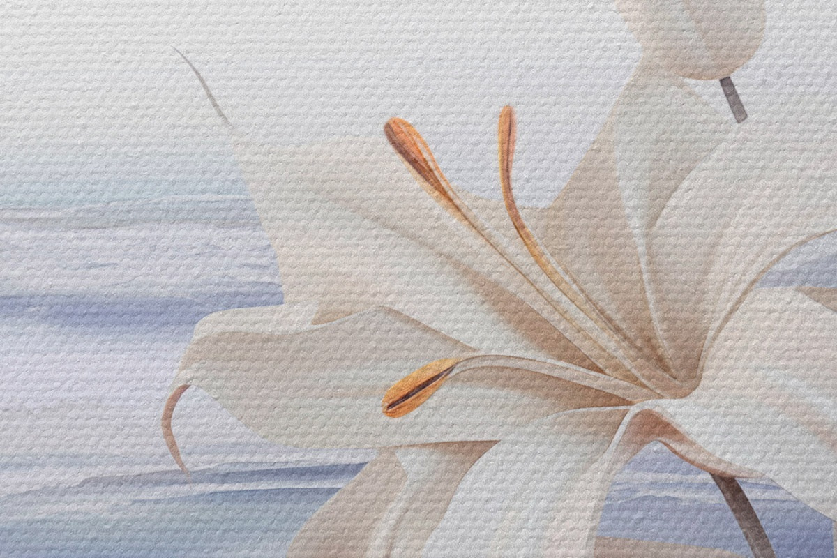 Foto Lirios blancos con pistilos naranjas y hojas largas en una playa con suaves olas de fondo, colores pastel Nr r44850